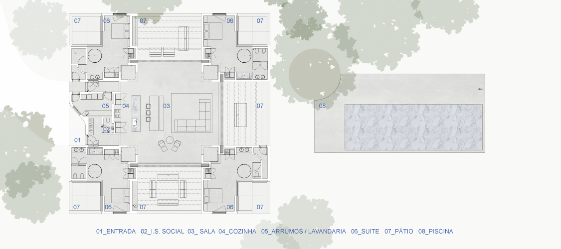 그래서 집은 정사각혀에 각 모서리에 독립된 객실이 있는 게스트하우스 같은 집이 되었습니다.