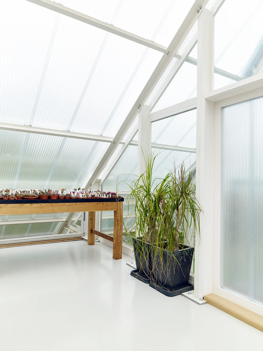 외관부터 온실의 느낌을 받을 수 있도록 지붕쪽이 반투명 폴리카보네이트로 되어있습니다.