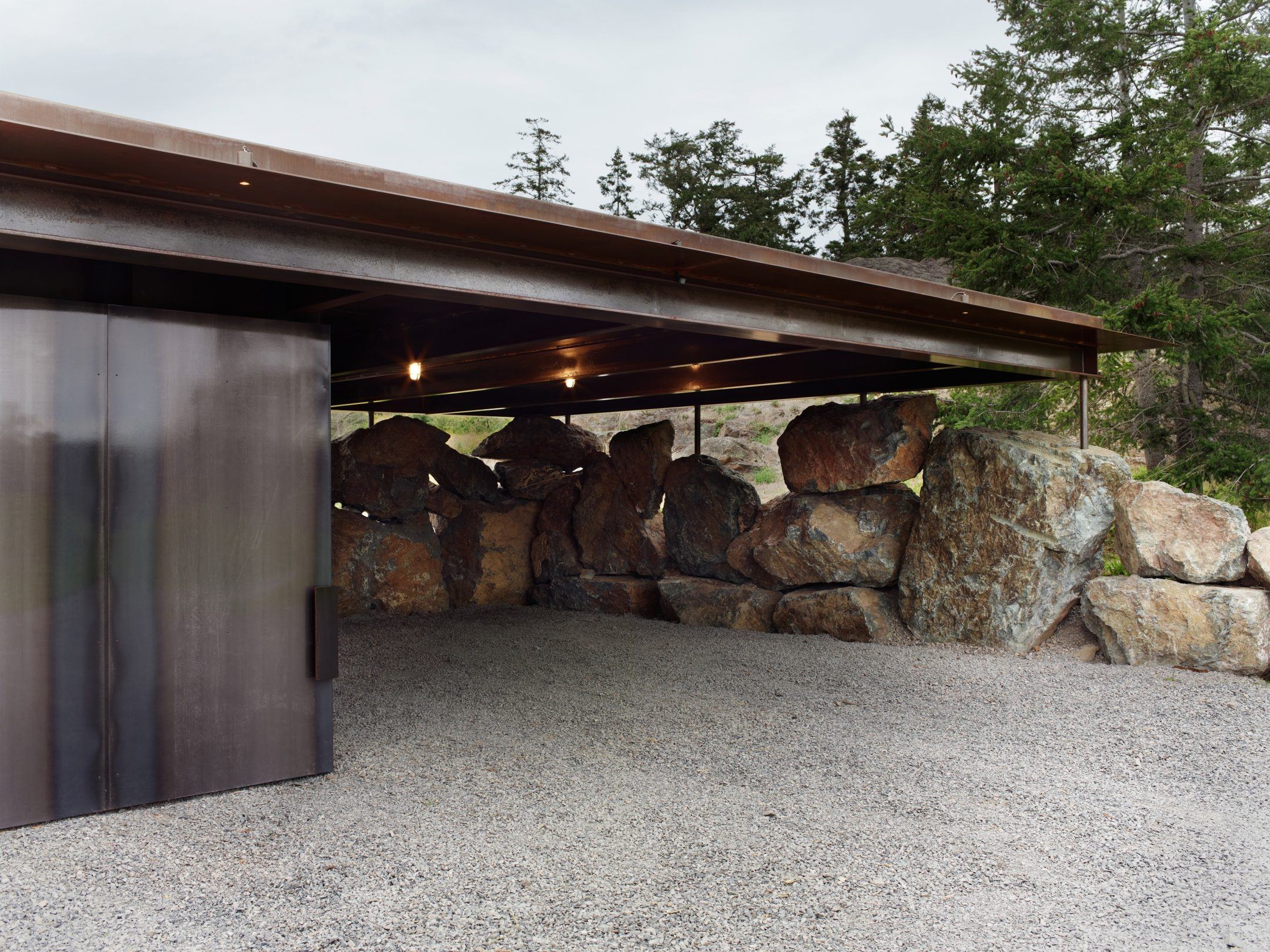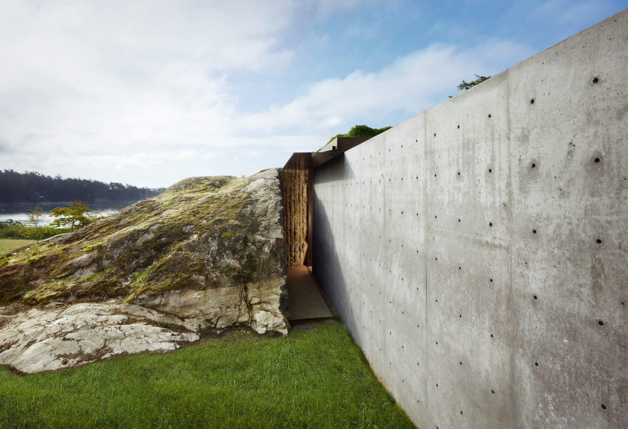 외부는 특별한 마감대신 바위와 잘 어울리는 노출 콘크리트를 사용하고