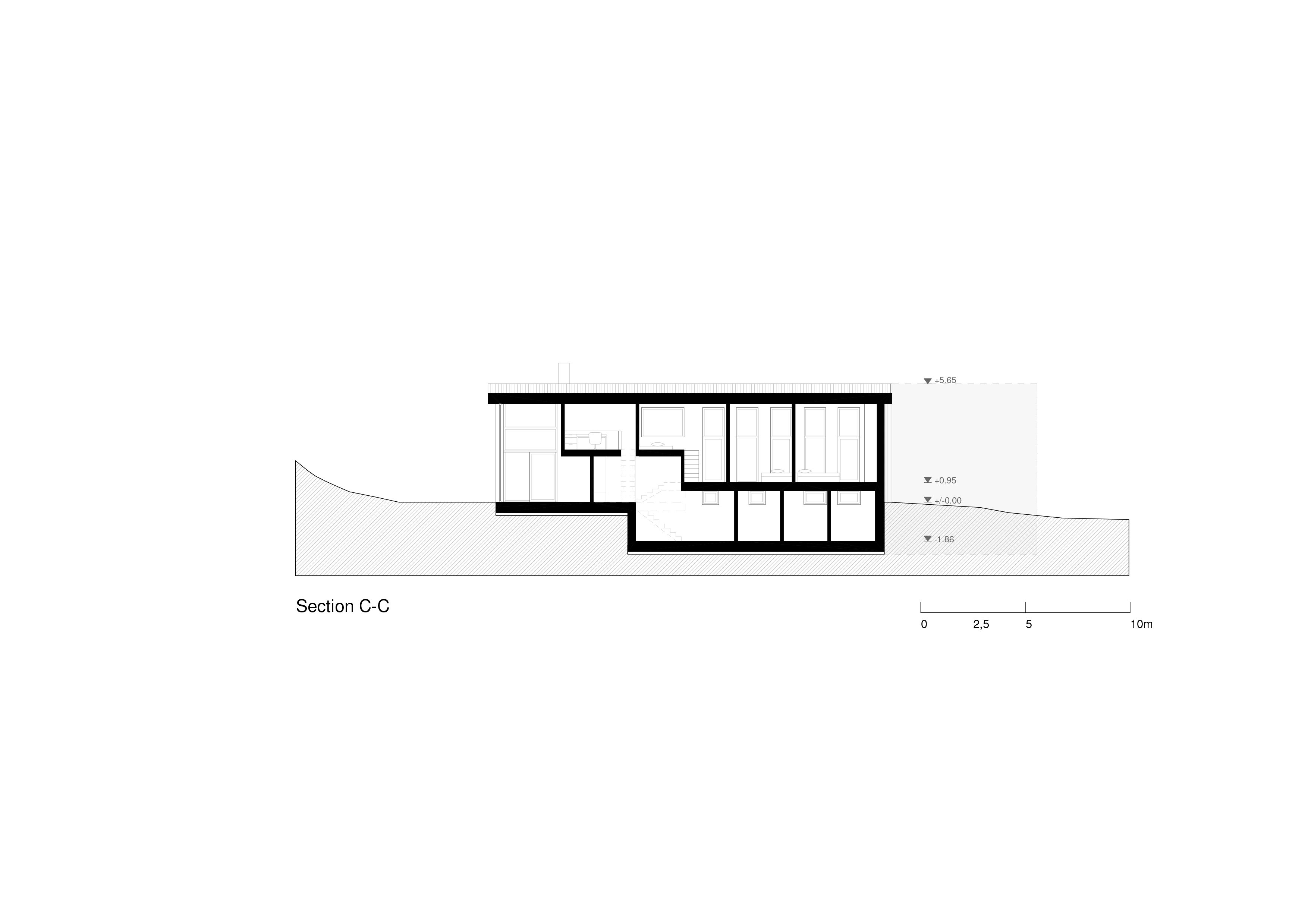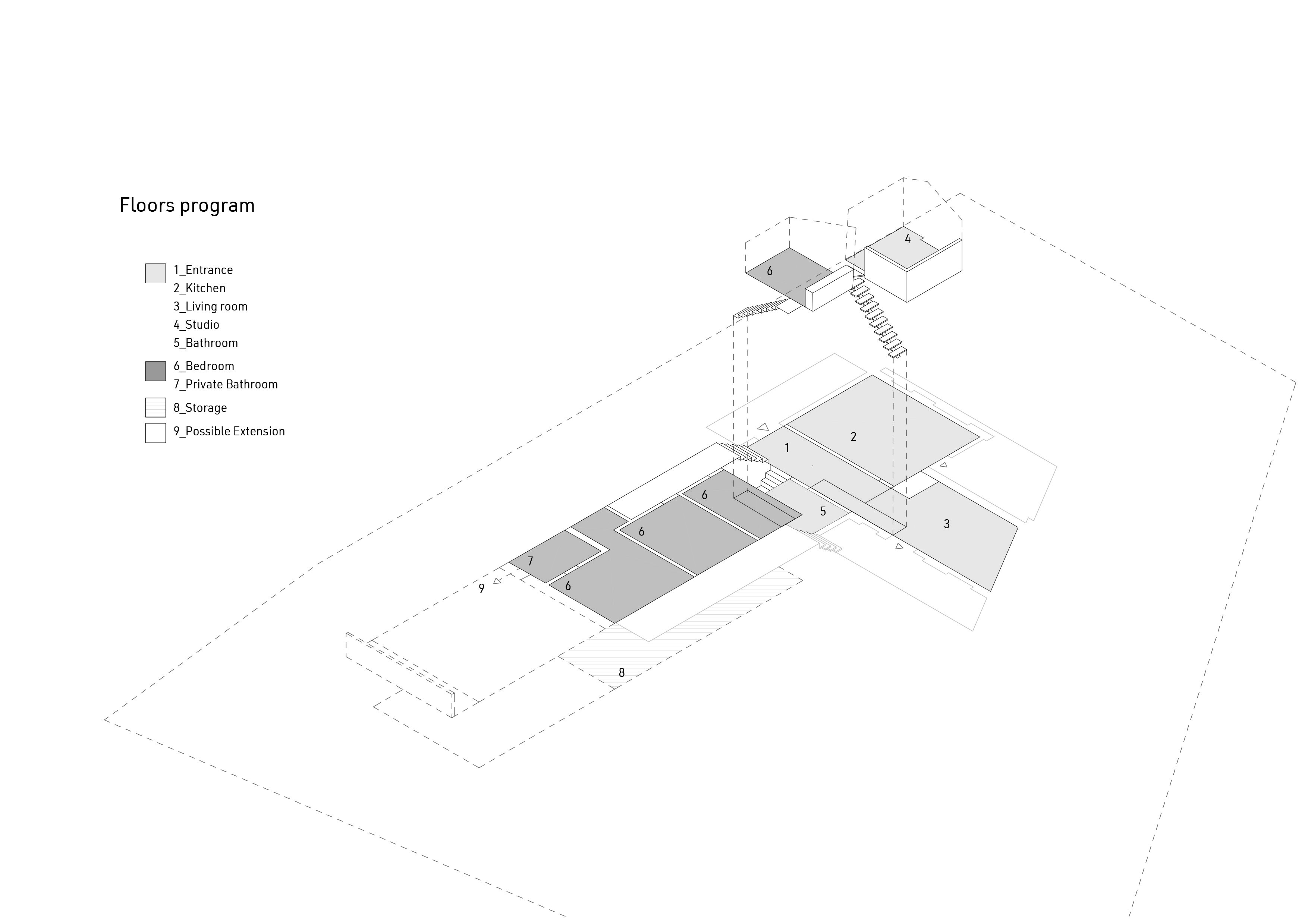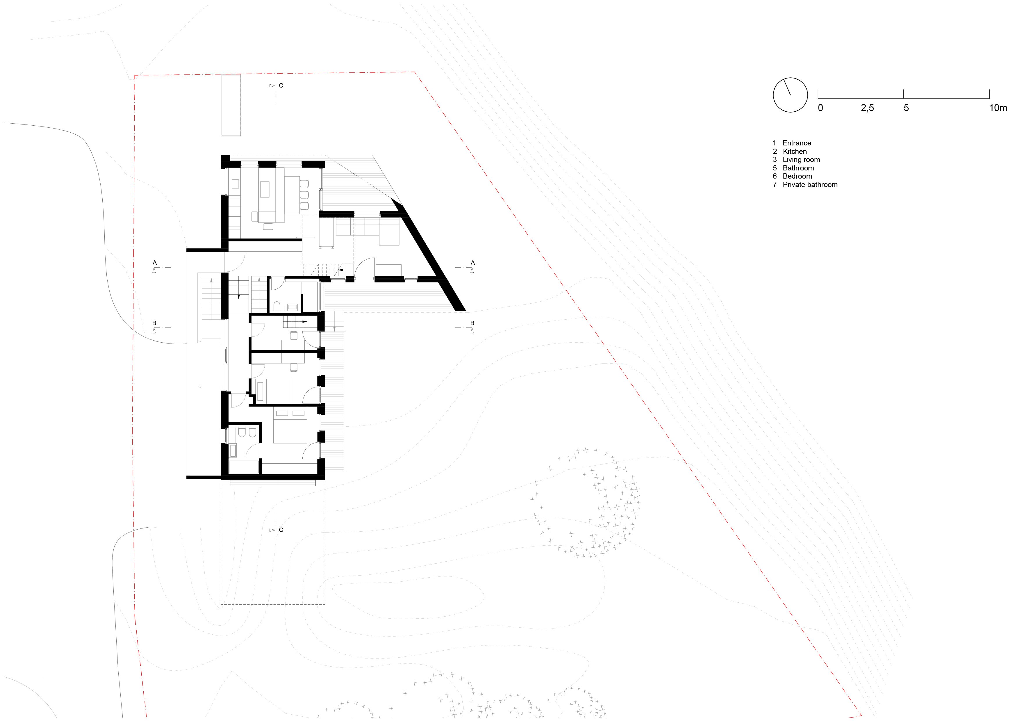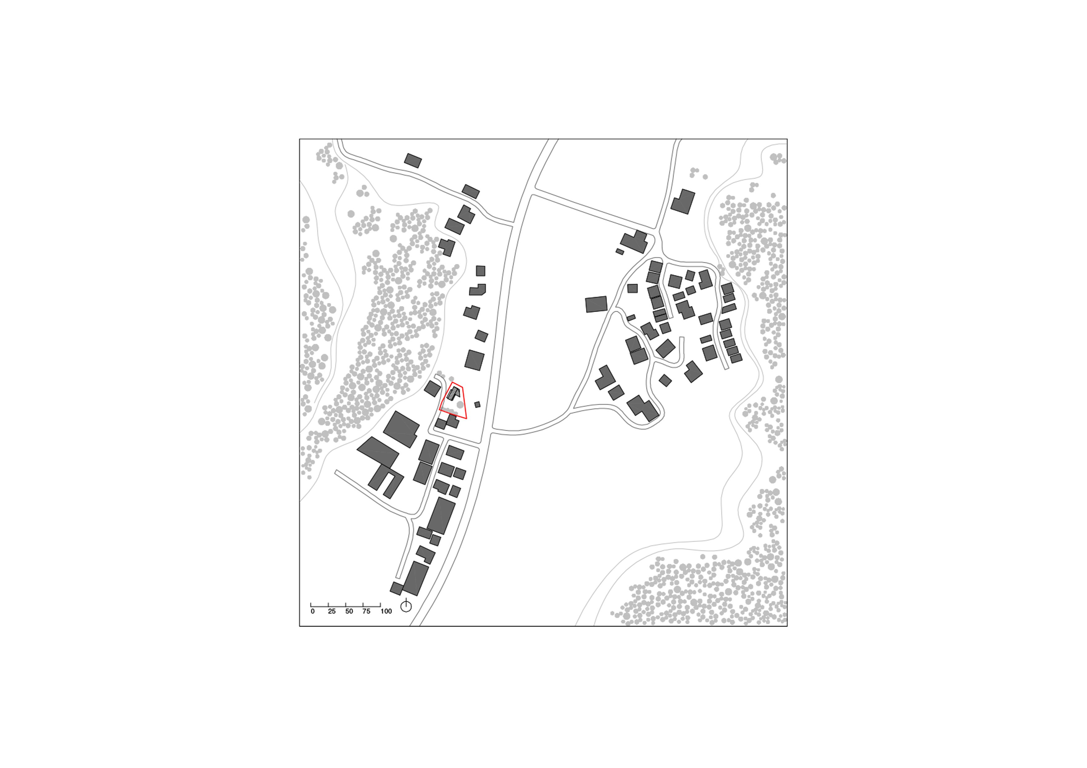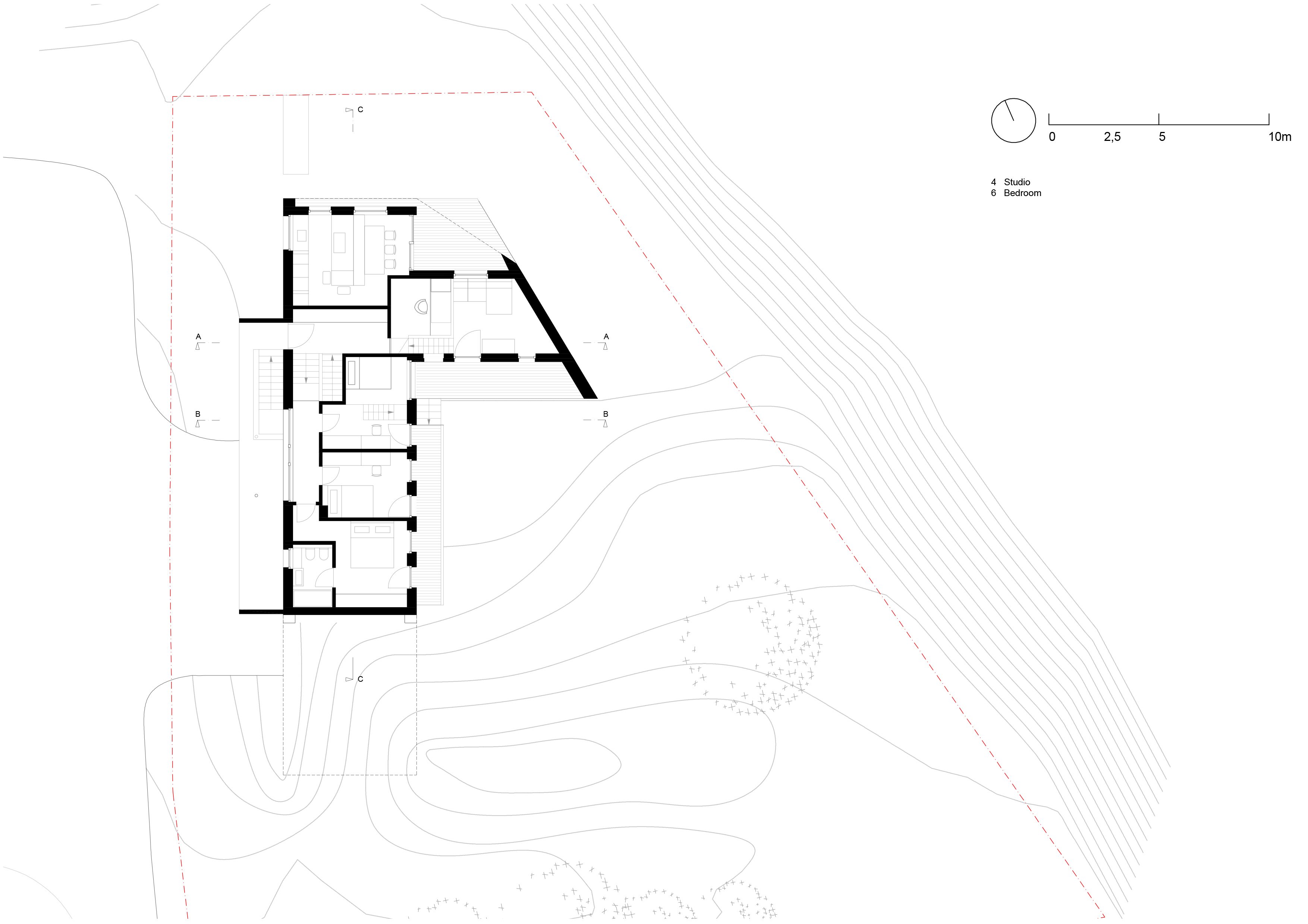 대지 가운데에 전나무를 중심으로 방향성을 잡아 지어진 이탈리아의 주택입니다.