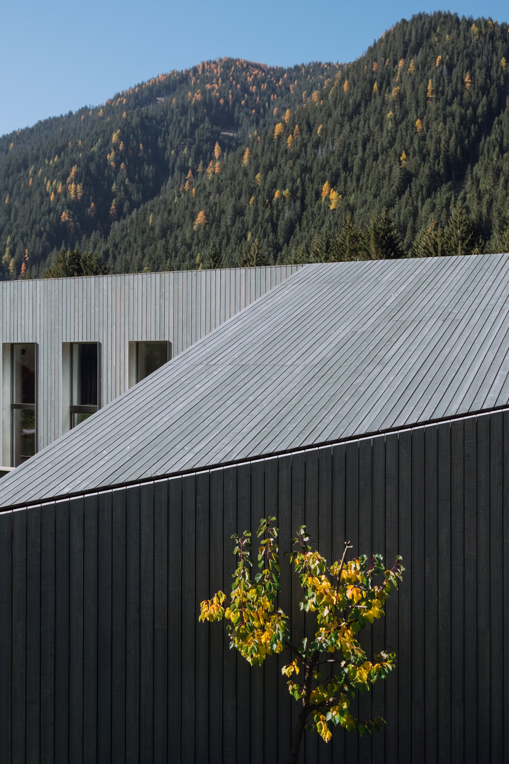 외관은 어두운 톤의 낙엽송을 세로 방향으로 가지런히 배열하였으며