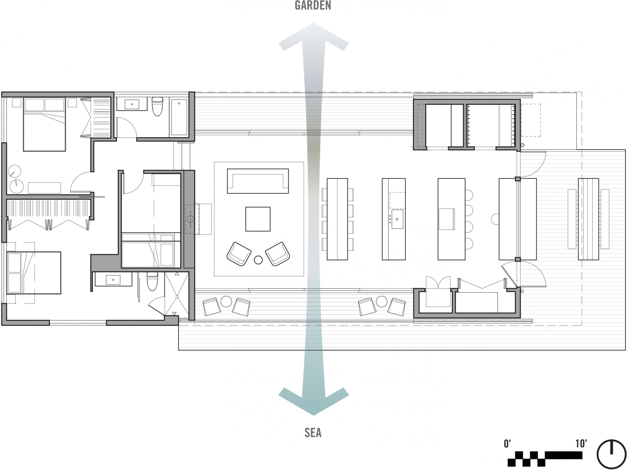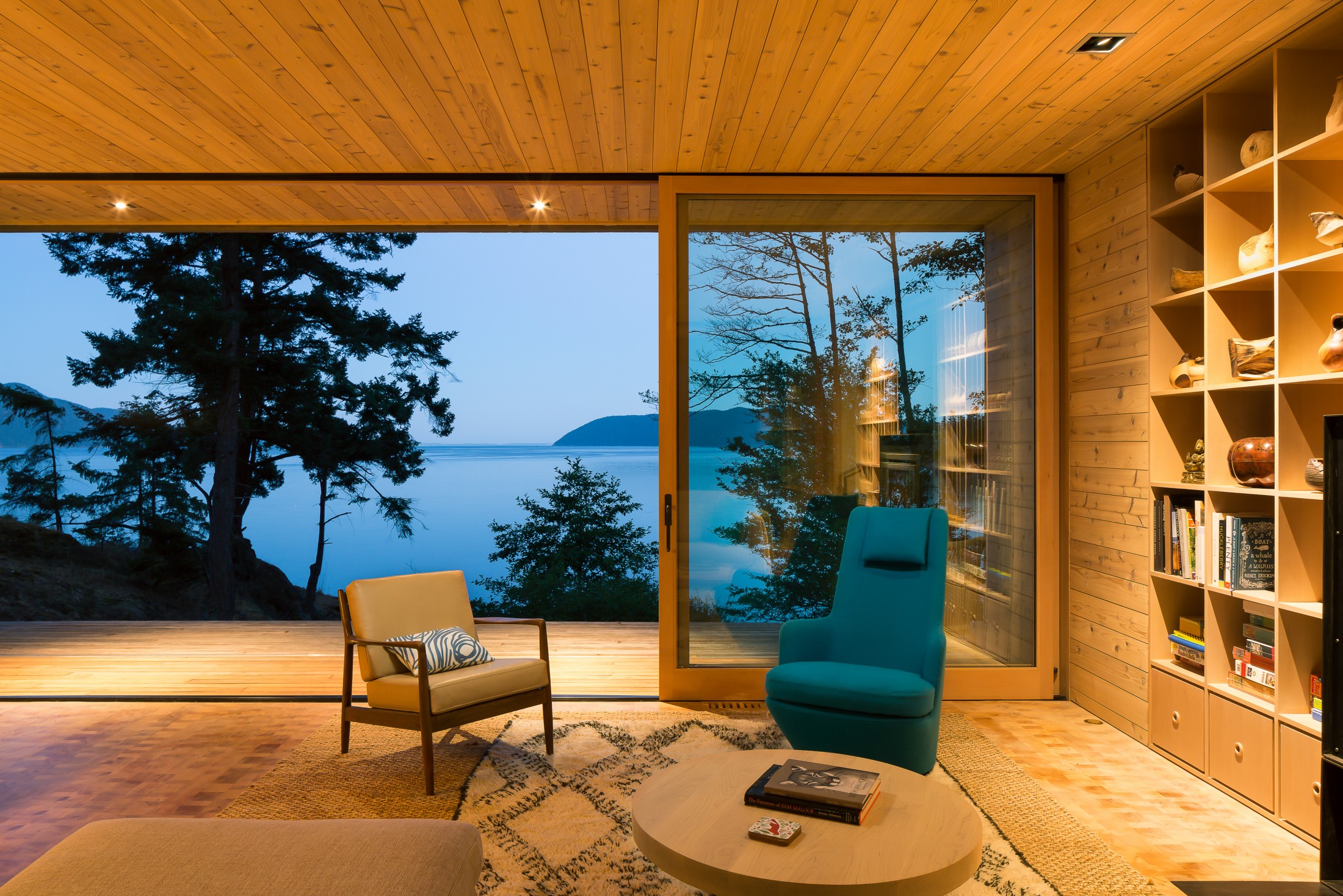 거실의 앞뒷면에 리프트 슬라이딩 방식의 도어 시스템을 적용하여 자연의 일부처럼 바람이 드나듭니다.