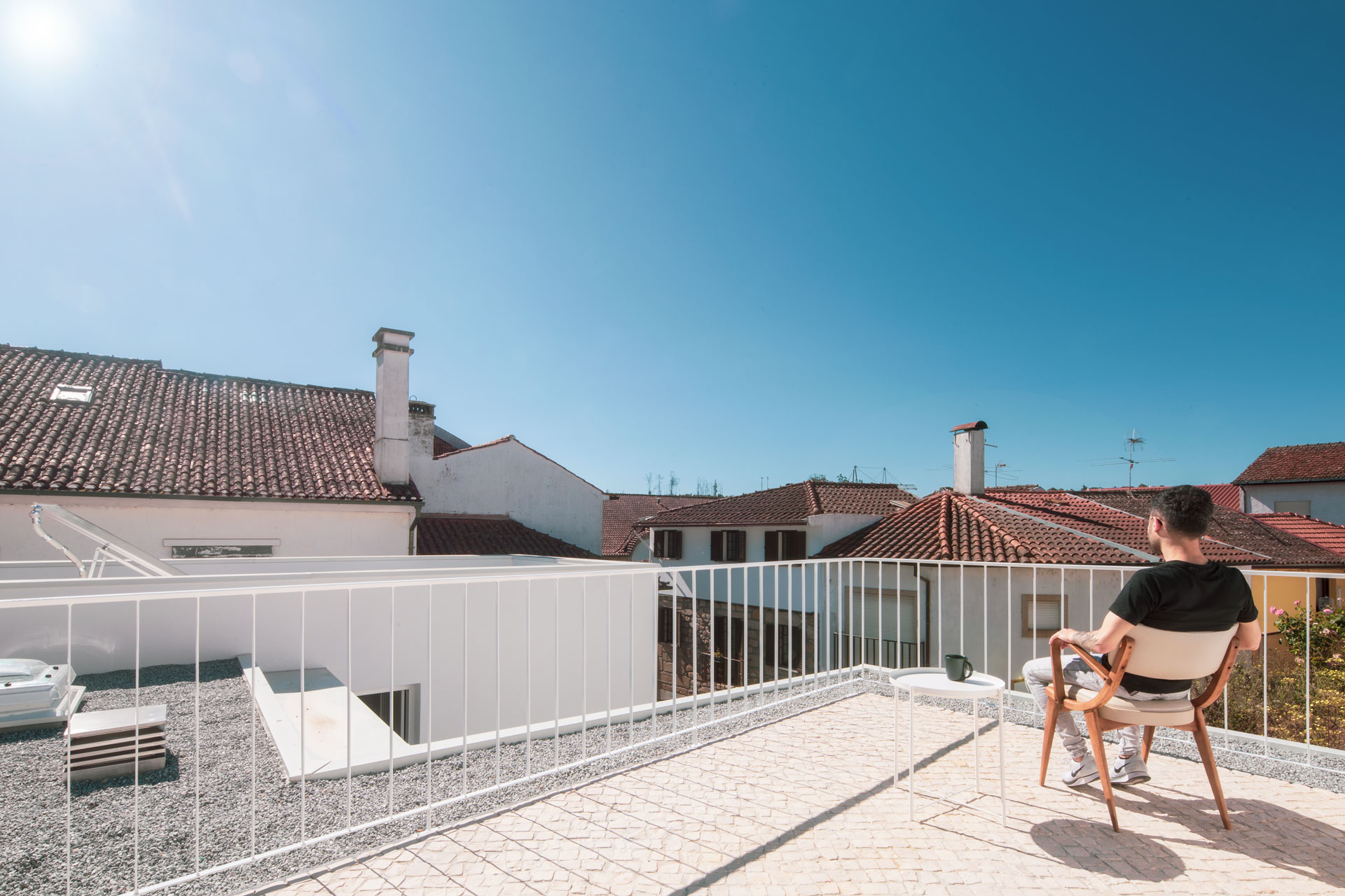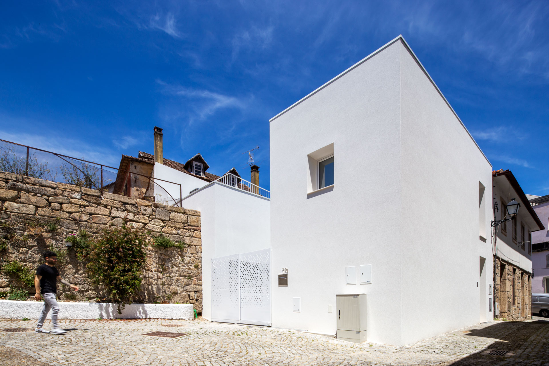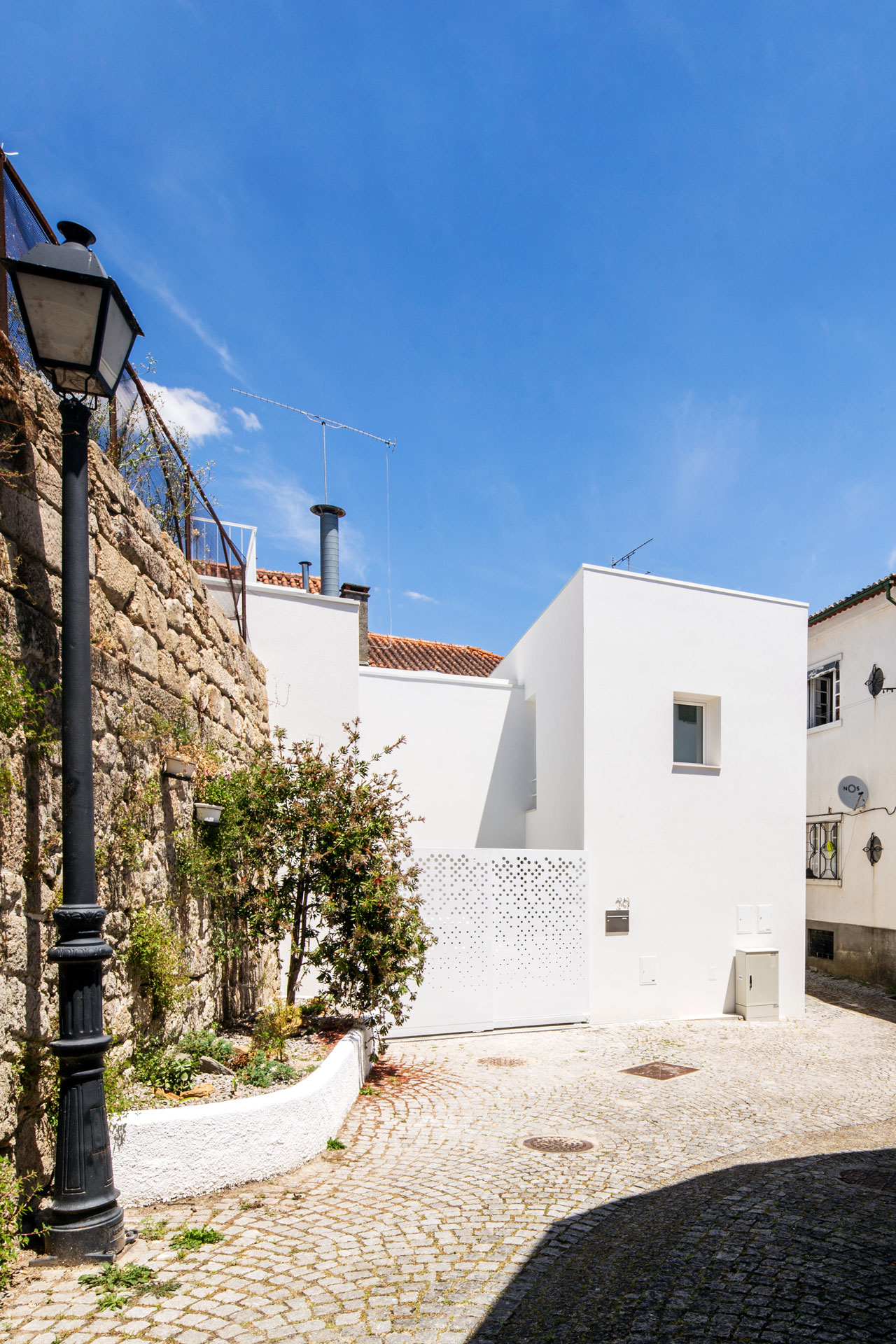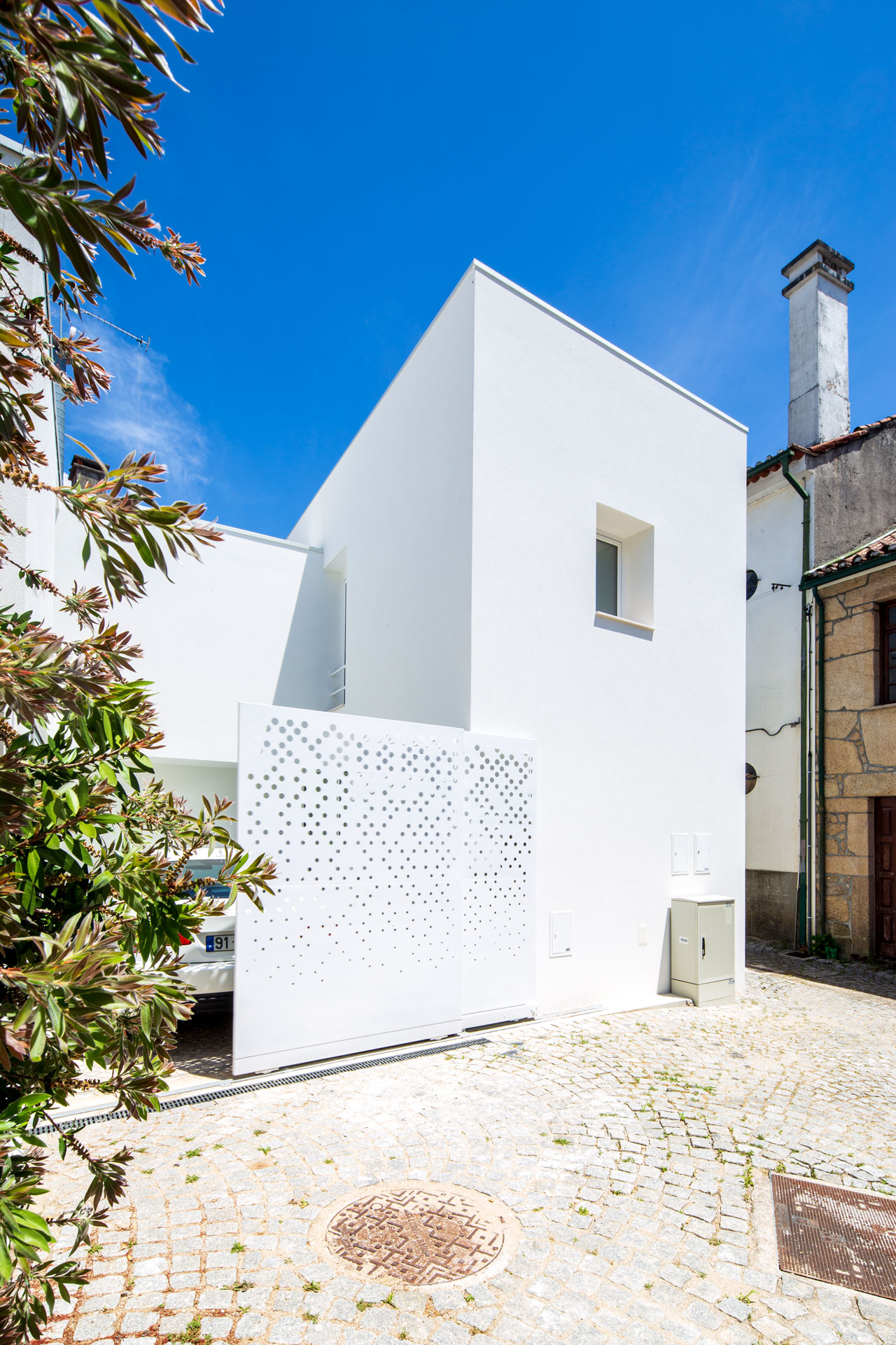 붉은 기와 지붕들이 빼곡히 들어선 포르투갈 소도시 중심가에 위치한 화이트 톤의 모던 주택입니다.