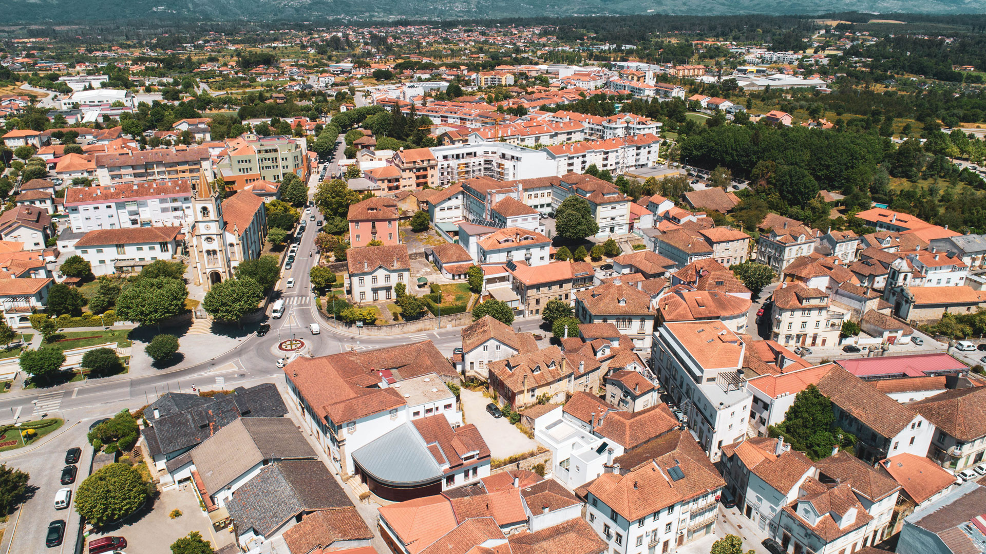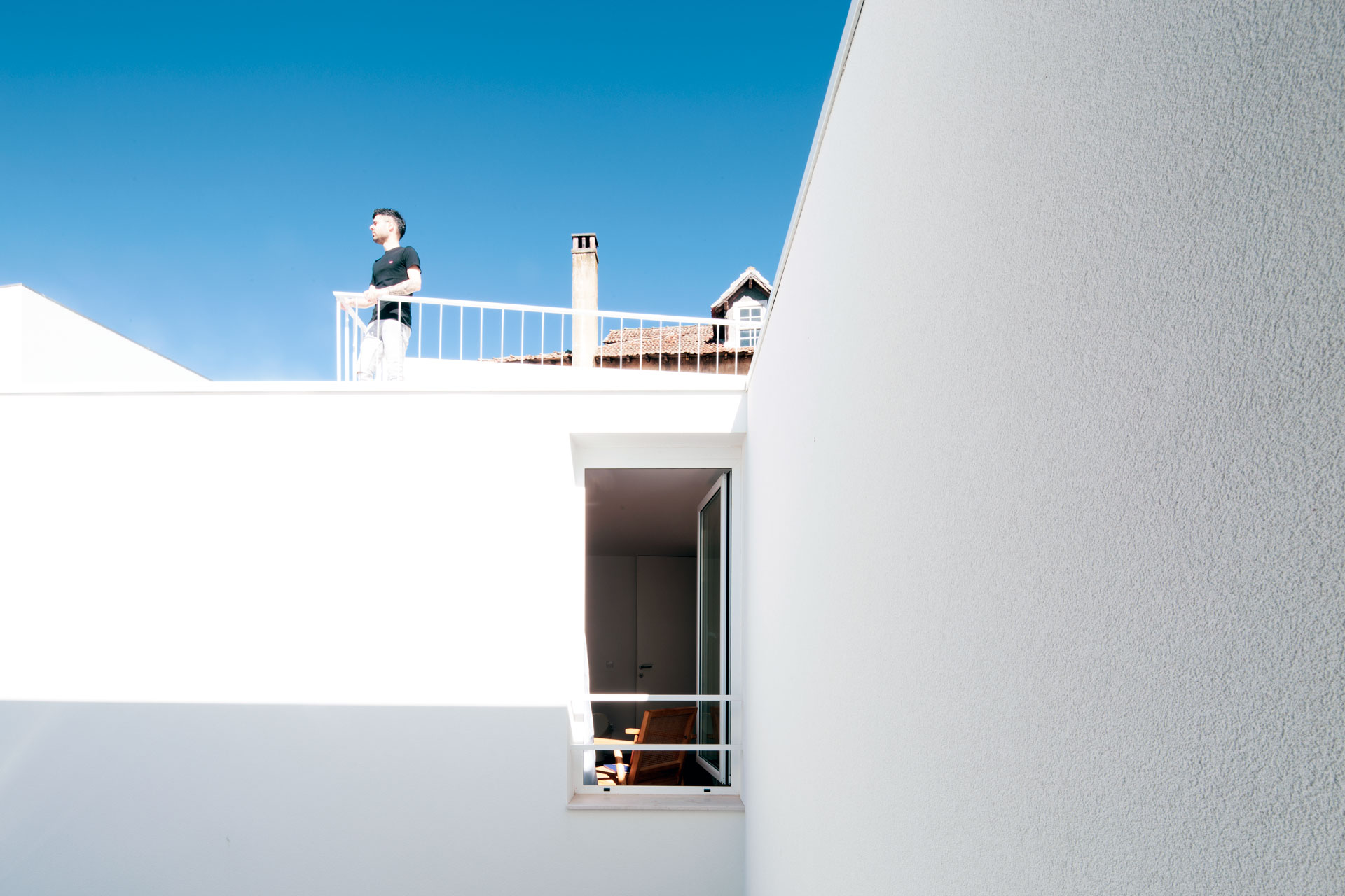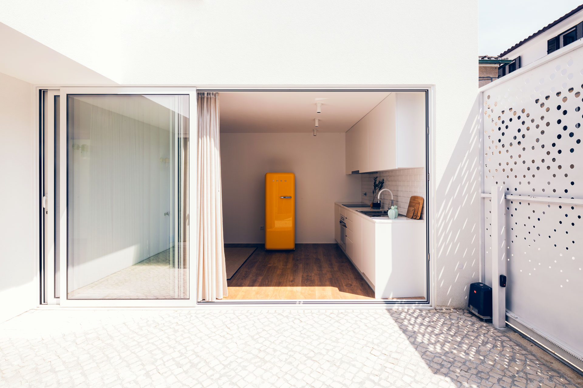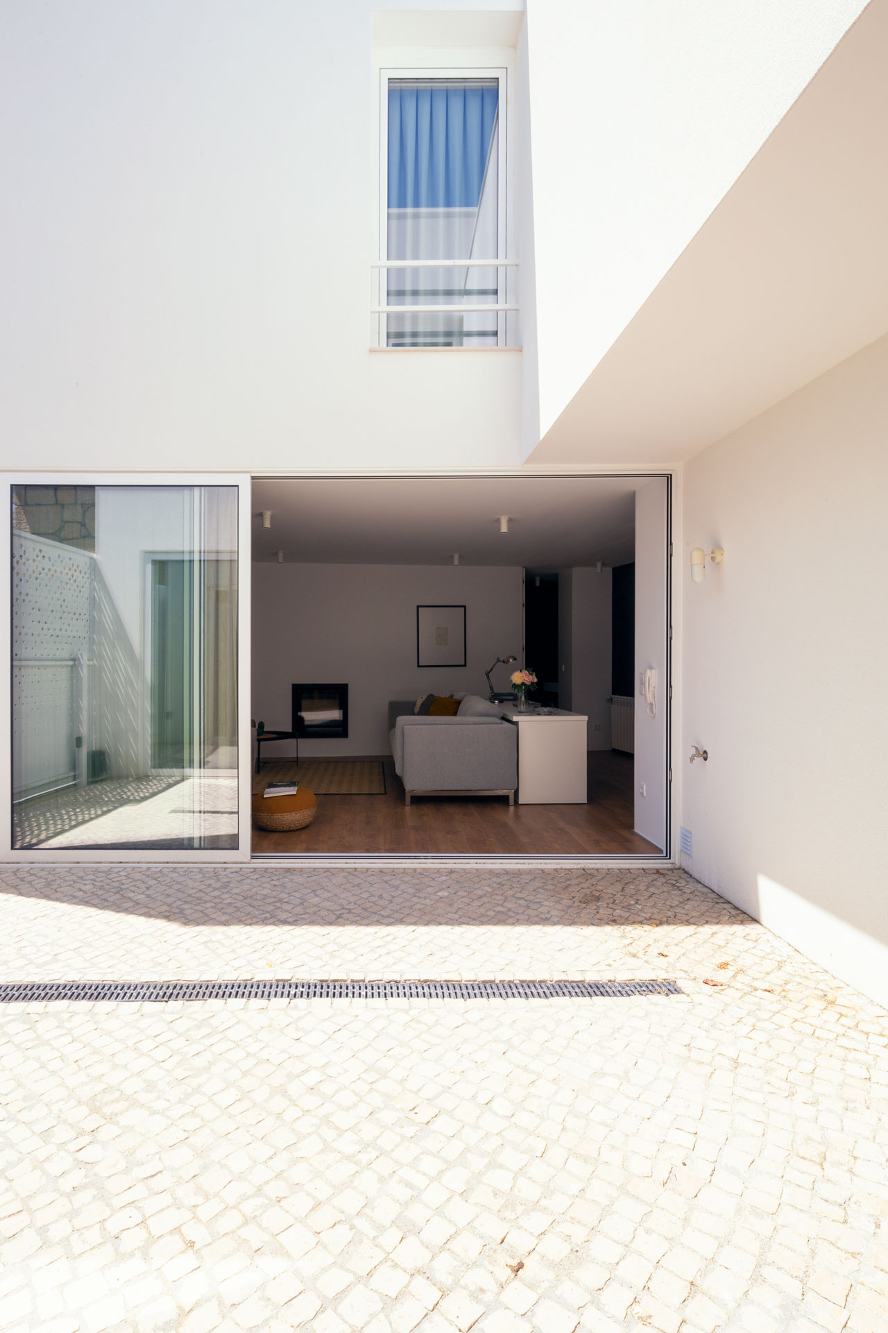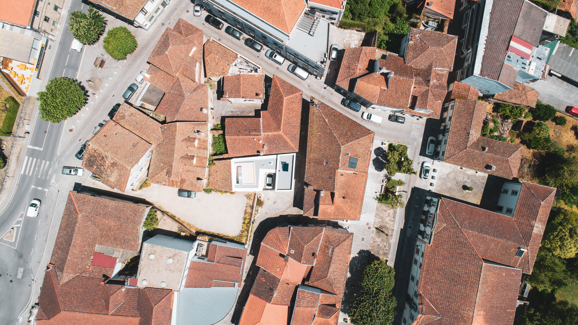 붉은 기와 지붕들이 빼곡히 들어선 포르투갈 소도시 중심가에 위치한 화이트 톤의 모던 주택입니다.
