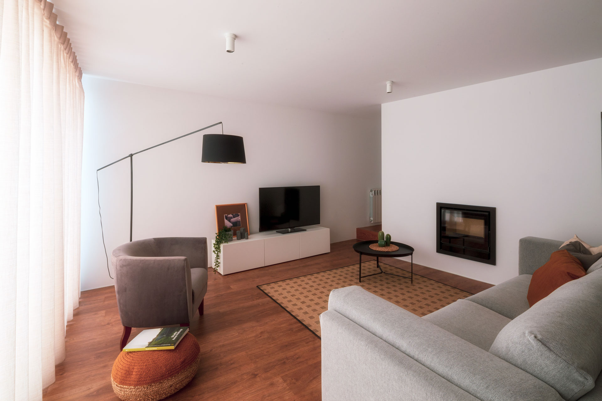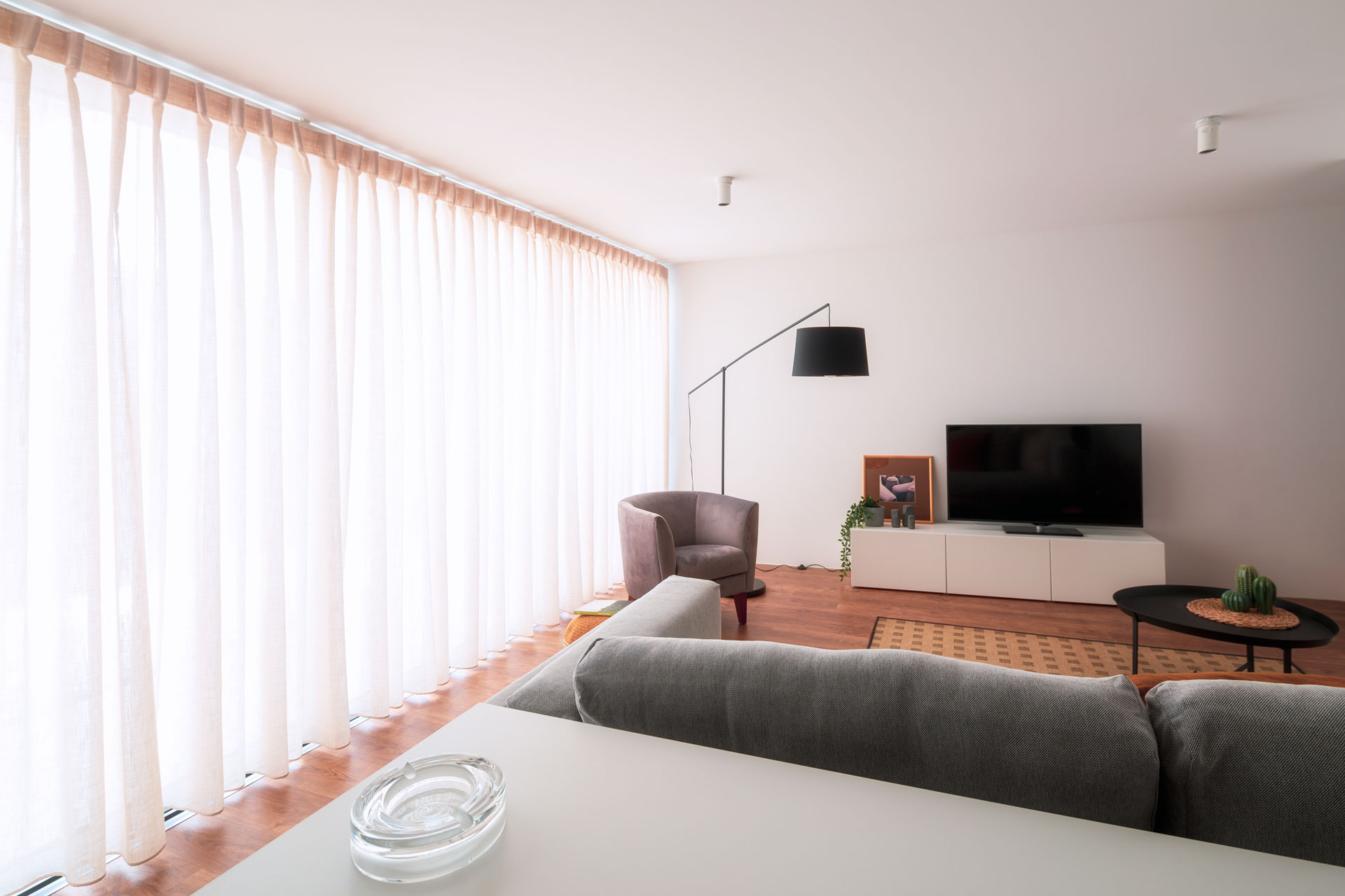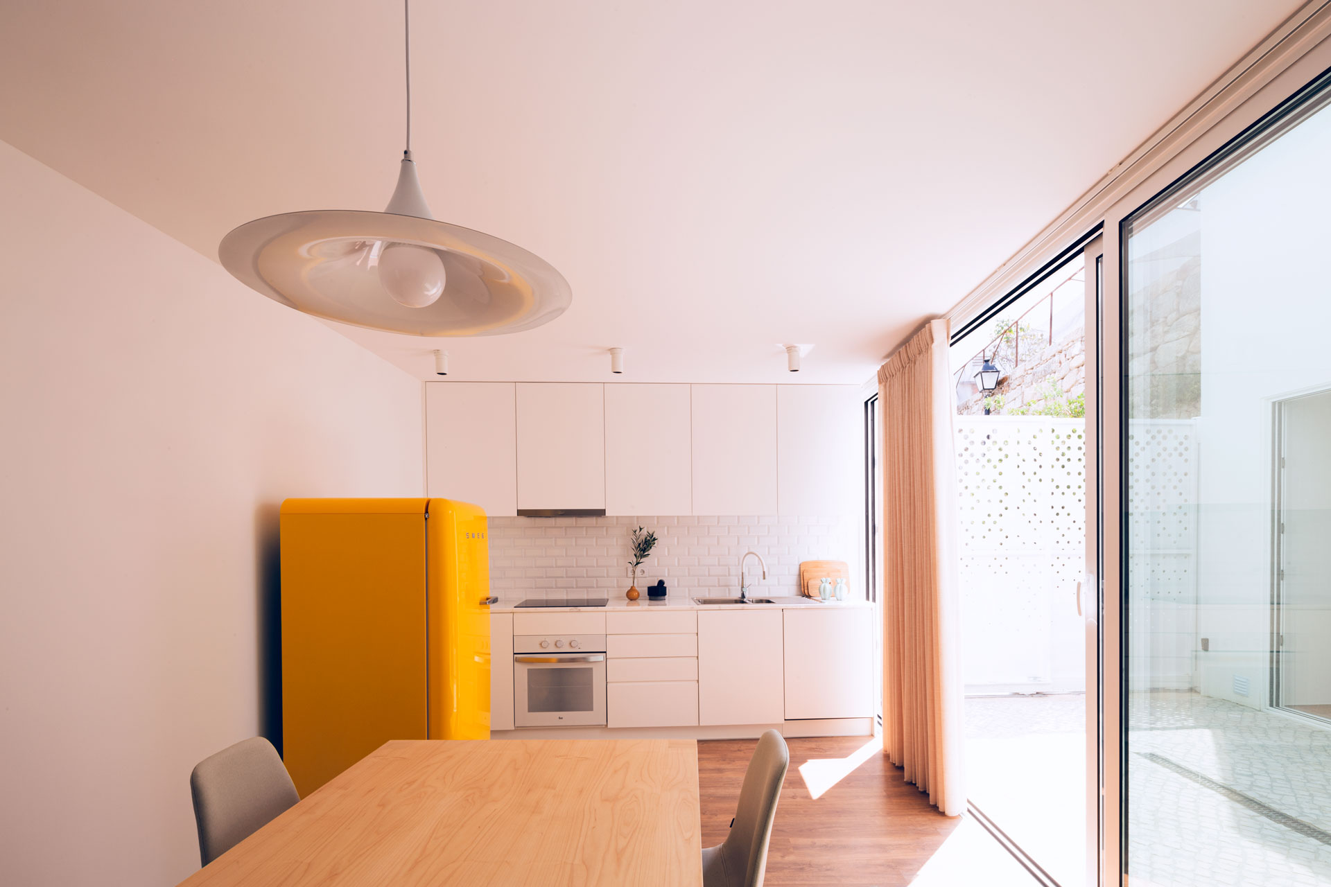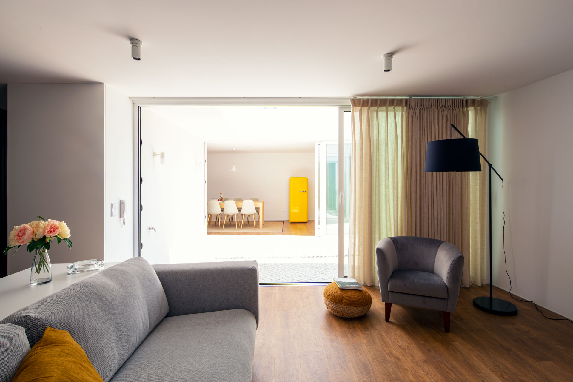 붉은 기와 지붕들이 빼곡히 들어선 포르투갈 소도시 중심가에 위치한 화이트 톤의 모던 주택입니다.