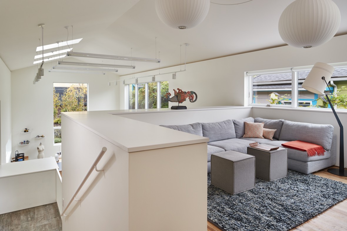 그보다 반층 밑으로 스튜디오 공간이 자리하고 있으며 반층 위로는 게스트 룸이 있습니다.