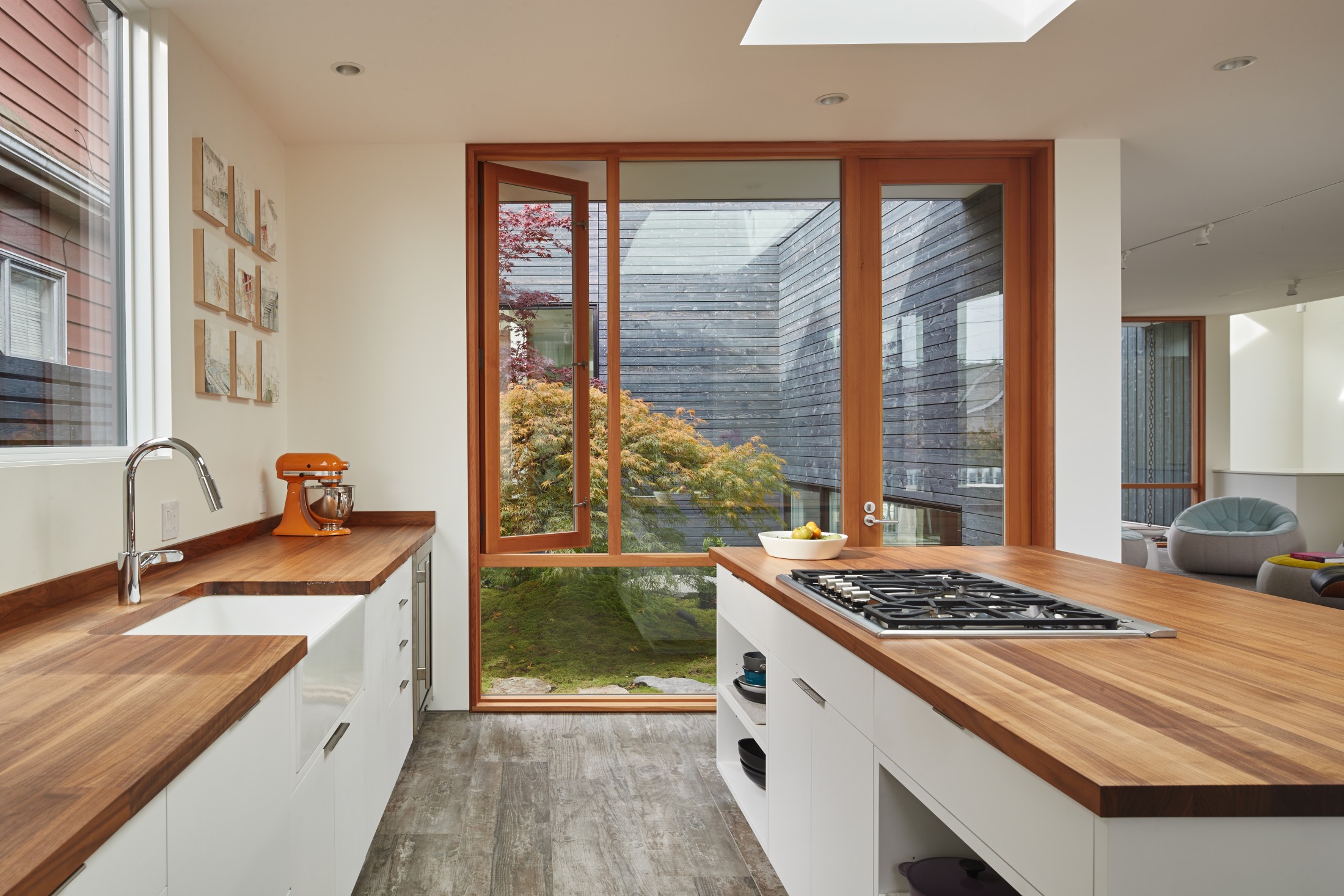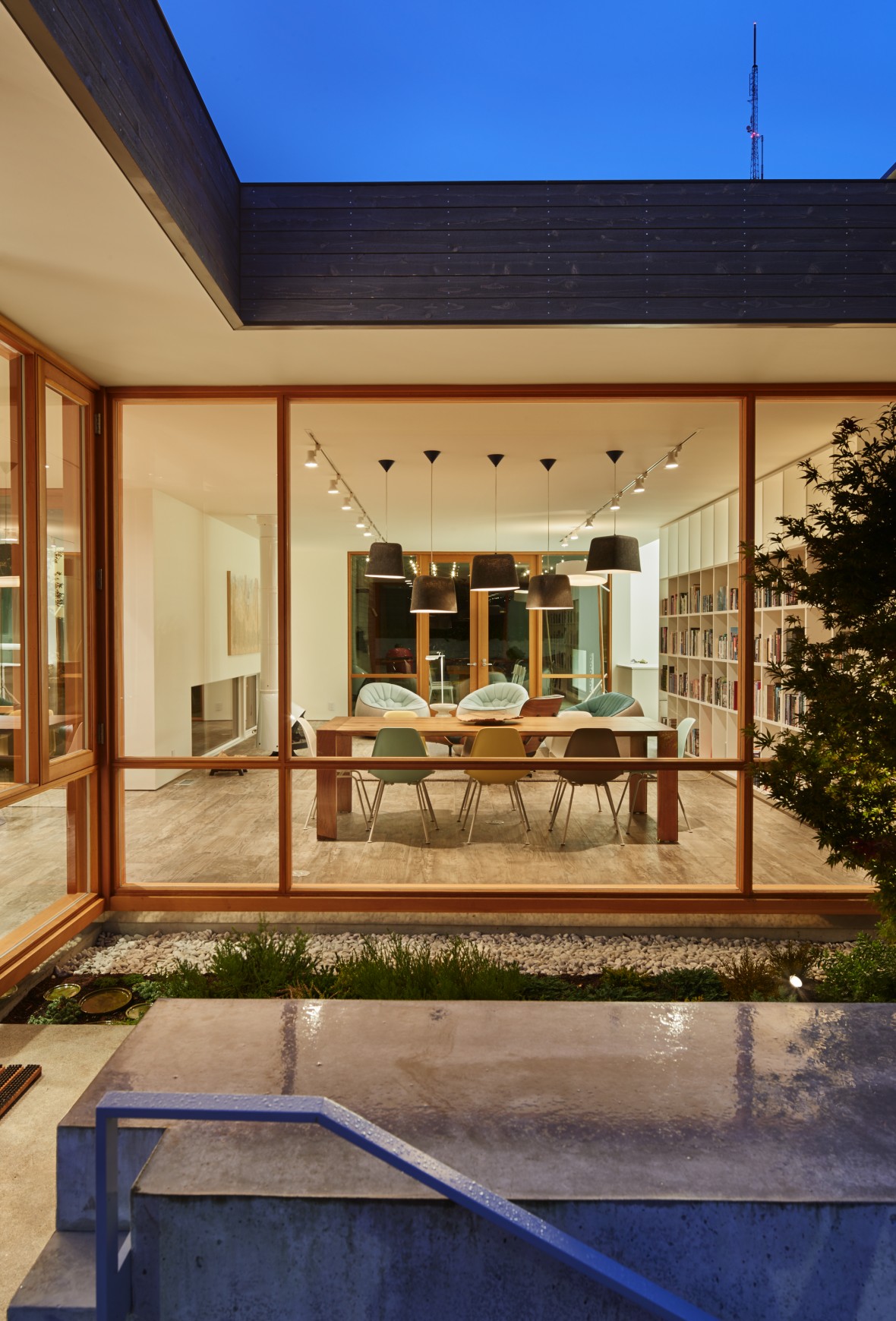 내부 공간의 중심인 거실 겸 식당은 입구부터 뒷 마당까지 연결되어 있고 1층 이지만 지면보다 높아