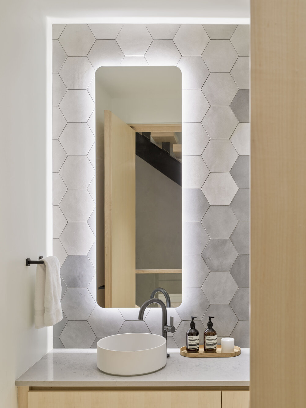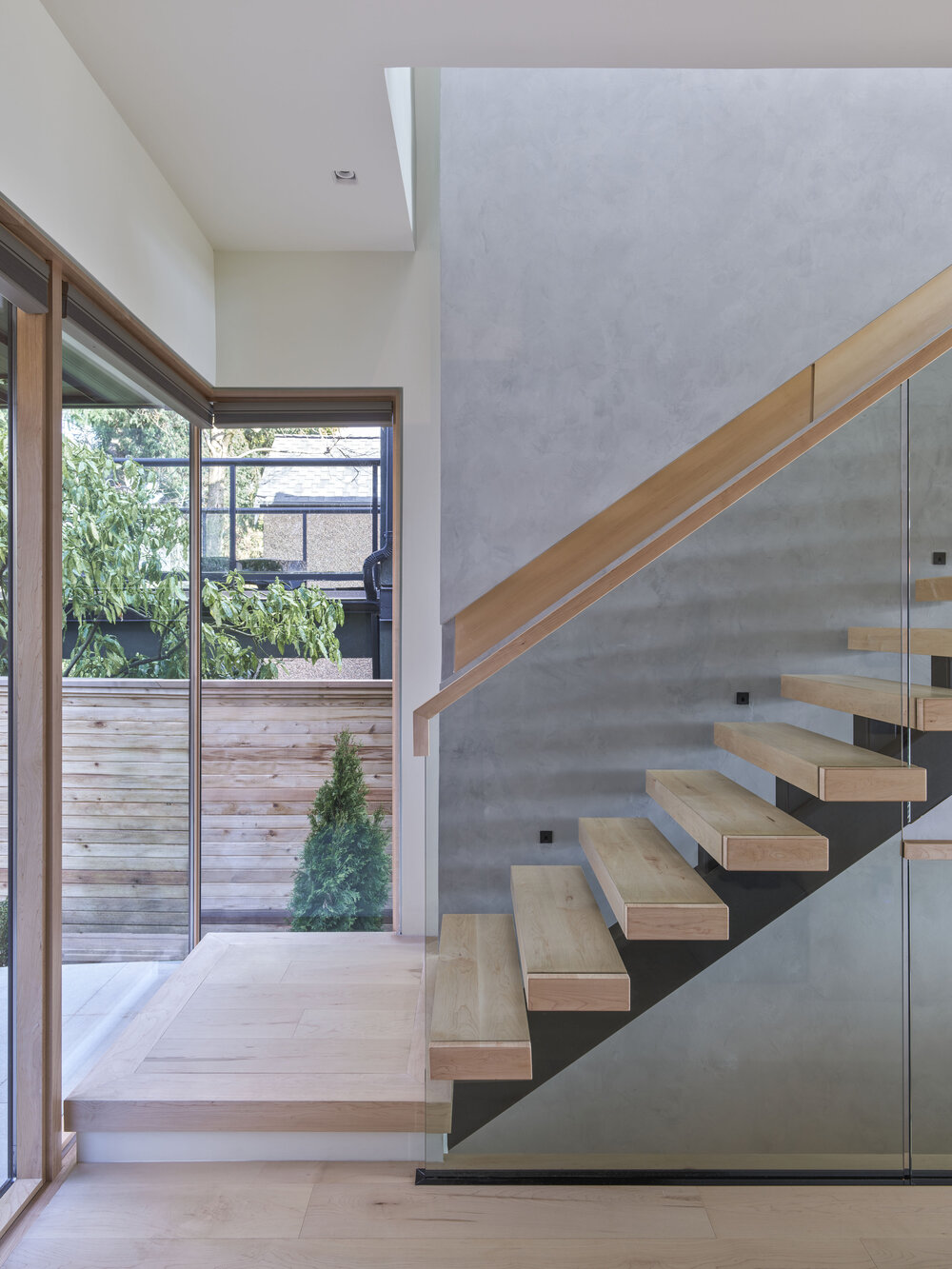 내부도 화이트 톤과 그레이 벽면을 중심으로 나무 활용이 돋보이며