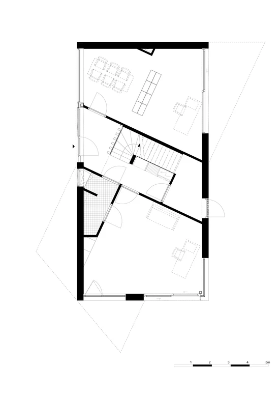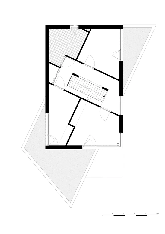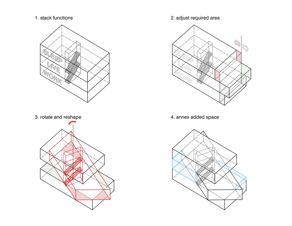 직사각형 바닥을 가진 3개 층에서 두번째 층을 비스듬히 틀어 외형적으로 독특한 모양을 만들었습니다.