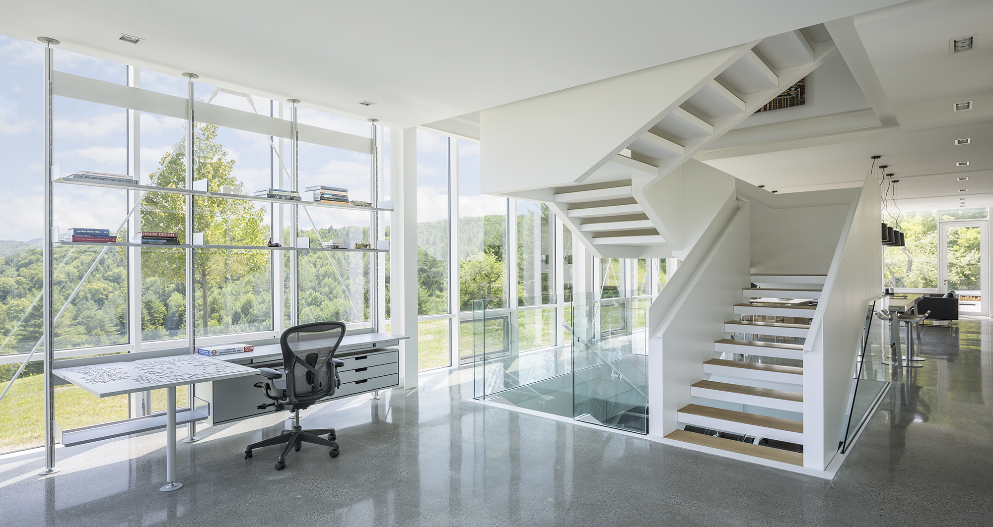 메인 공간은 특히 외부가 유리로 마감되어 마당으로 공간을 확장하고 자연 경관을 잘 볼 수 있게 설계되었습니다.