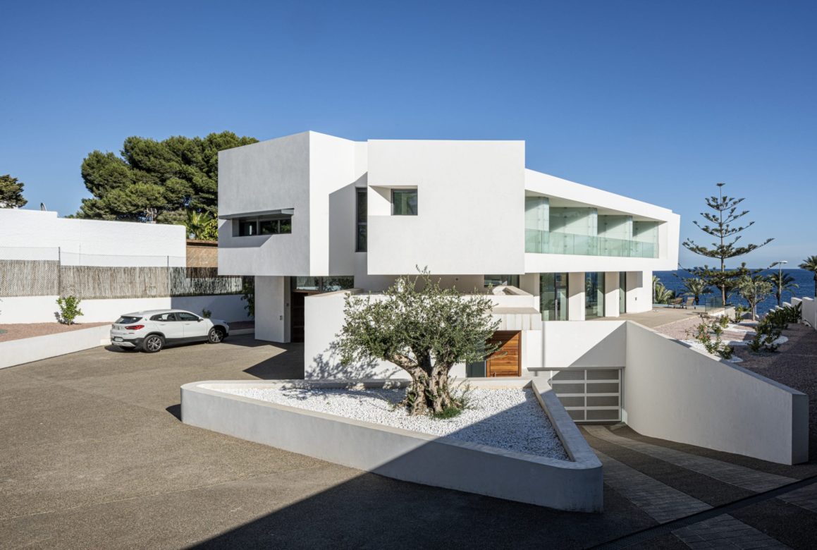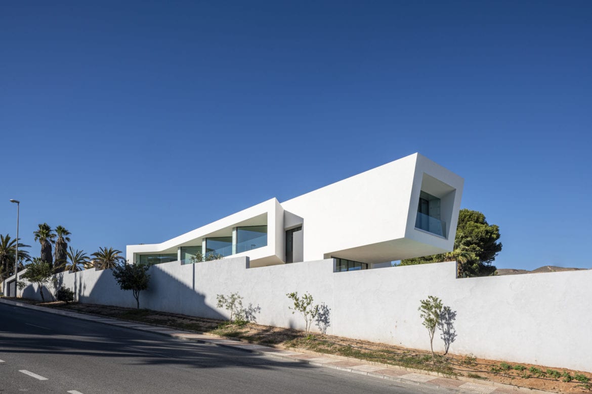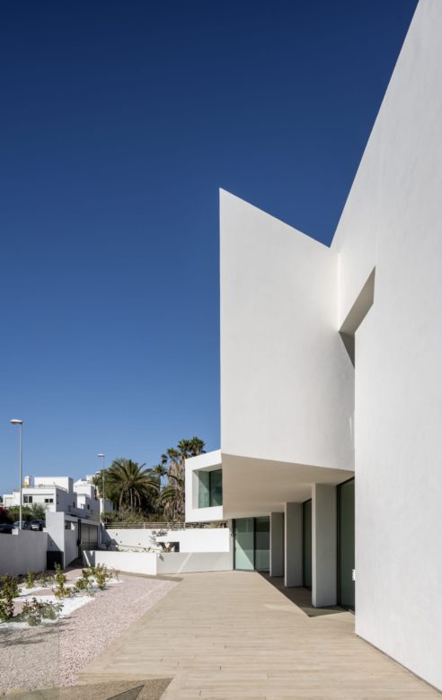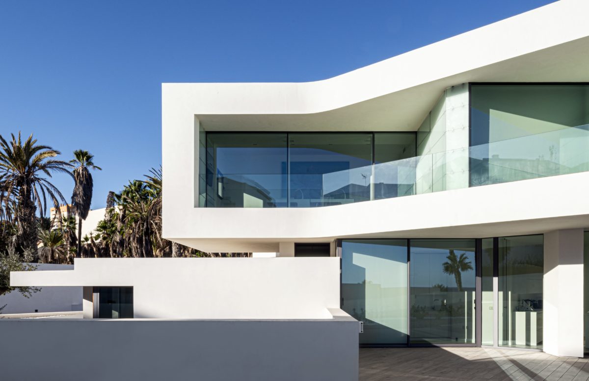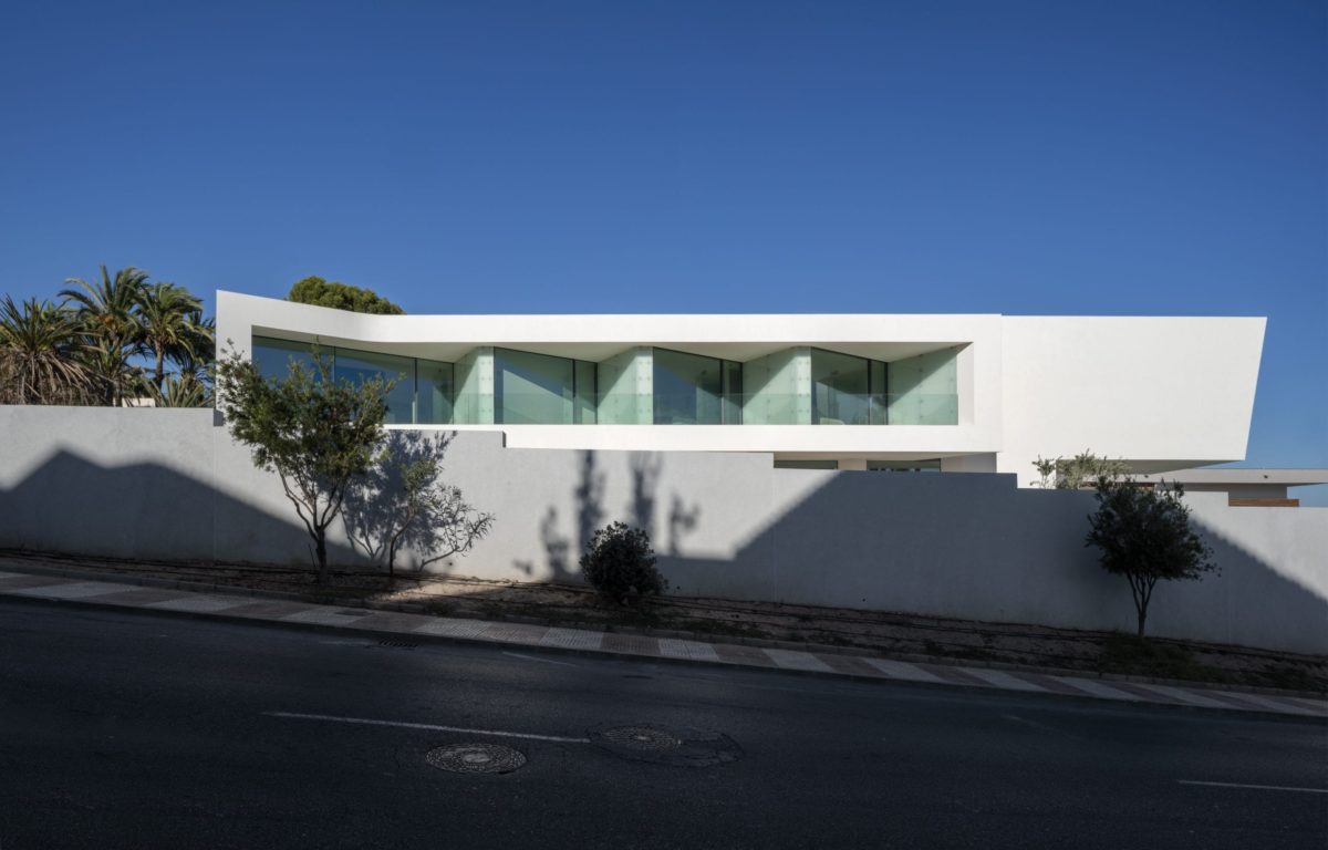 스페인 해안가에 위치한 층고가 낮으면서 길죽한 형태의 백색 집입니다.