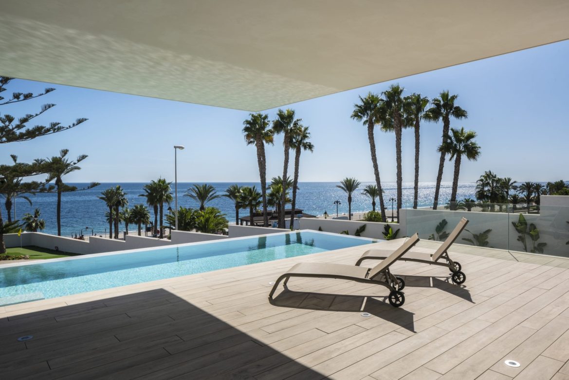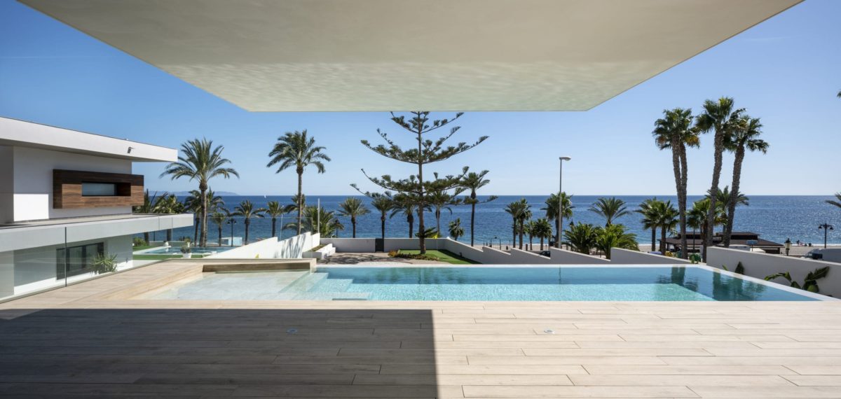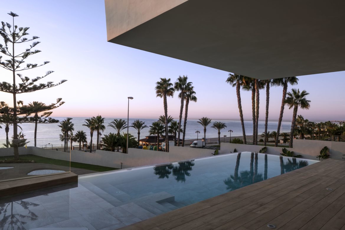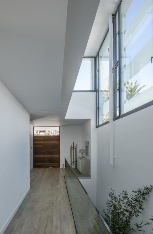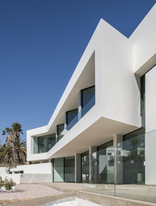 스페인 해안가에 위치한 층고가 낮으면서 길죽한 형태의 백색 집입니다.