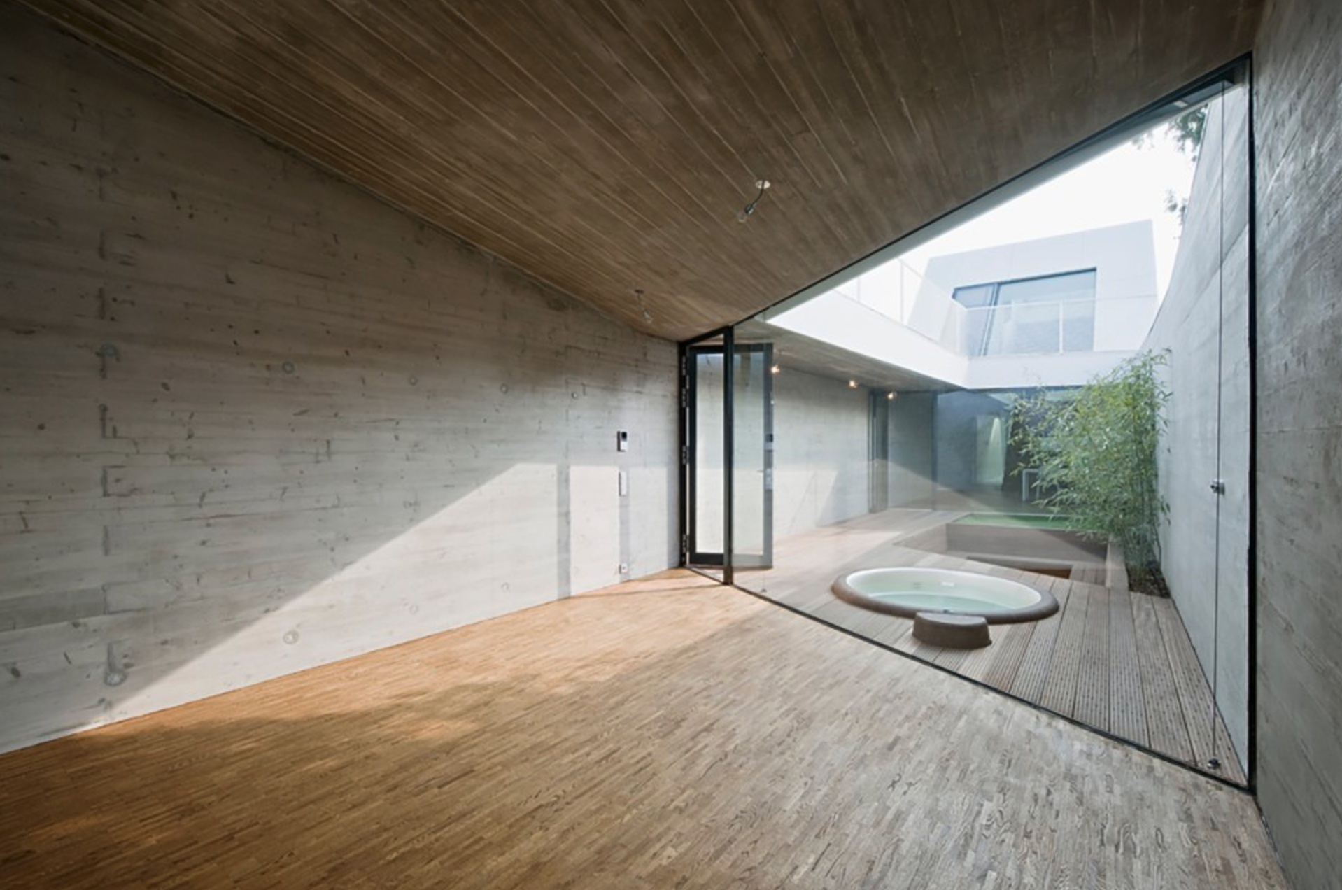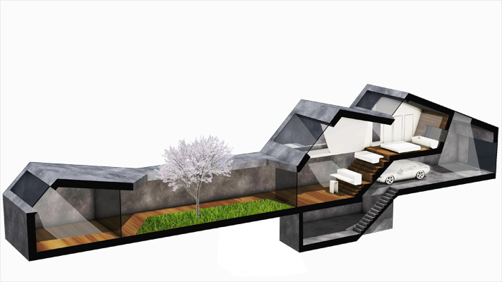외관에서 보면 폐쇄적인 집으로 보이지만 안으로 들어서면 차고부터 정원, 테라스 그리고 사무실과 영화관도 갖추고 있습니다.