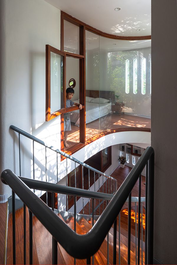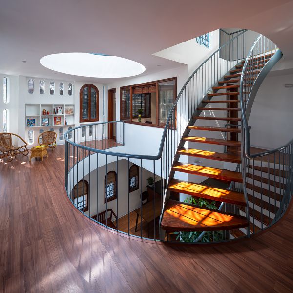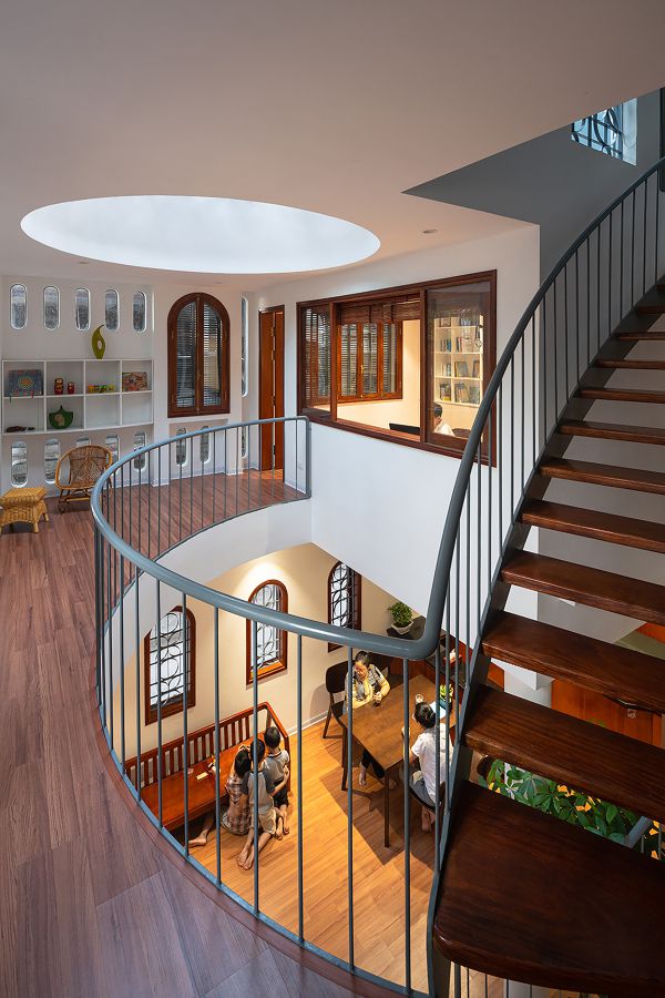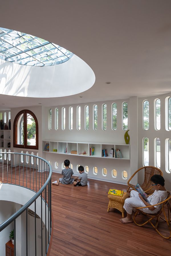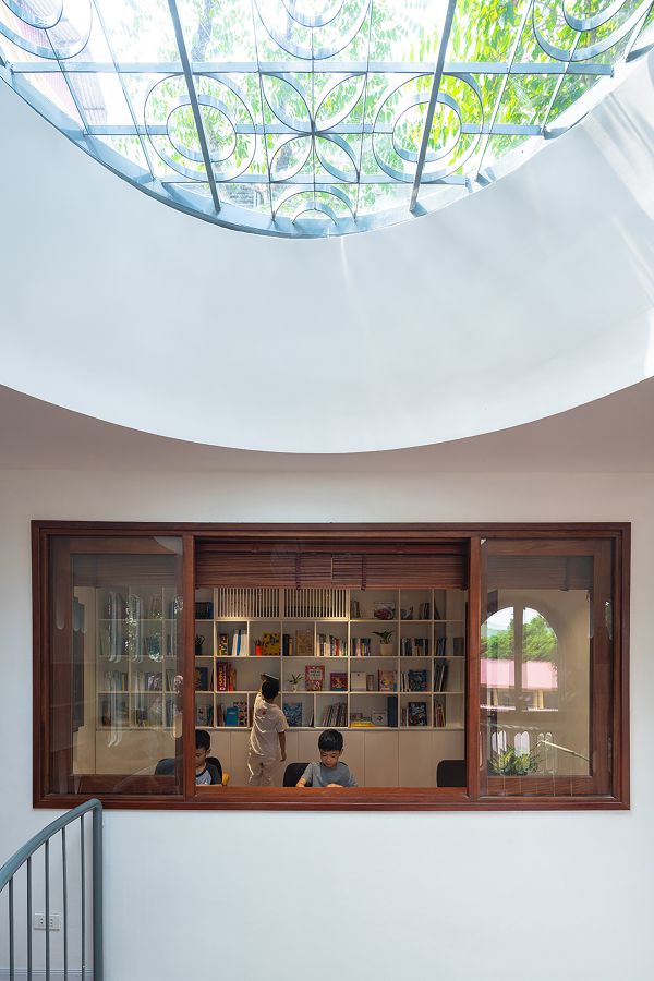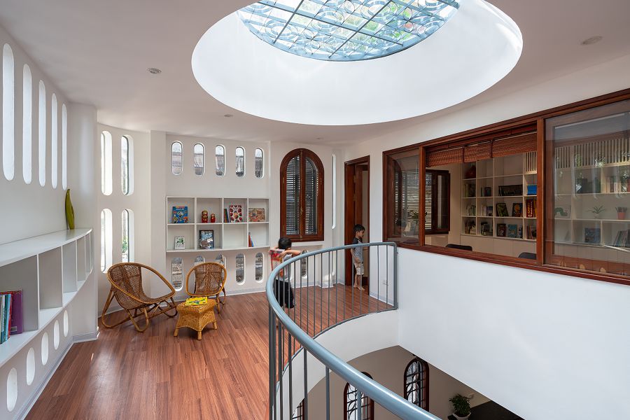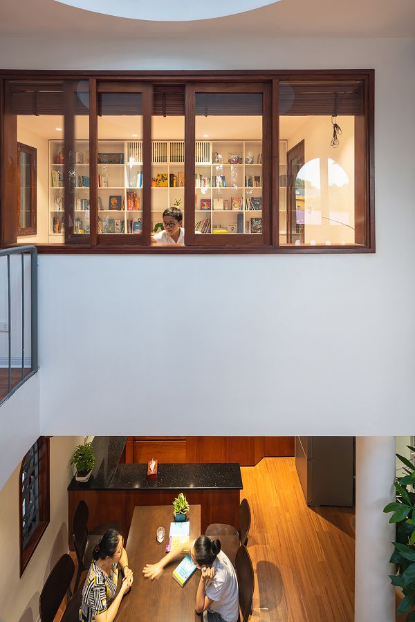 아이 두명이 있는 젊은 부부를 위한 이 집은 디자인 컨셉이 소통형 가족 공간과 도서관이다.