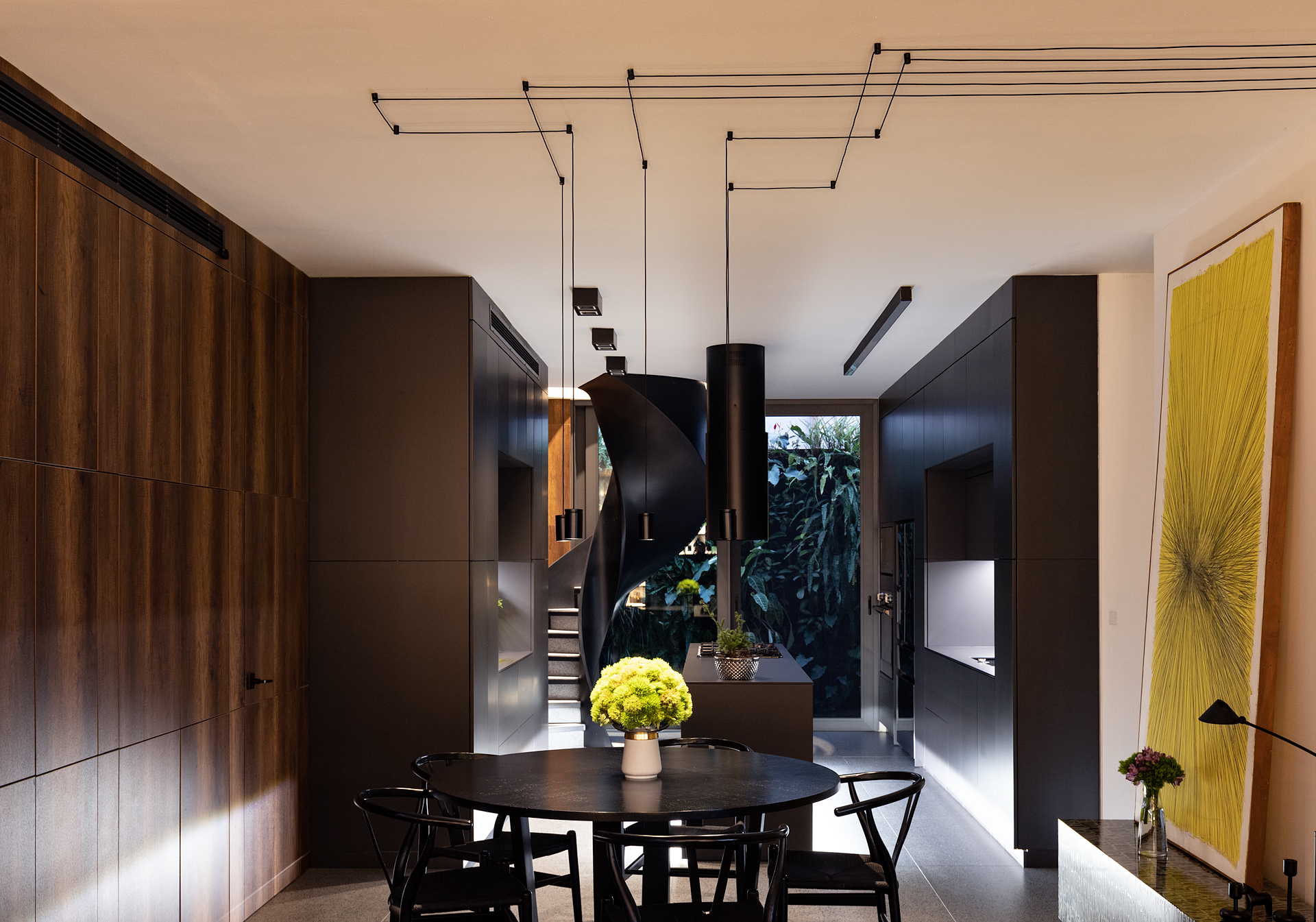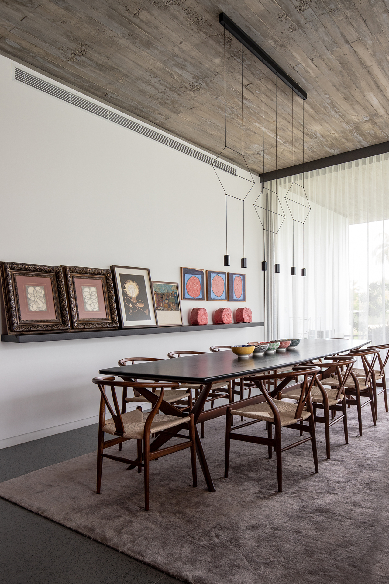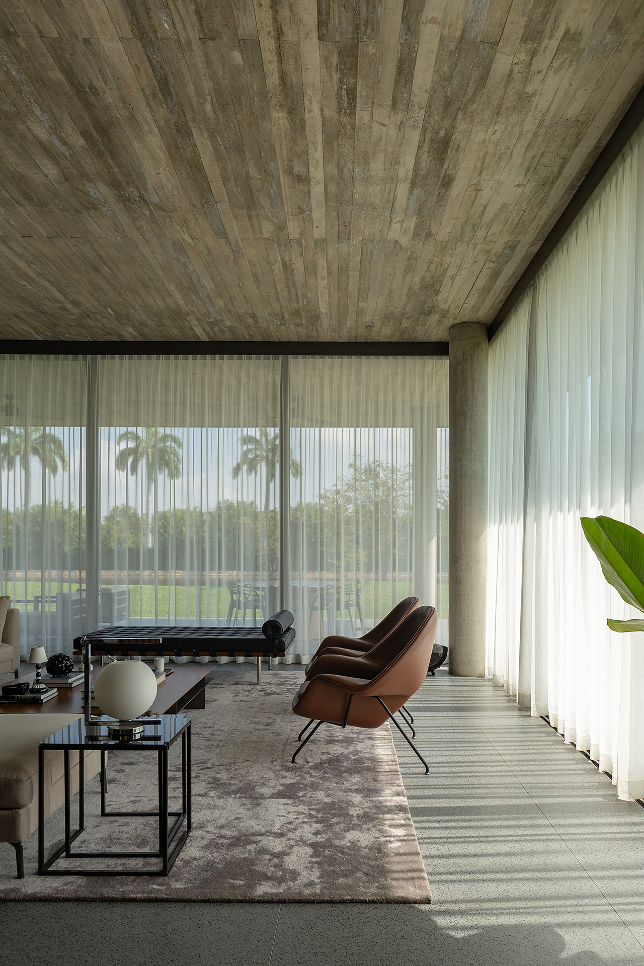 내부 인테리어는 노출 콘크리트와 화이트 톤의 벽면을 기본으로 대리석과 어두운 톤의 나무를 사용하여 무게감을 더합니다.