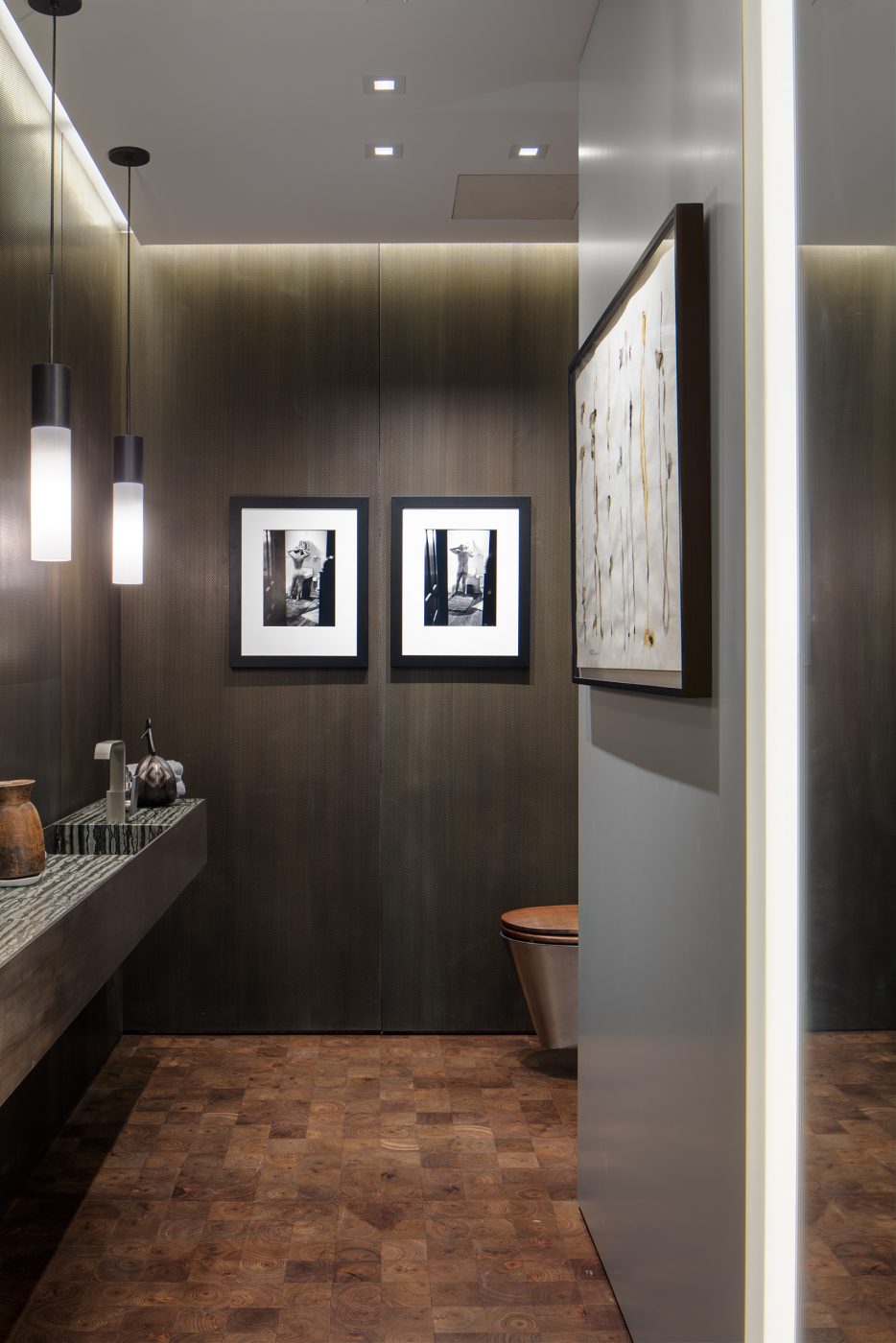인더스트리얼 요소들과 나이테가 보이는 월넛 나무바닥 그리고 미술품이 돋보이는 튀지 않는 벽면등이