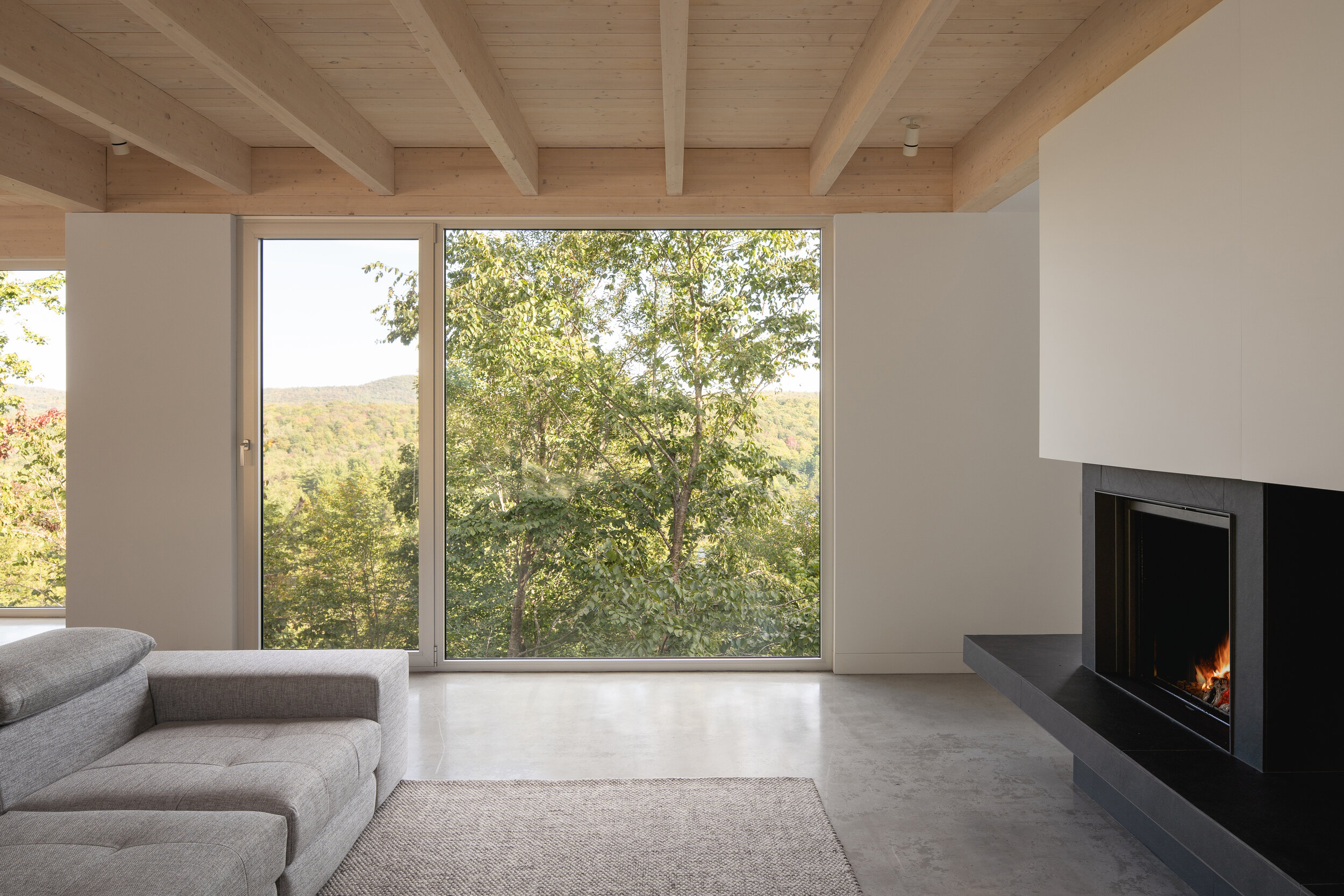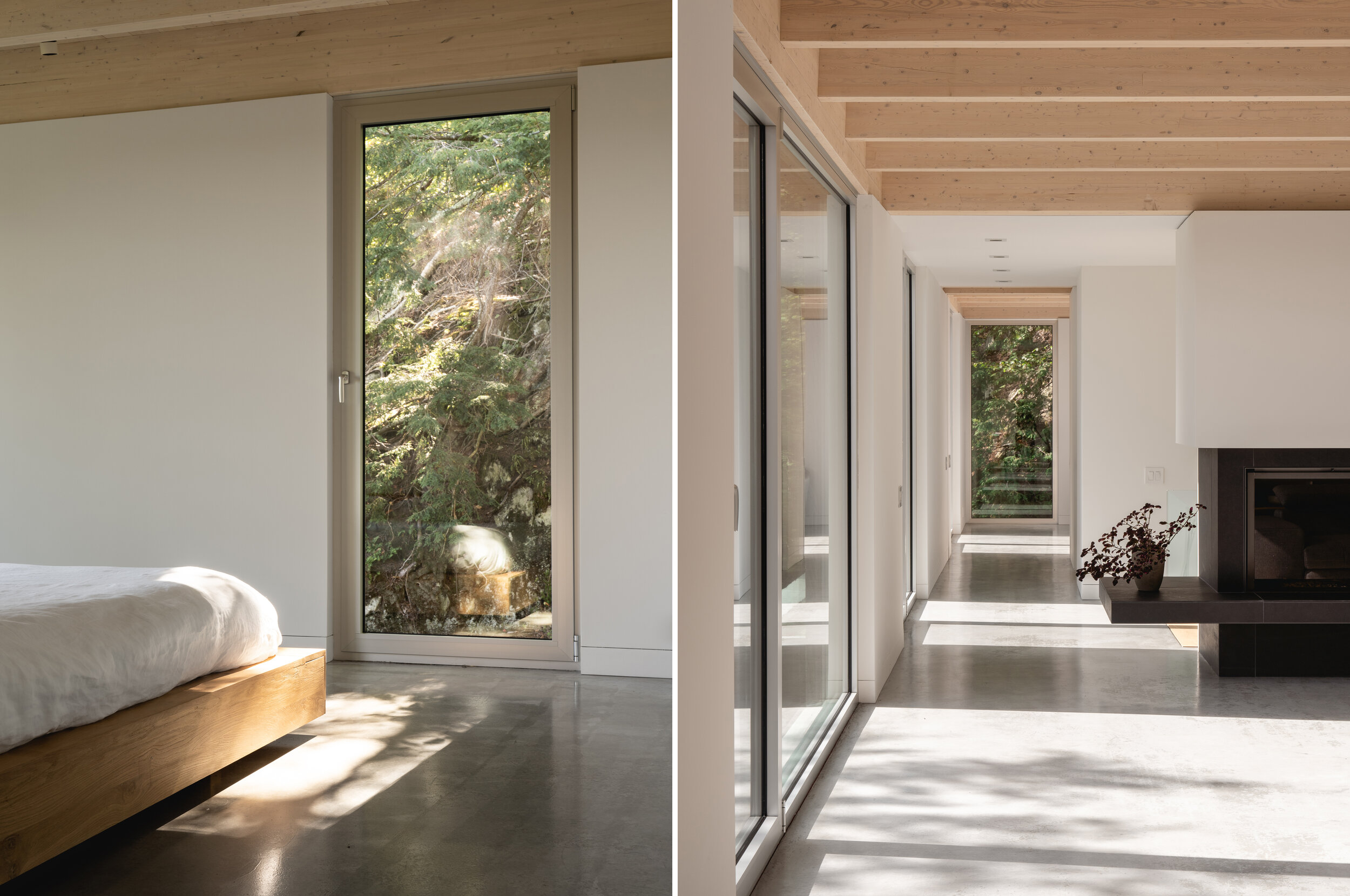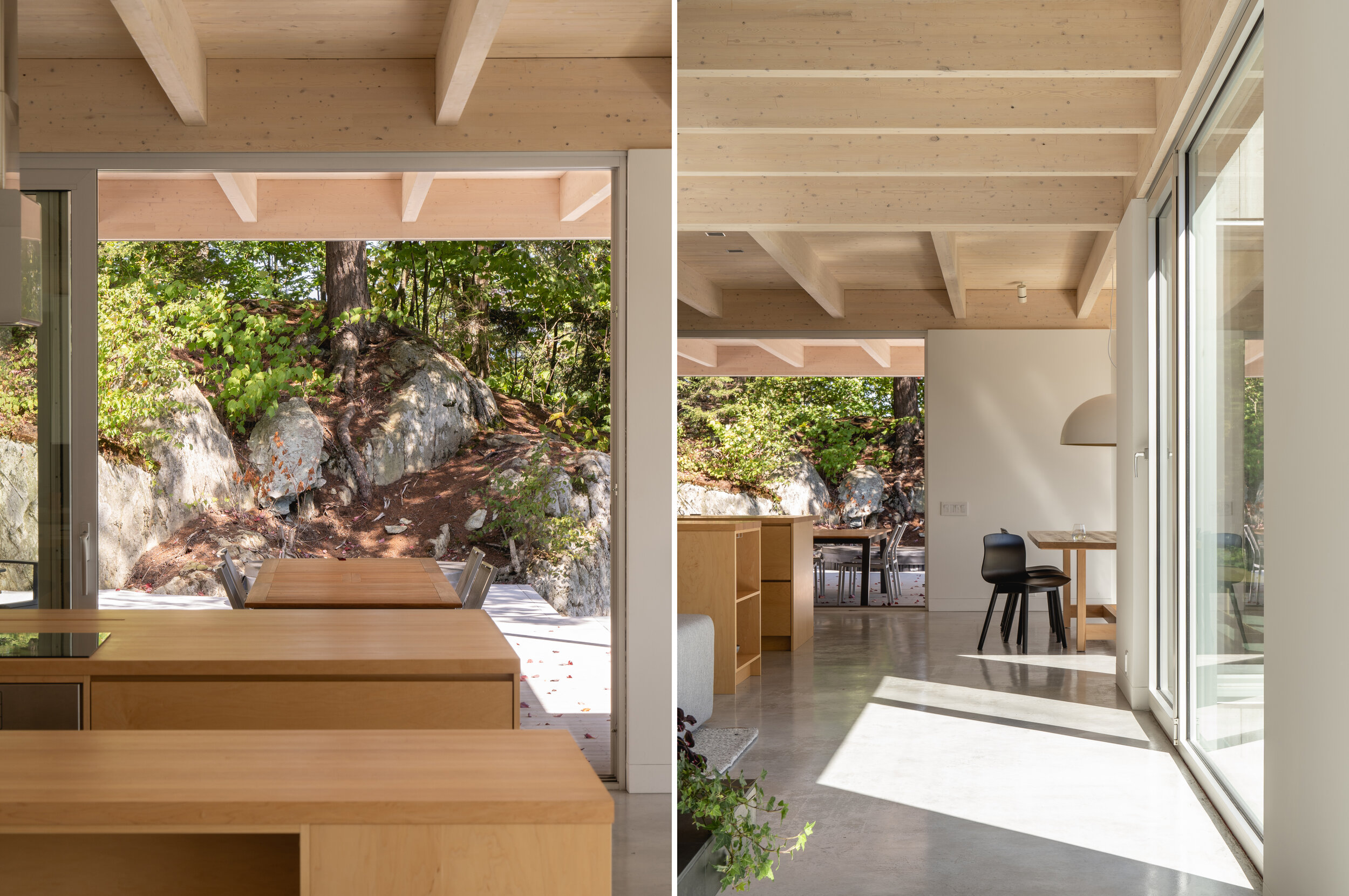 거실에서는 바위 위로 테라스가 산비탈과 연결되어 집에서 자연으로 공간이 확장되는 느낌입니다.