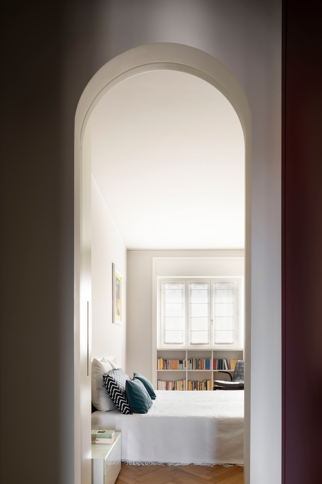 전체적으로 책장이 많은 것이 이집의 특징인데 서재와 거실은 테라조 바닥과 헤링본 나무 바닥으로 명확히 구분됩니다.