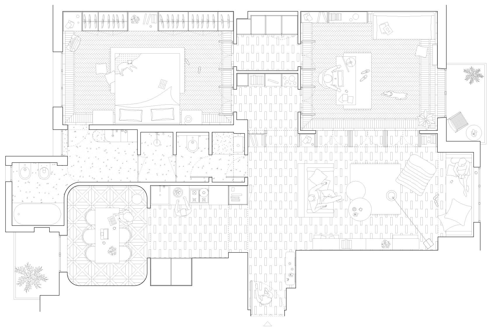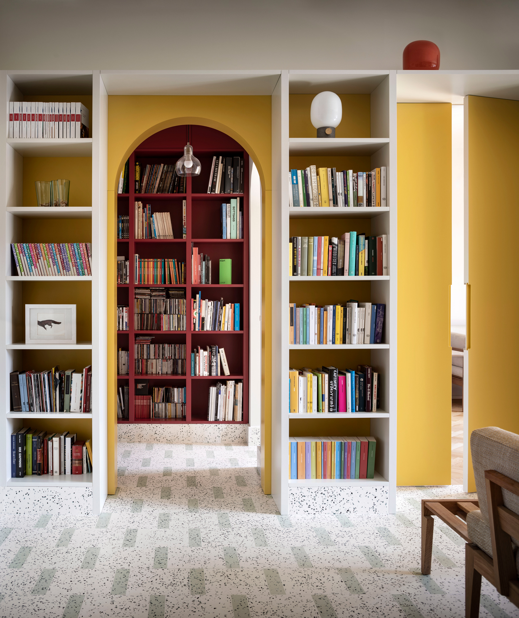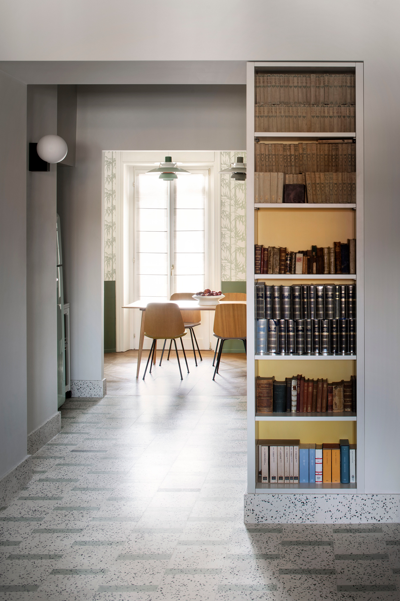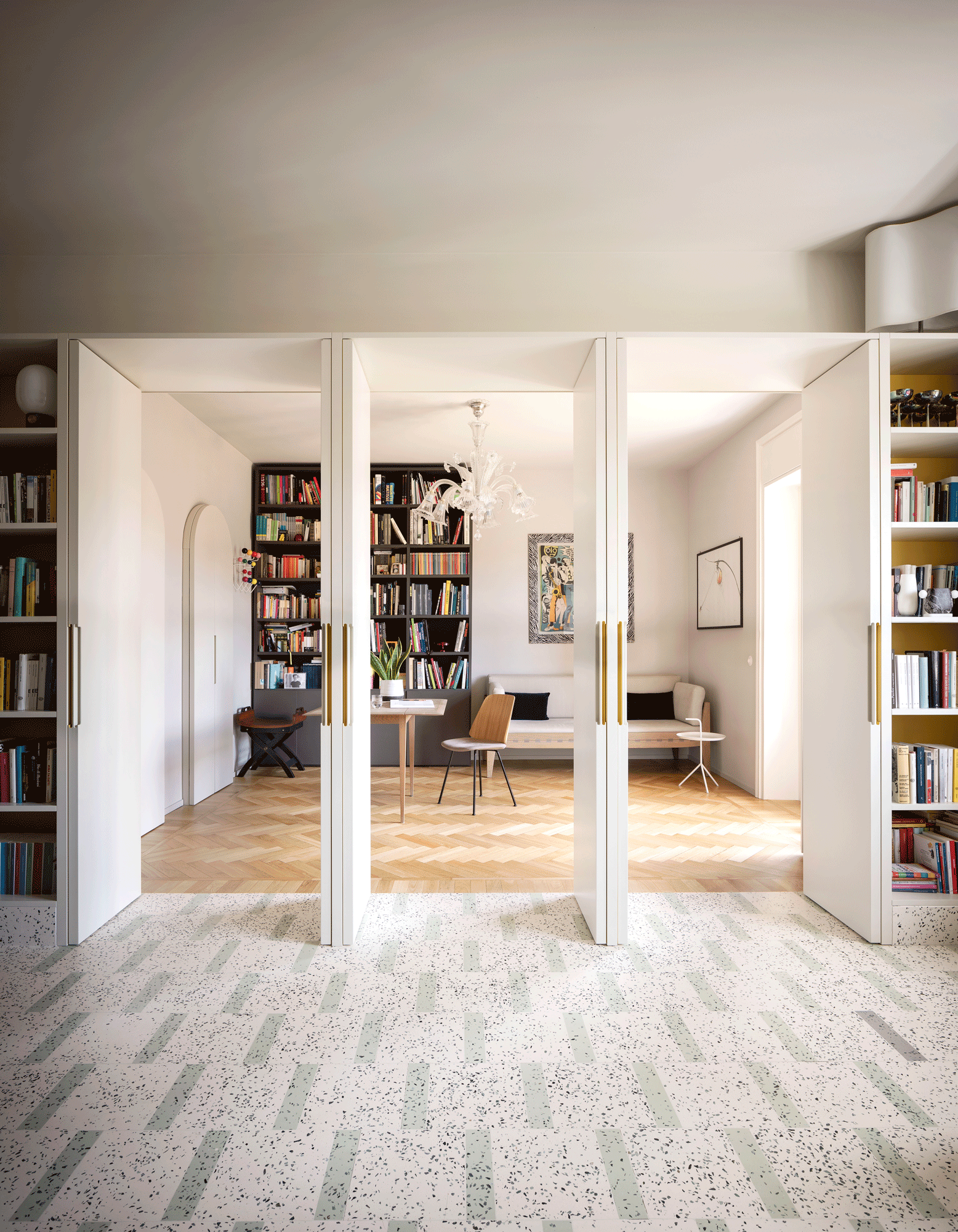 전체적으로 책장이 많은 것이 이집의 특징인데 서재와 거실은 테라조 바닥과 헤링본 나무 바닥으로 명확히 구분됩니다.