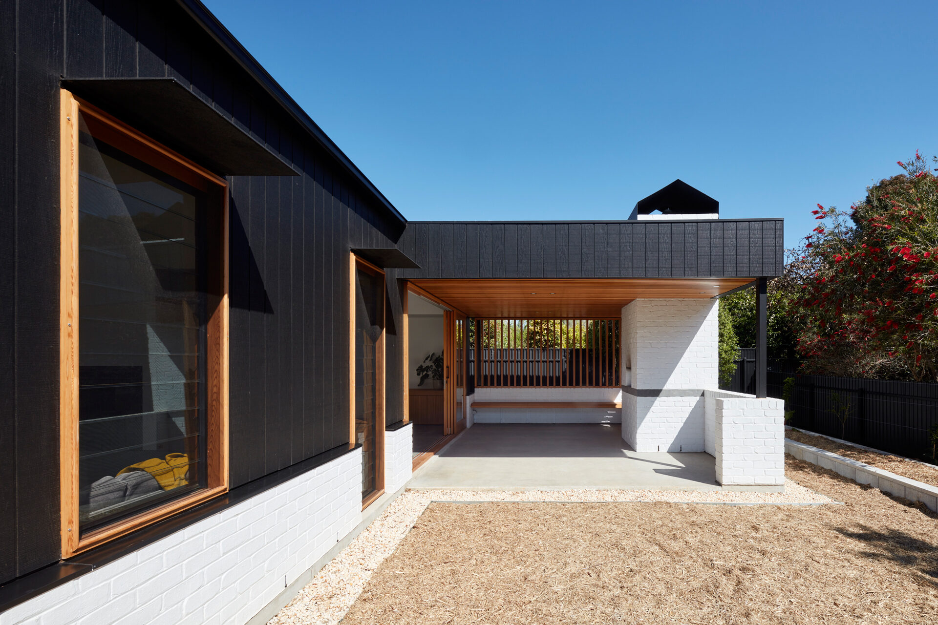 벽돌의 하단부를 남기면서 화이트로 도색하고 그 위에 블랙으로 도색된 목조 주택을 올려