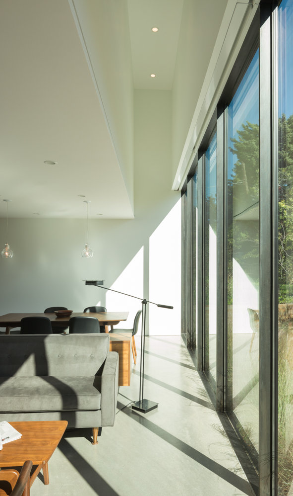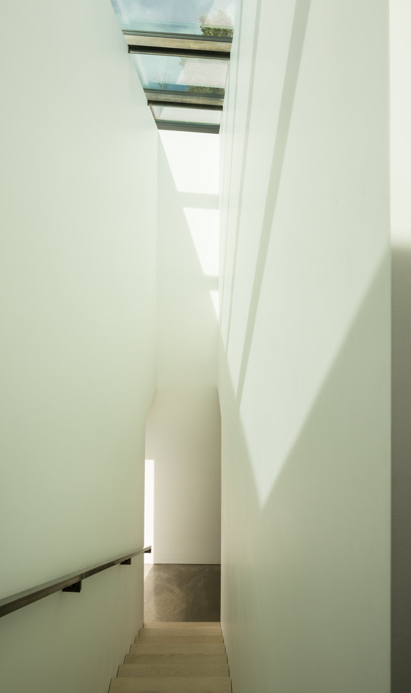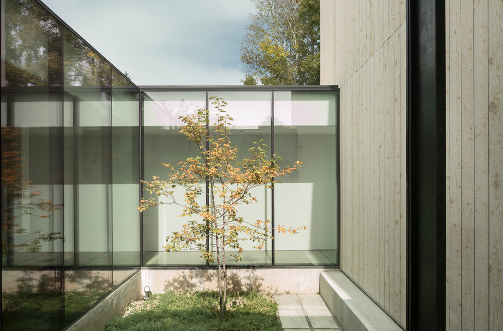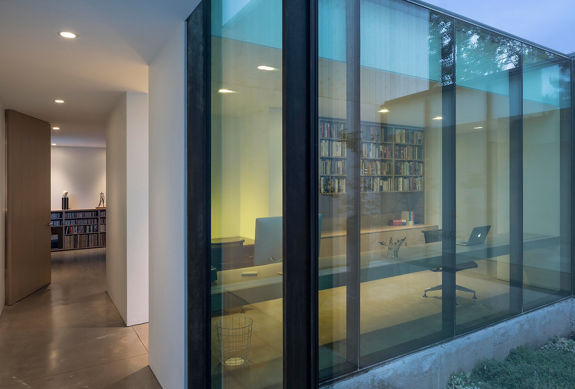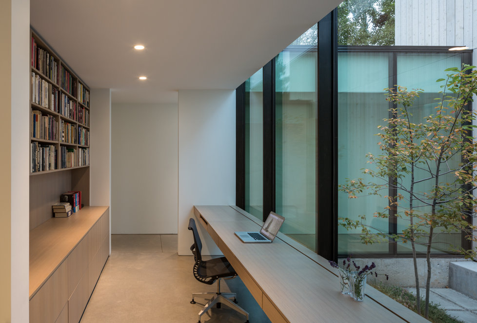 폭이 좁아 긴 직사각형 모양의 땅 위에 지어진 주택은 내부에 오피스를 가지고 있으며