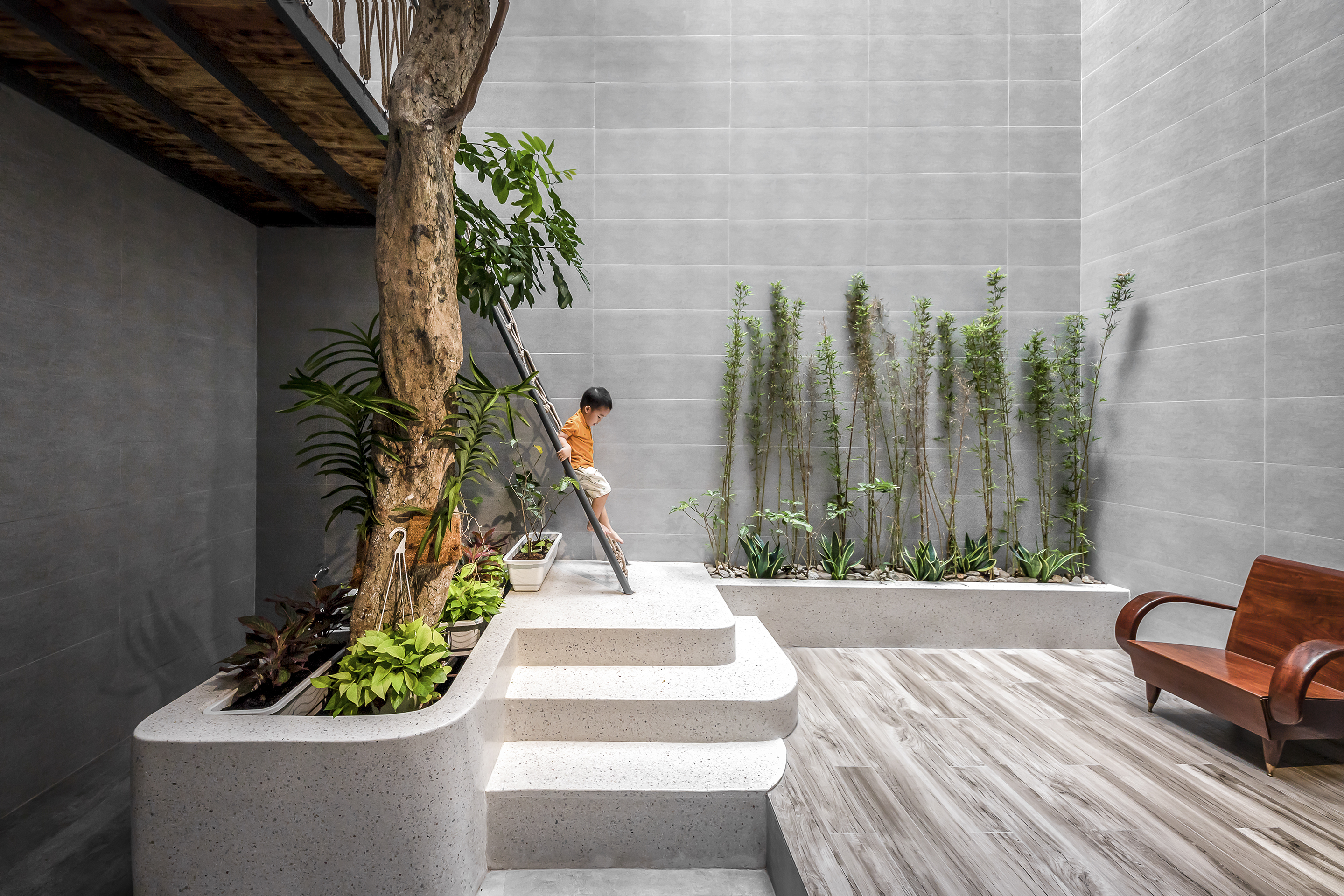 거실 크기와 침실 수를 줄이고 두 아이가 마음껏 놀 수 있는 공간과 테라스 및 트리하우스 수영장 등을 확충하였습니다.