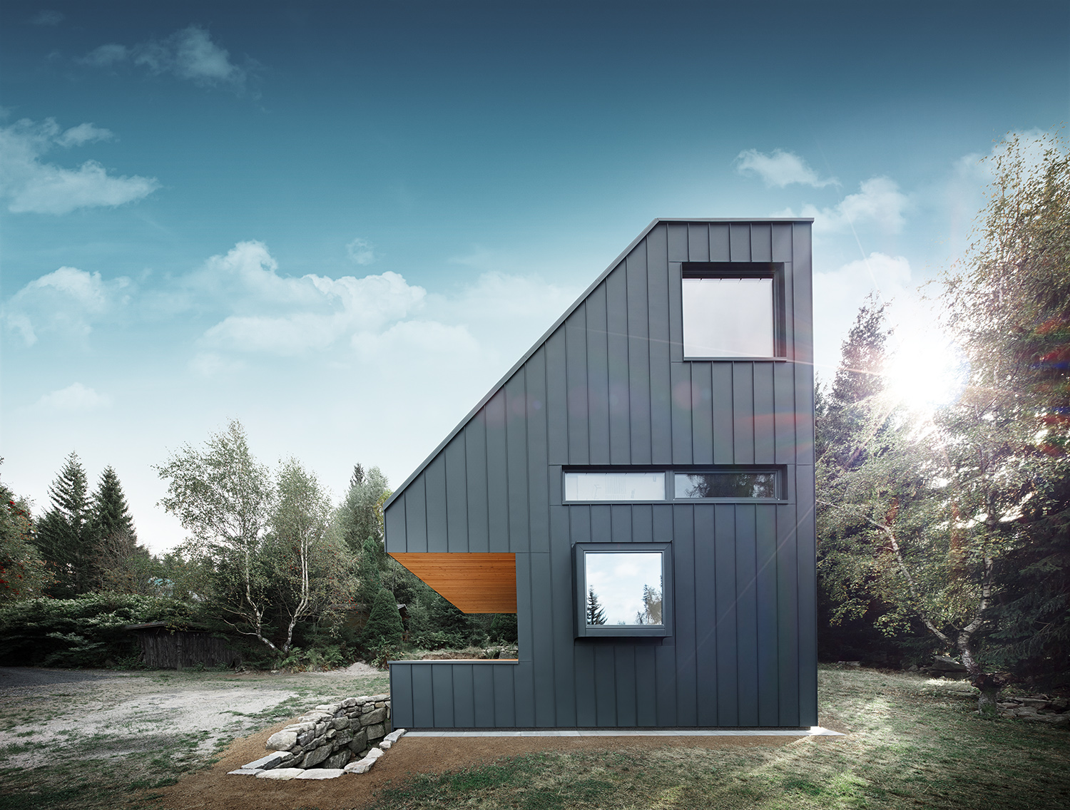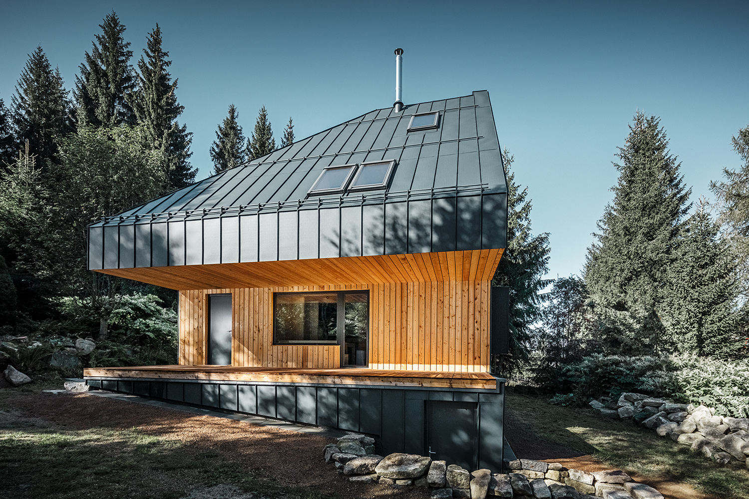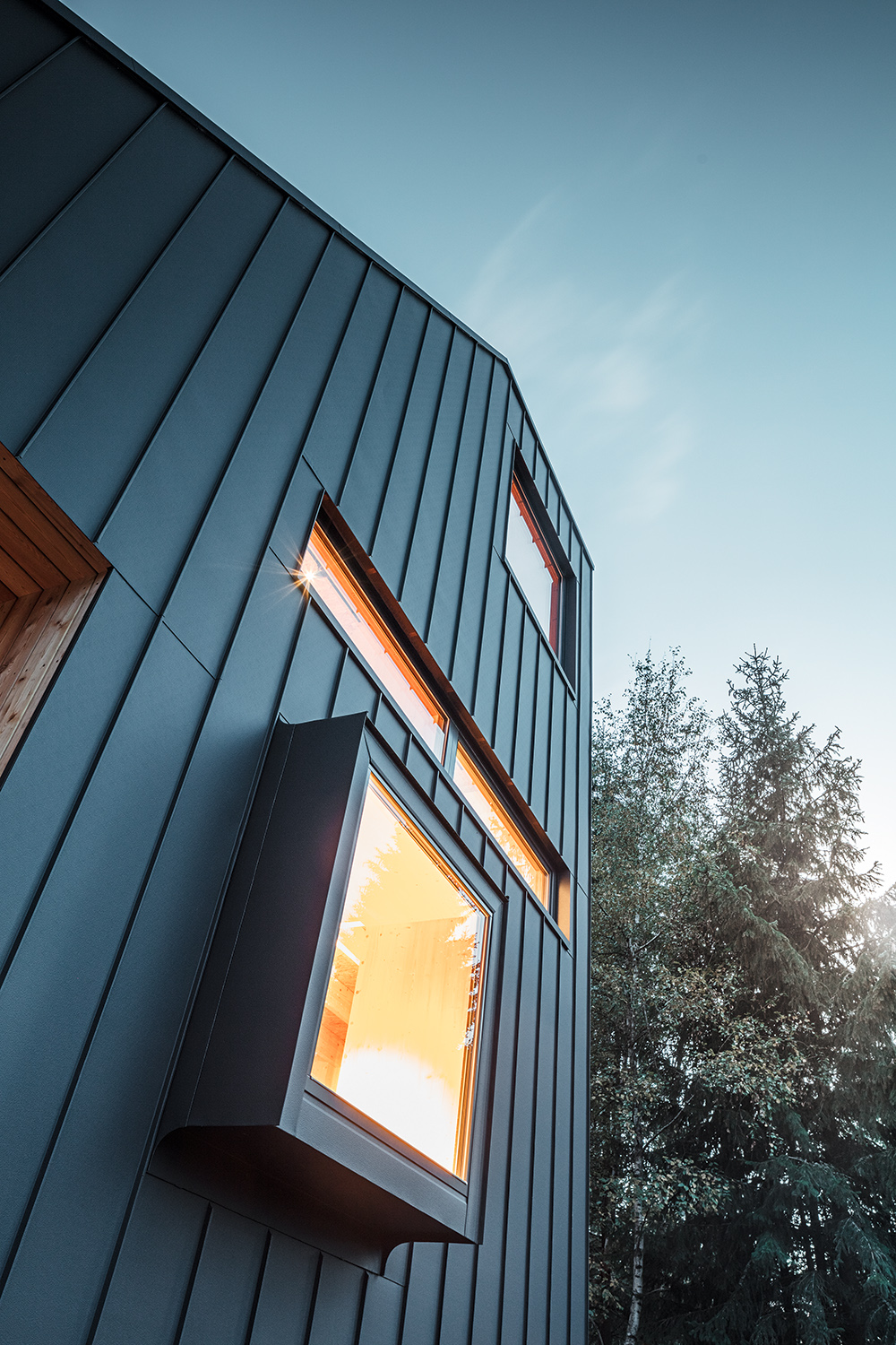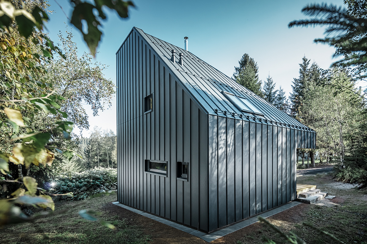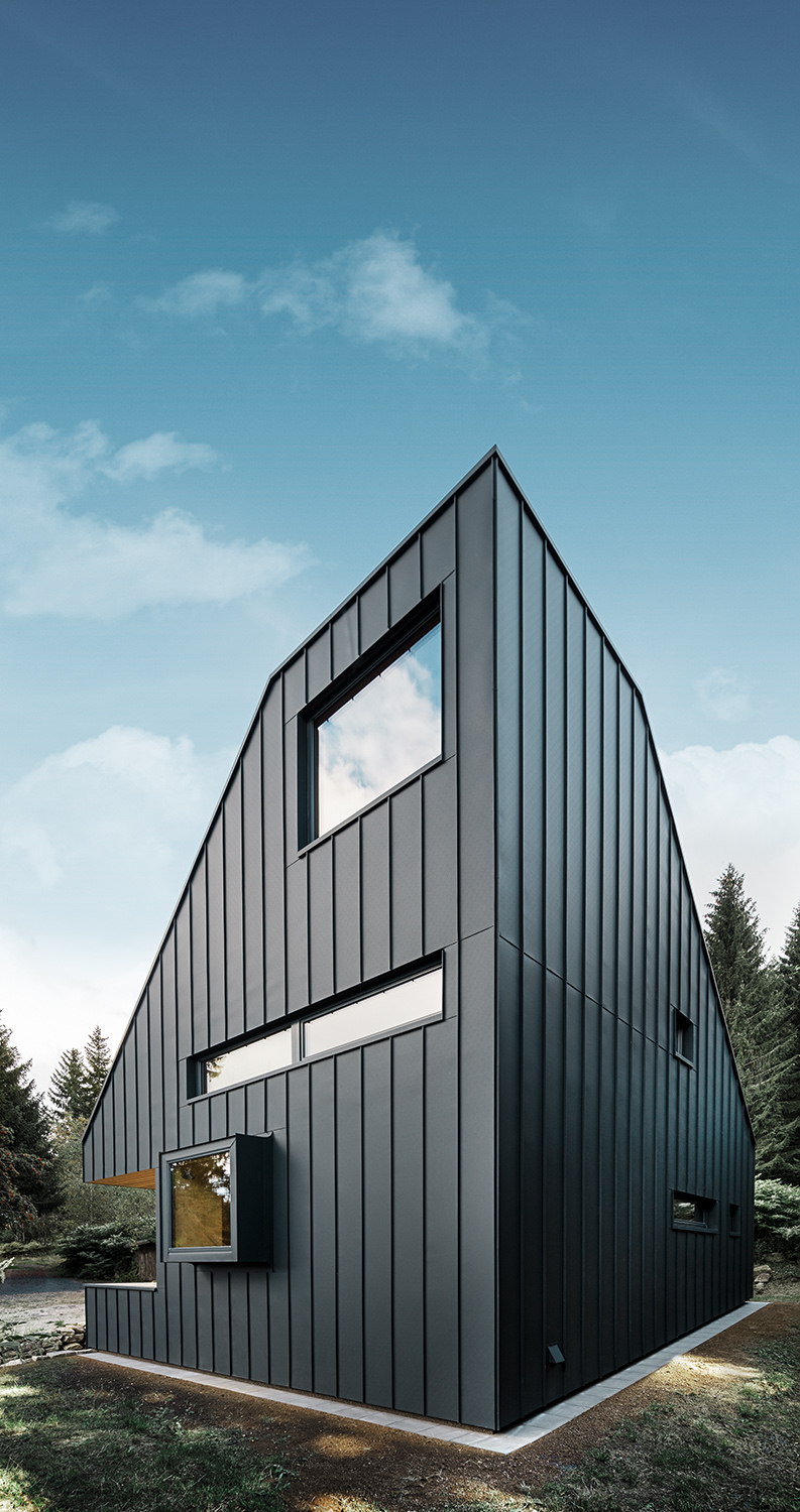 주변의 숲들을 고려하여 짙은 청녹색의 징크로 집 전체를 마무리 했습니다.