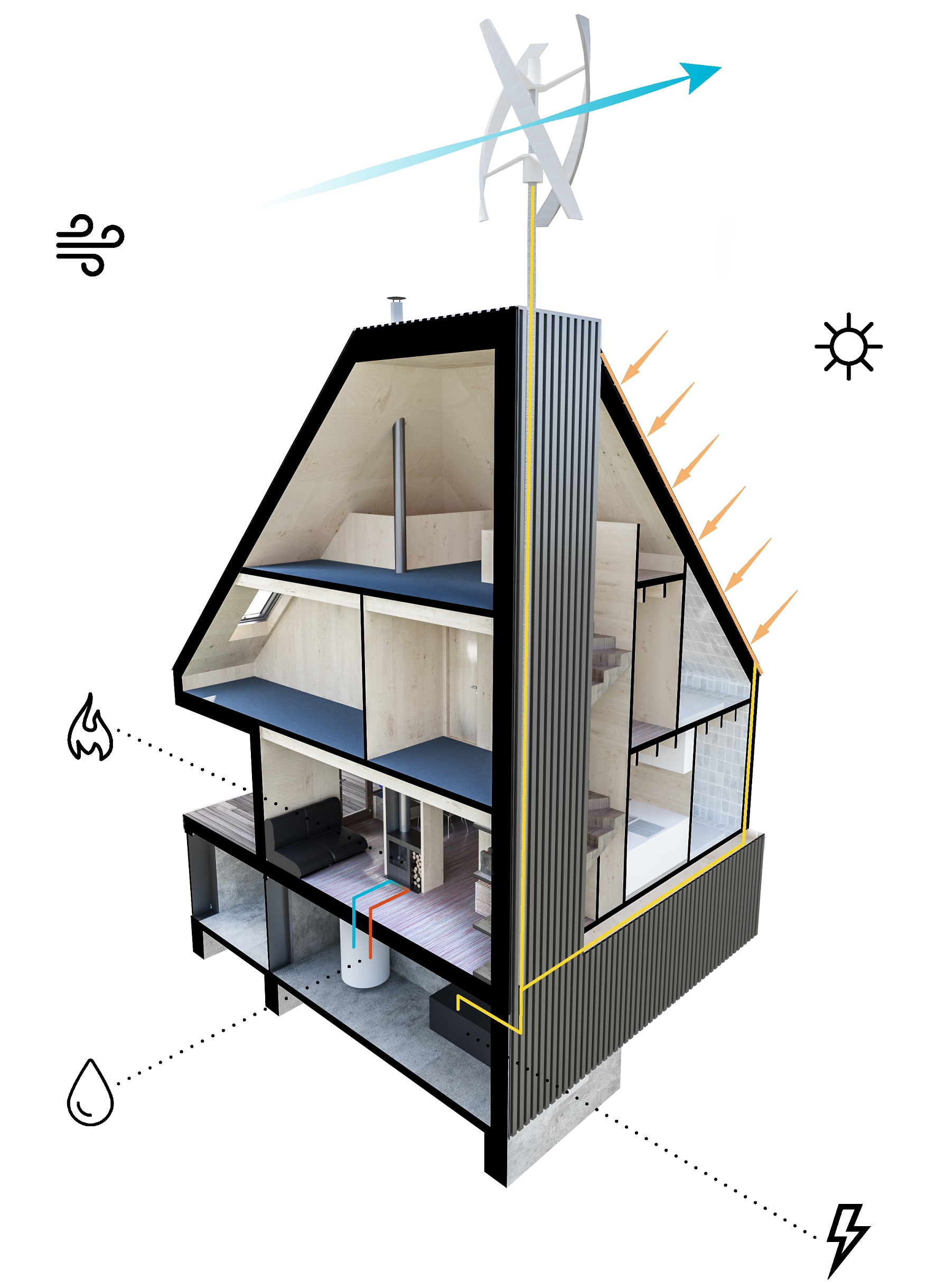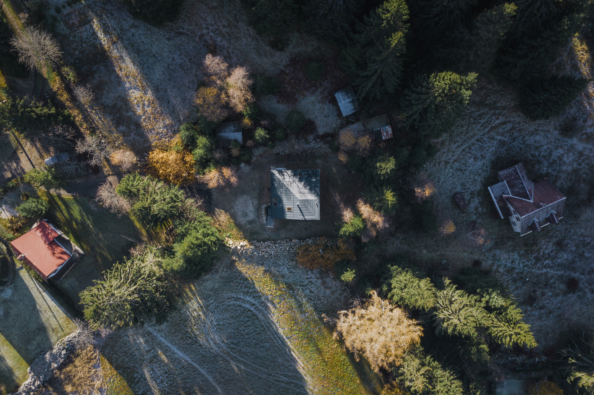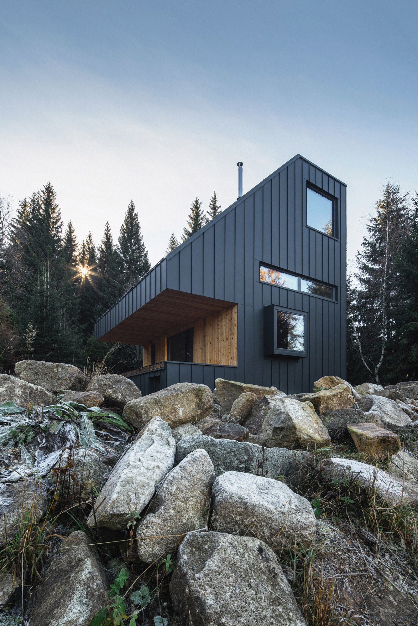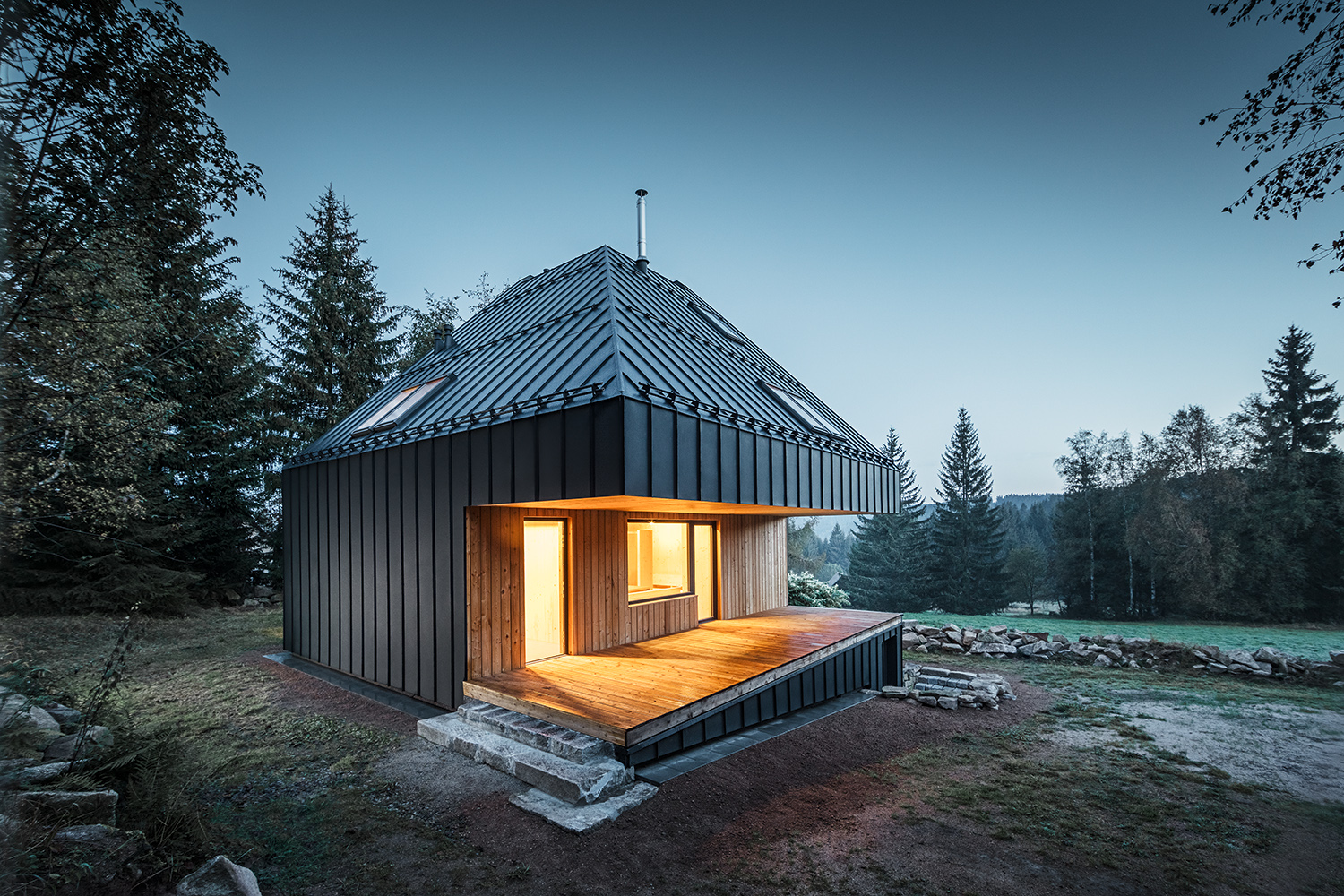 주변의 숲들을 고려하여 짙은 청녹색의 징크로 집 전체를 마무리 했습니다.