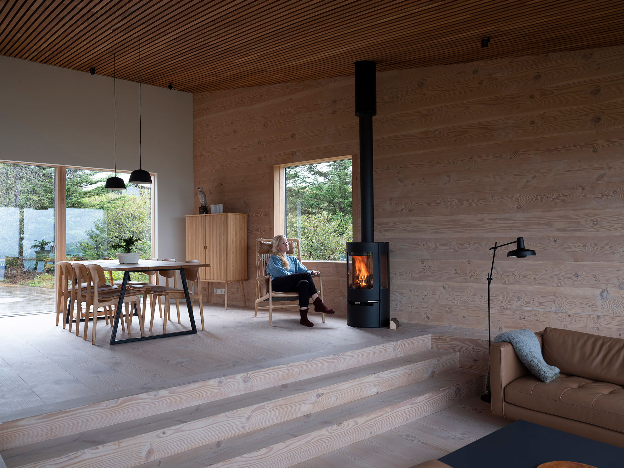 주방에서 이어지는 거실은 성큰형으로 약간 들어가 있고 그곳에서 넓은 창을 통해 호수 풍경을 한눈에 볼 수 있습니다.