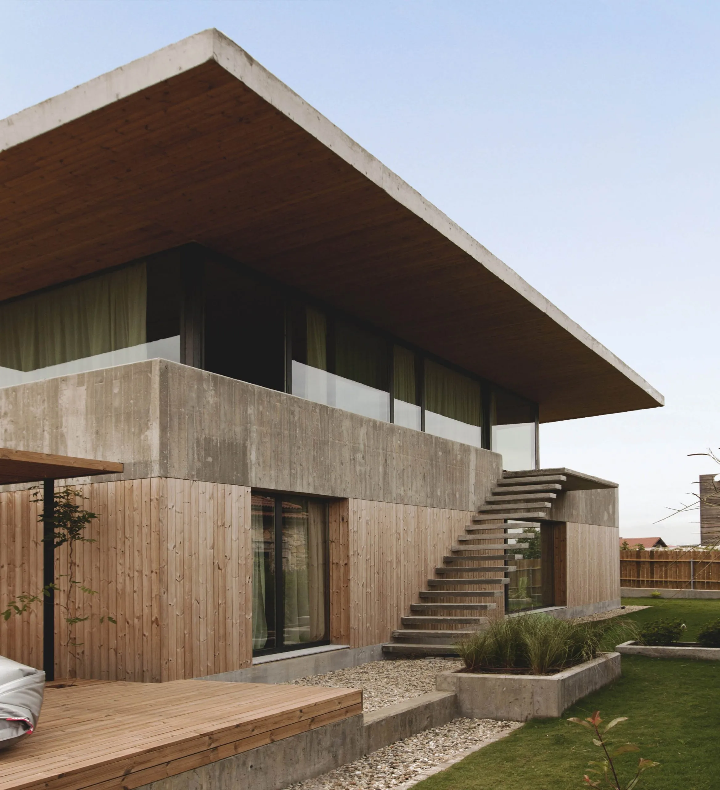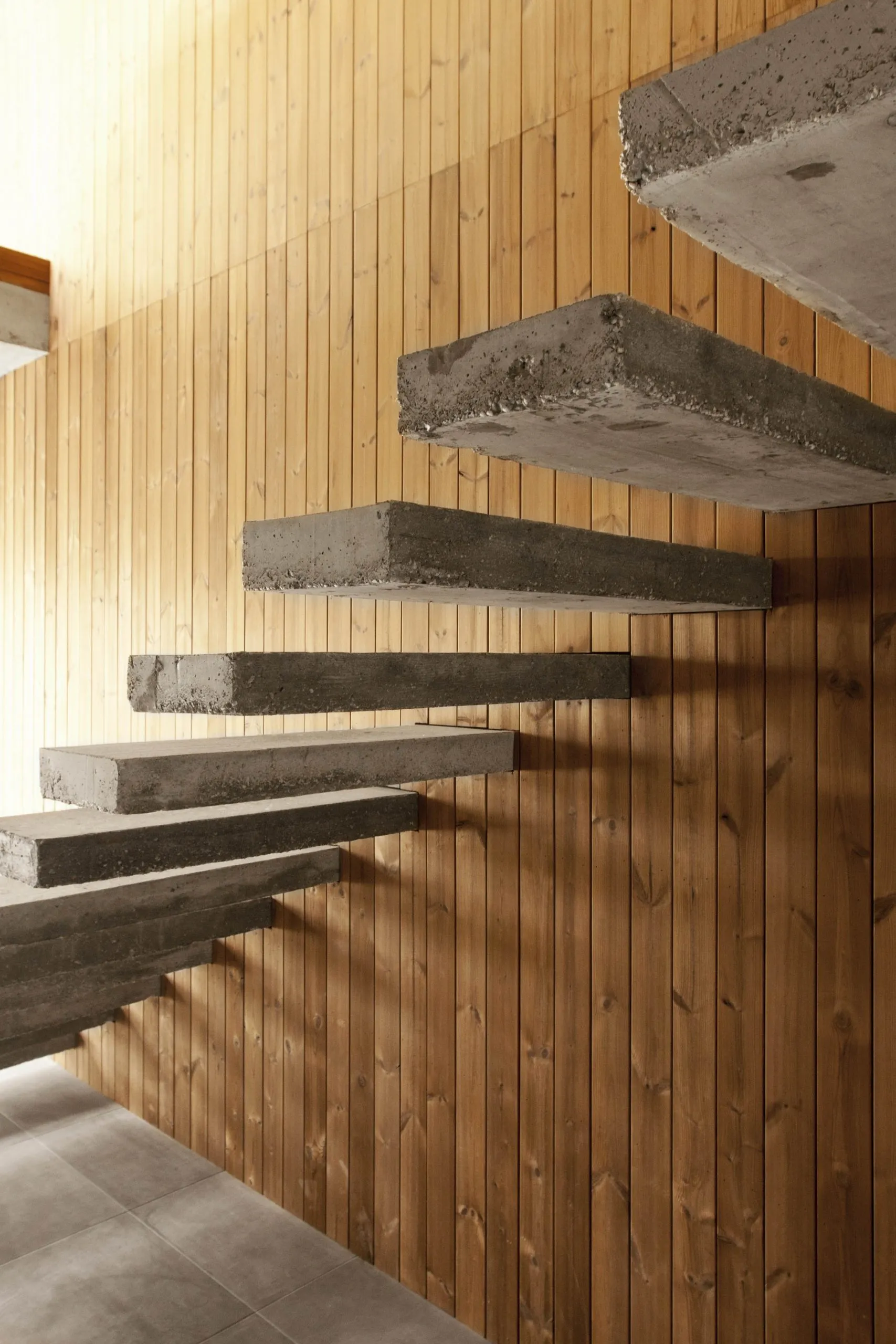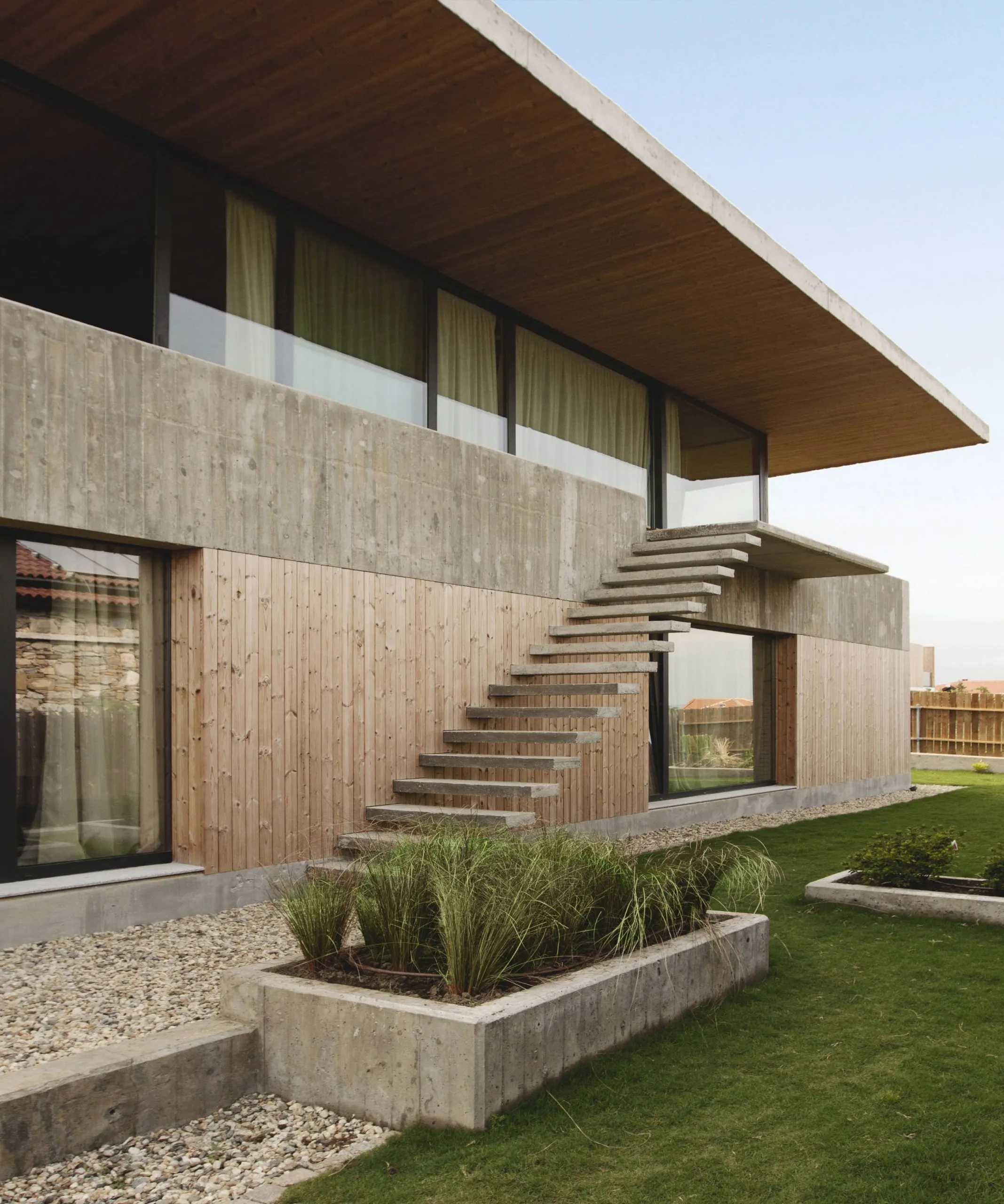 콘크리트와 목재가 잘 조합된 주택은 2층으로 심플하게 설계되었습니다.