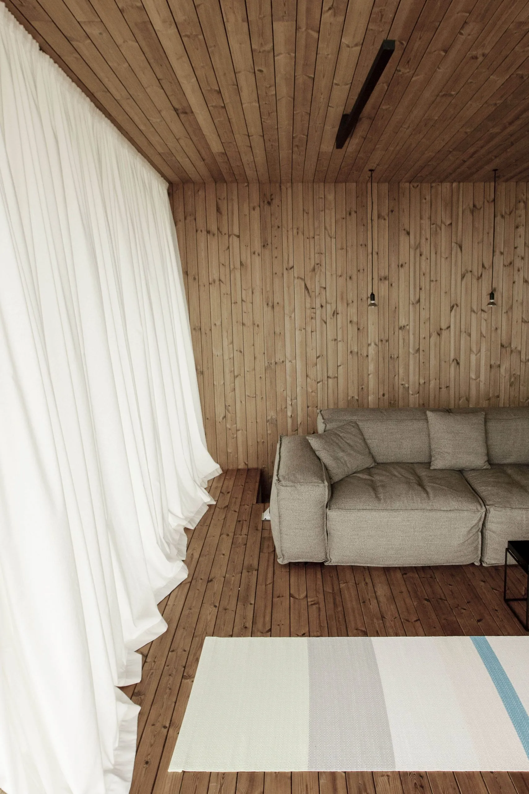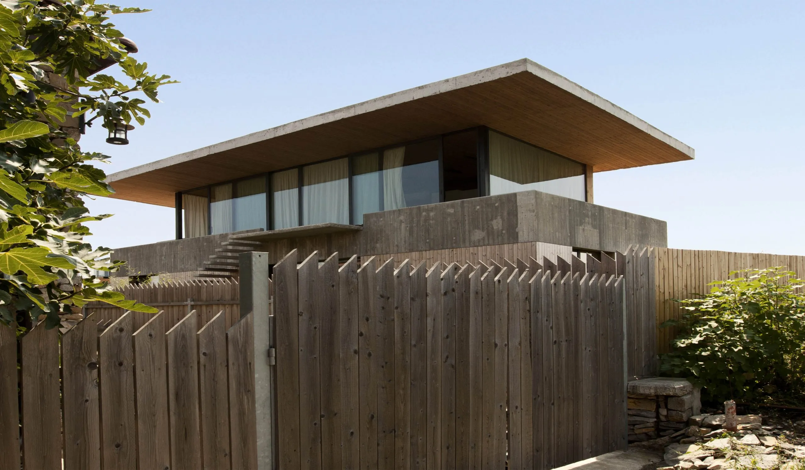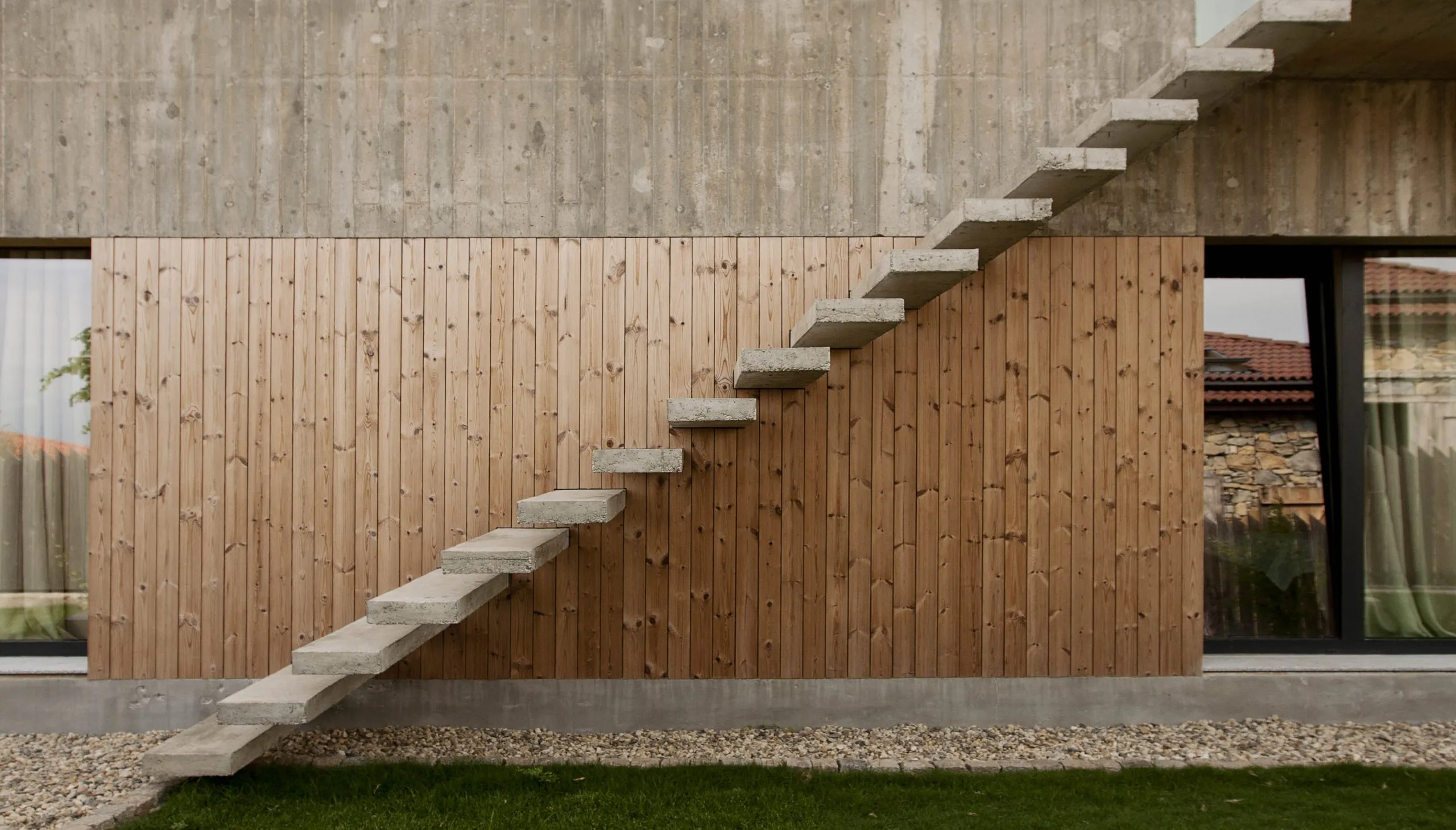 콘크리트와 목재가 잘 조합된 주택은 2층으로 심플하게 설계되었습니다.