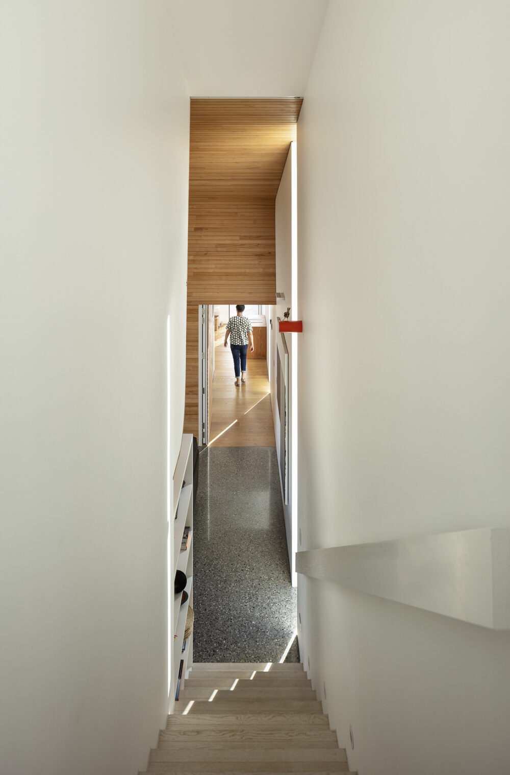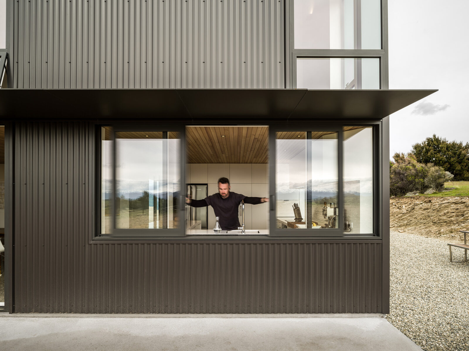 직각 삼각형 형태의 본체는 짙은 회색의 골 강판으로 마감되었고 집 뒤쪽의 차고 겸 와인 창고는 밝은 회색의 골 강판으로 마감되었습니다.
