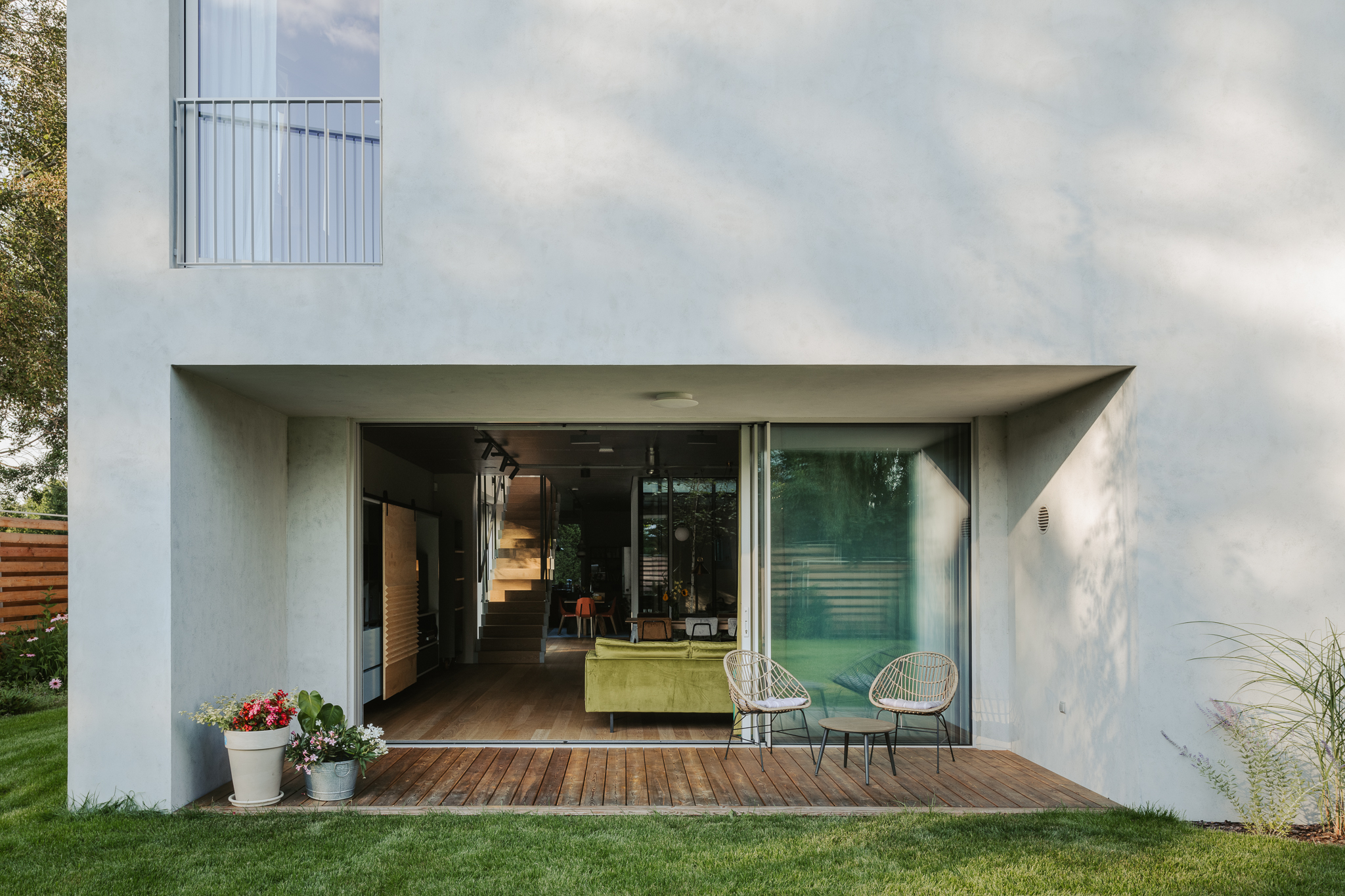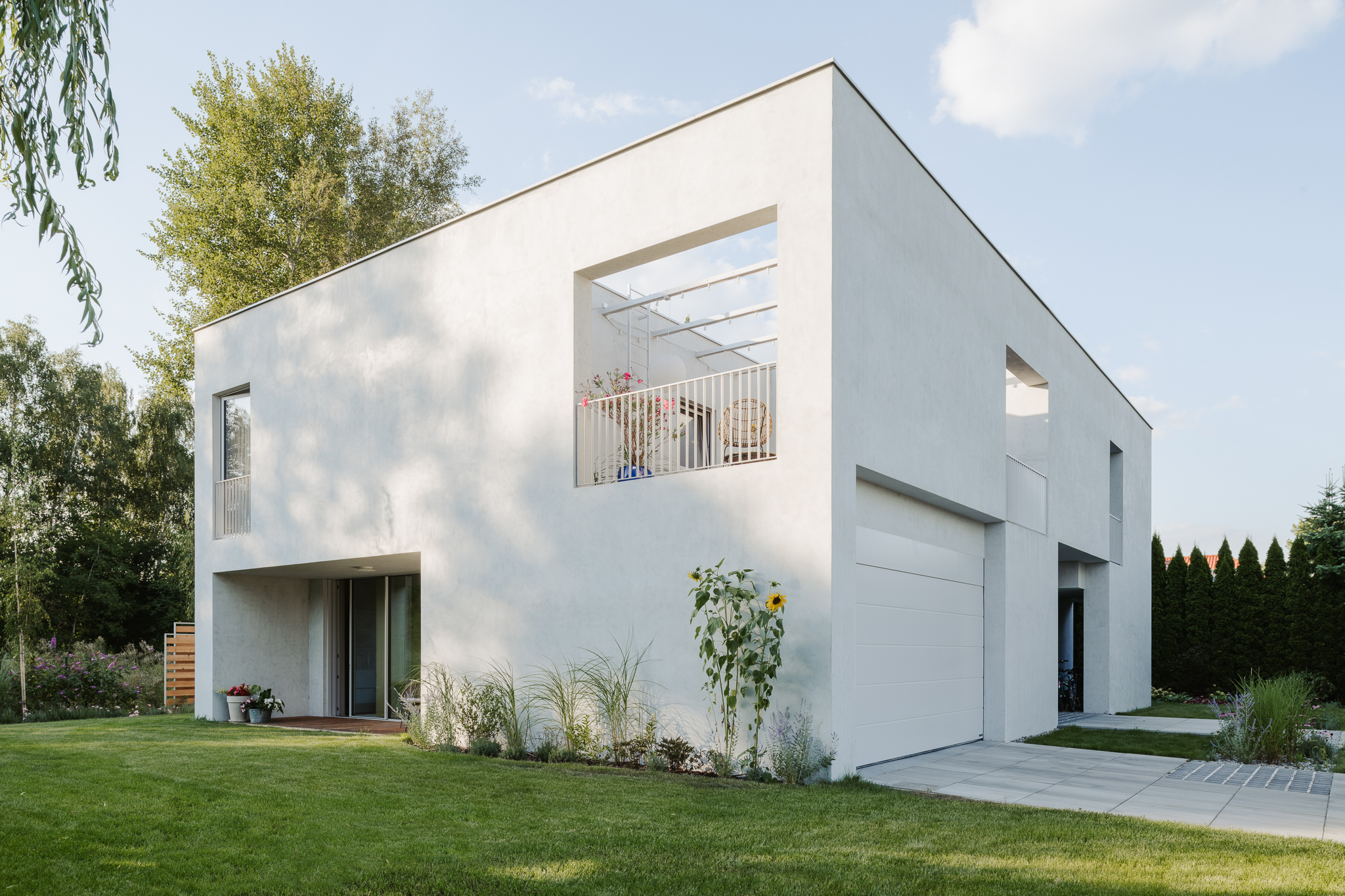 단순한 박스 형태의 집이고 회색의 조금은 삭막한 모습이지만 주변에 녹지가 잘 형성되어 있고