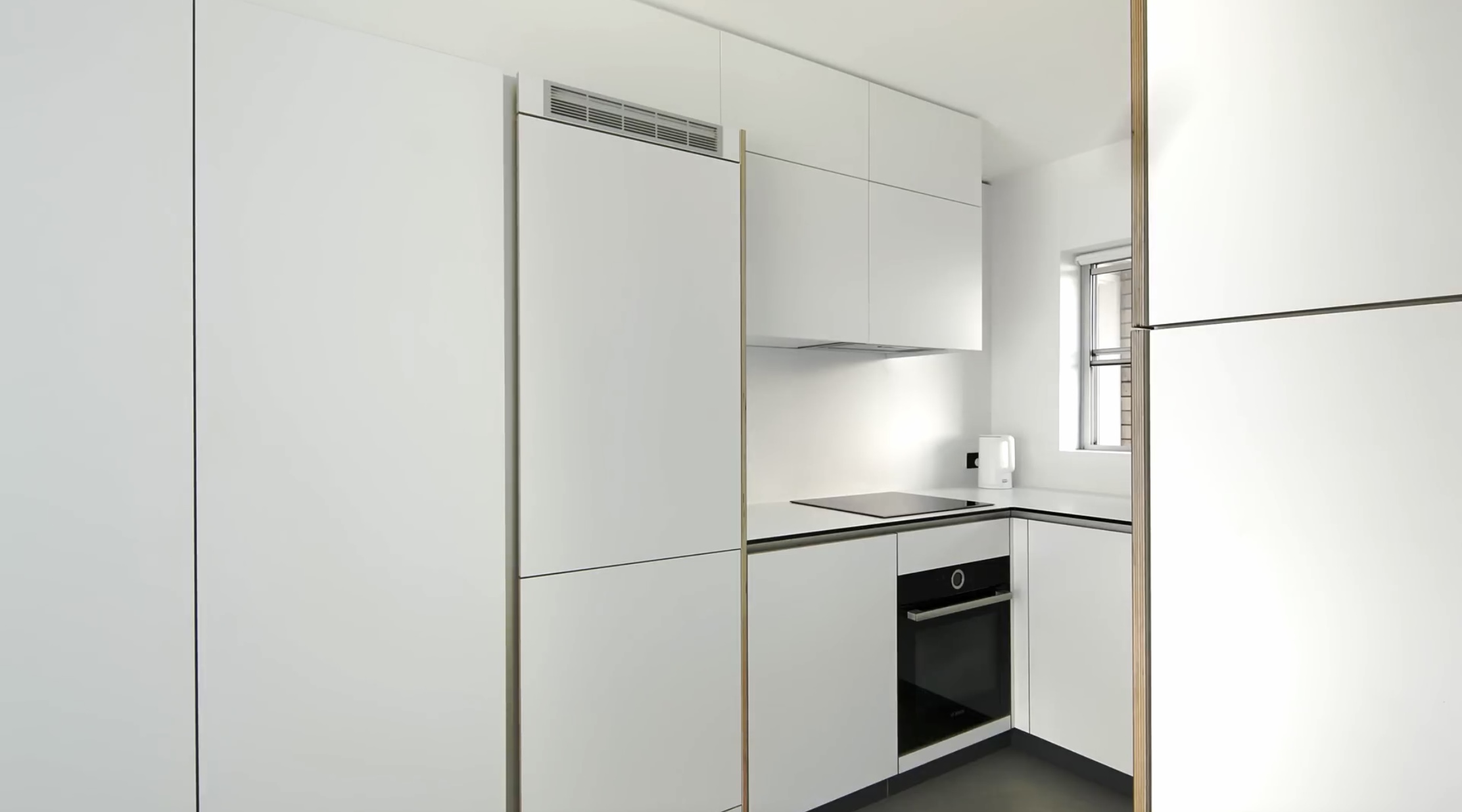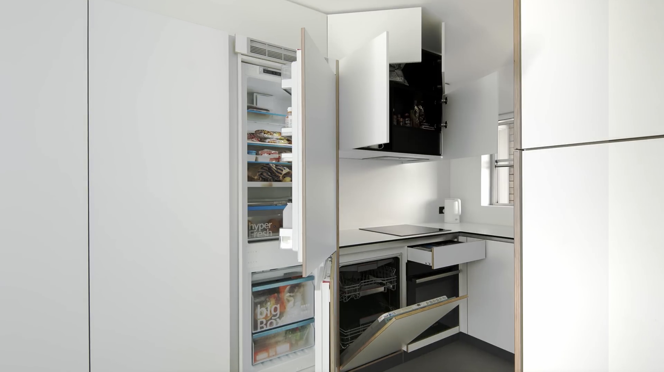 냉장고도 숨겨져 있습니다. 식기세척기와 오븐까지