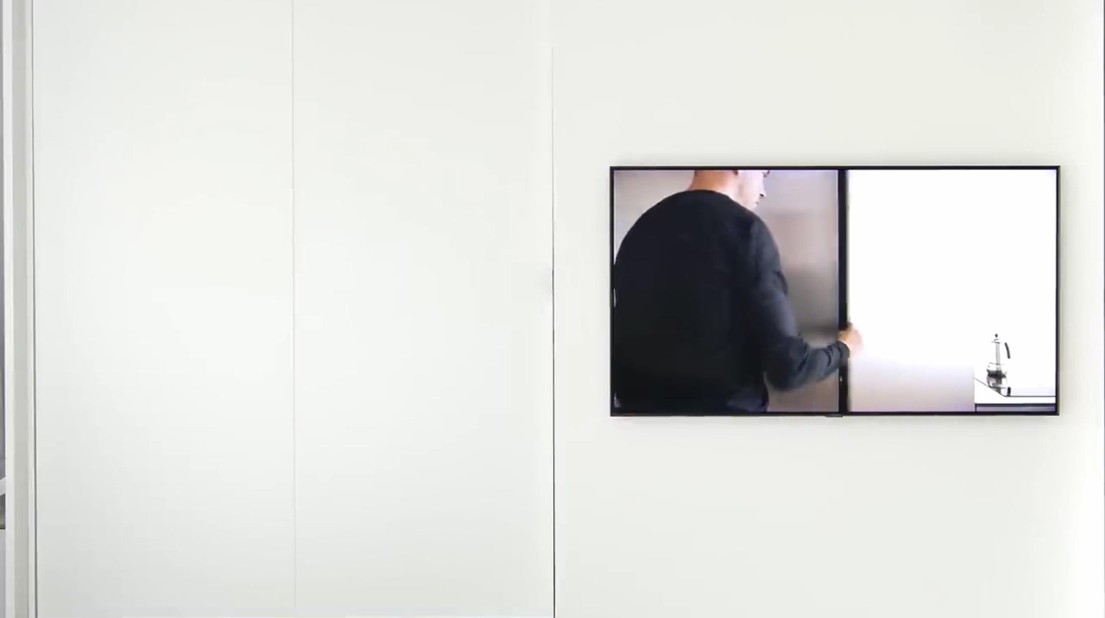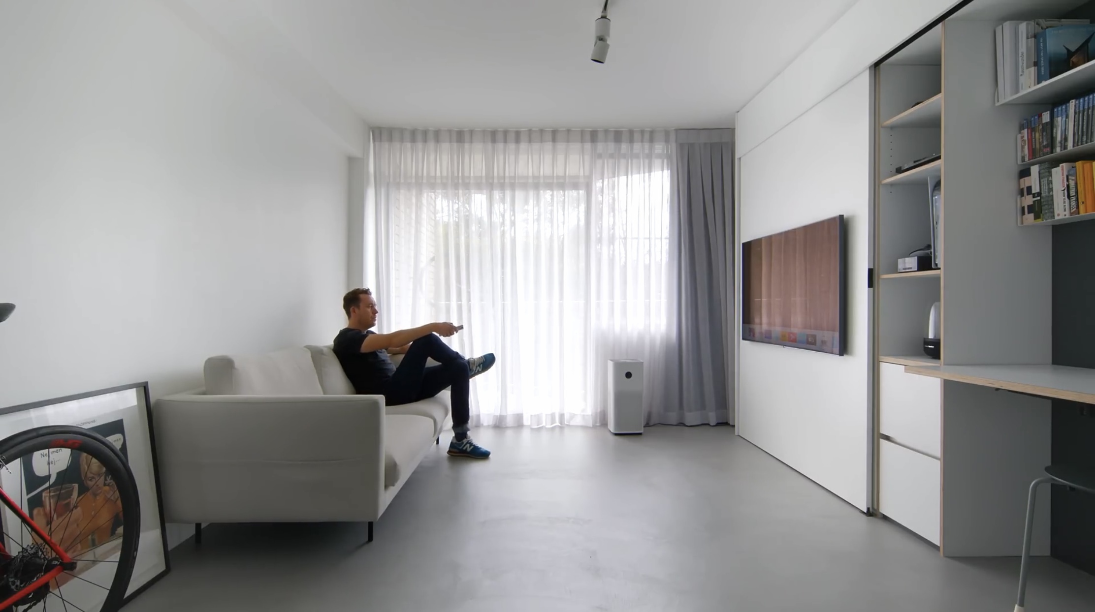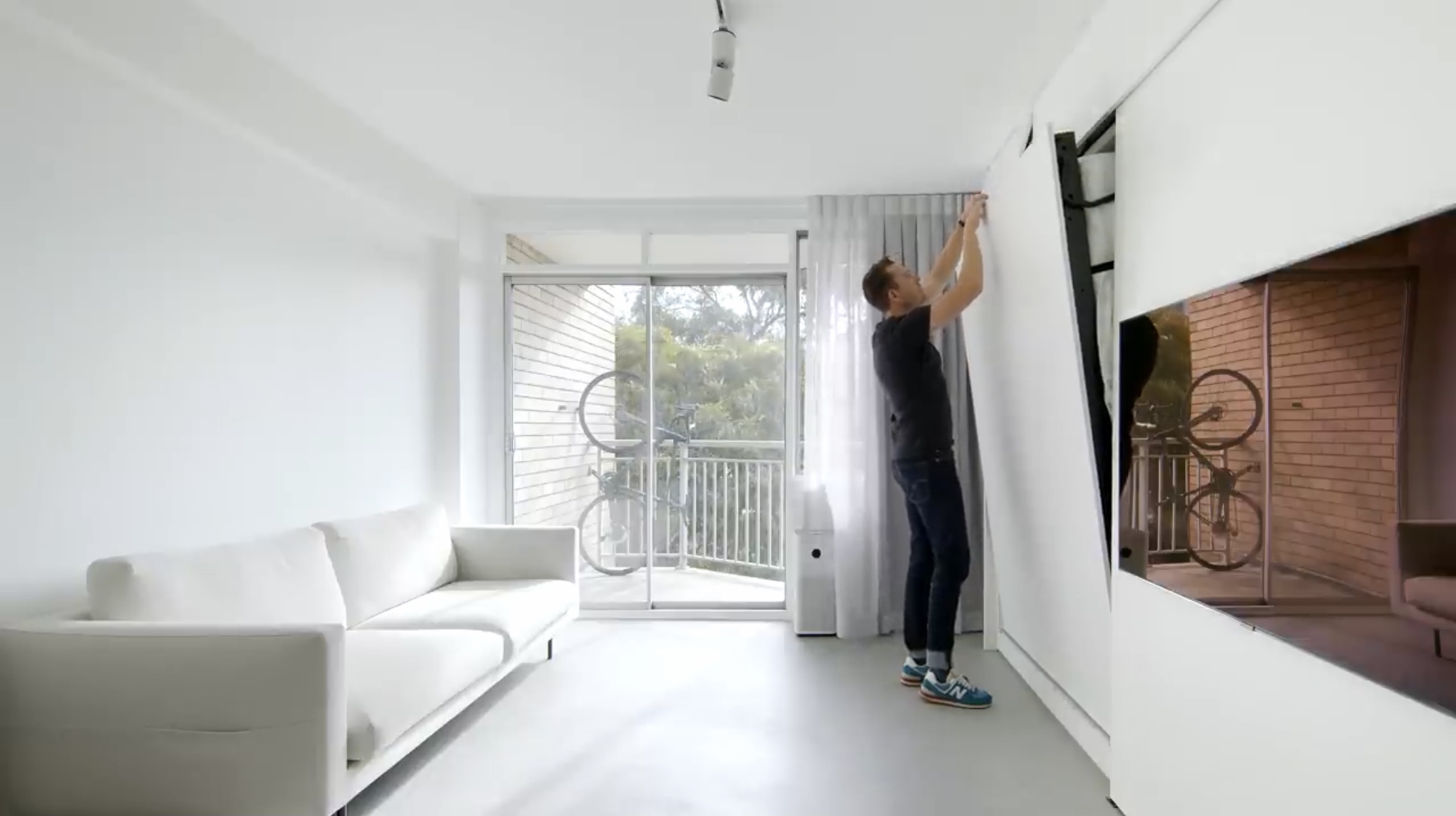 2-3인용의 화이트 소파, 벽걸이형 티브이