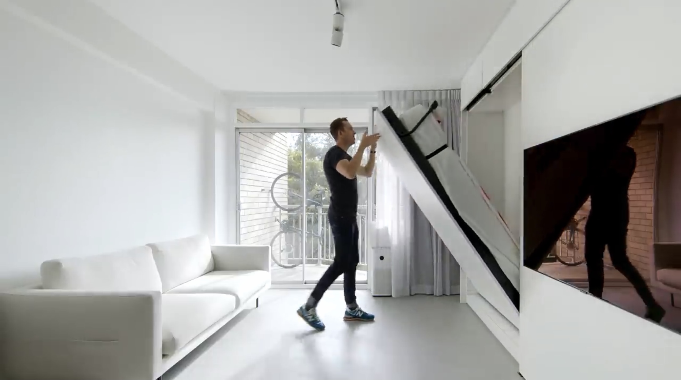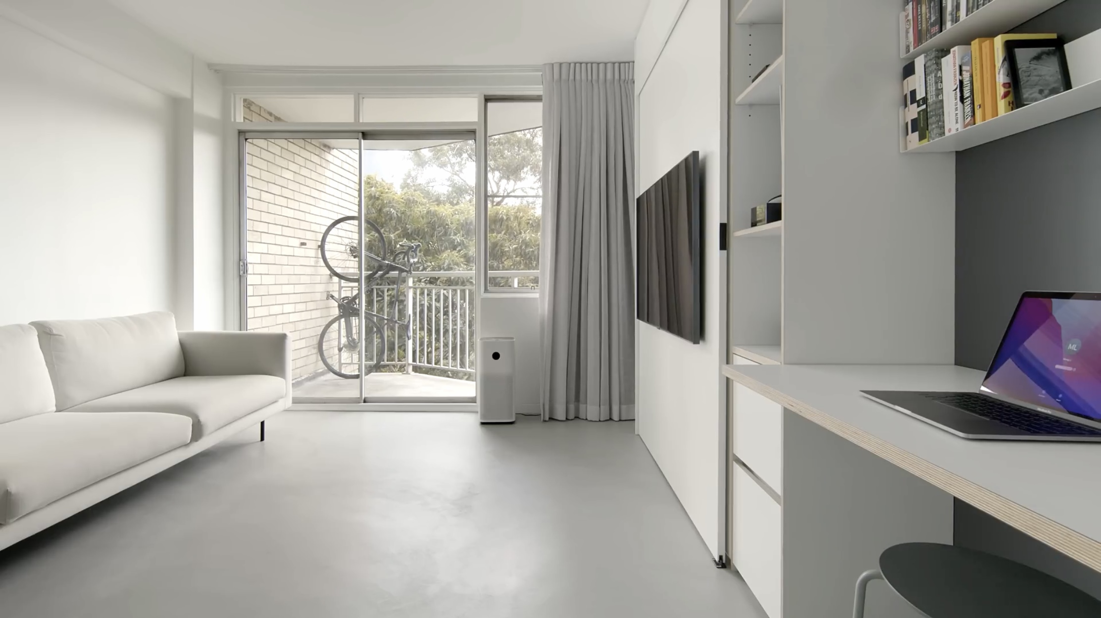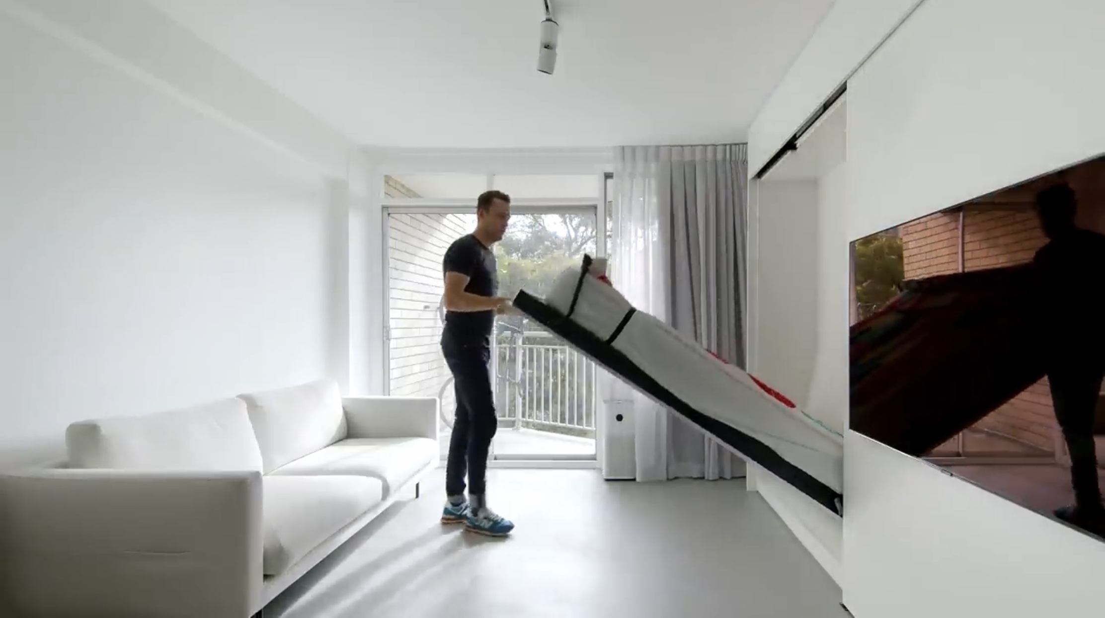 2-3인용의 화이트 소파, 벽걸이형 티브이
