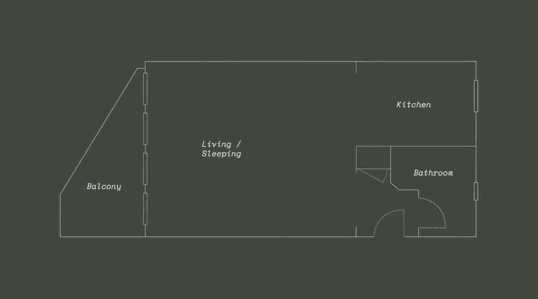 인테리어 변경 후 도면입니다. 화장실은 그대로 두고, 부엌과 거실 침실 부분이 변경되었습니다.
