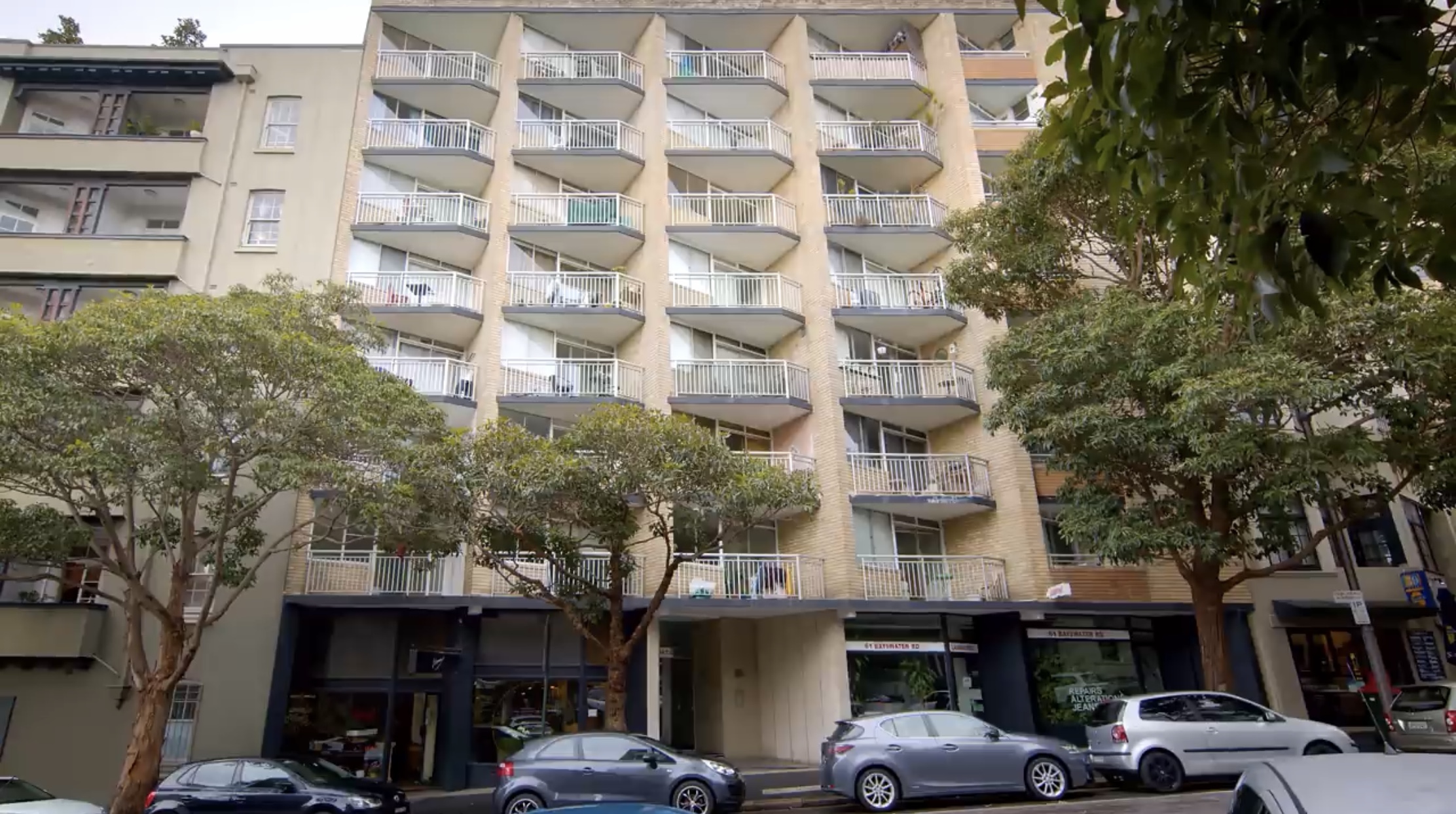 건물 외벽에는 삼각형 형태의 테라스가 보입니다.