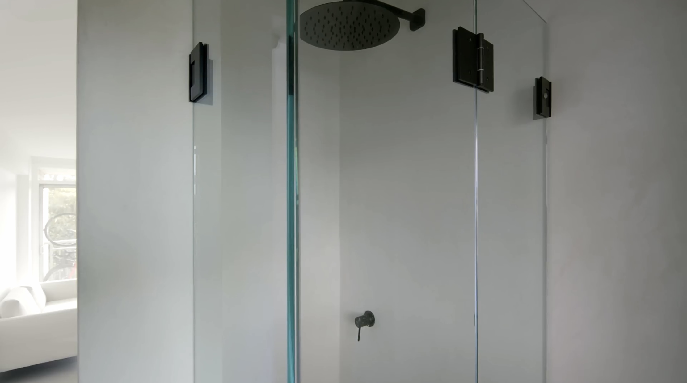 샤워부스는 유리 접이식으로 설치하여 좁은 공간에서도 샤워를 할 수 있게 설계되었습니다.