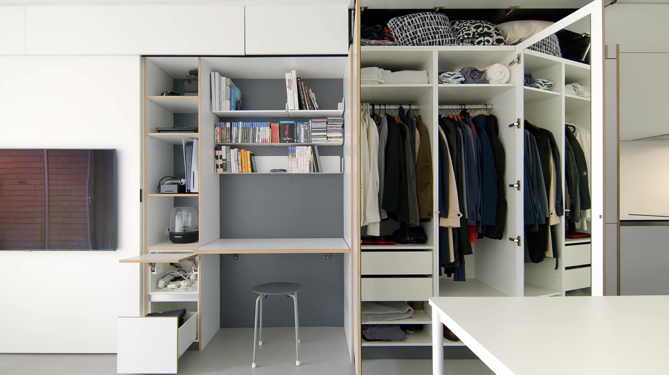 책상 옆으로는 붙박이 장이 설치되어 옷 수납이 가능합니다.