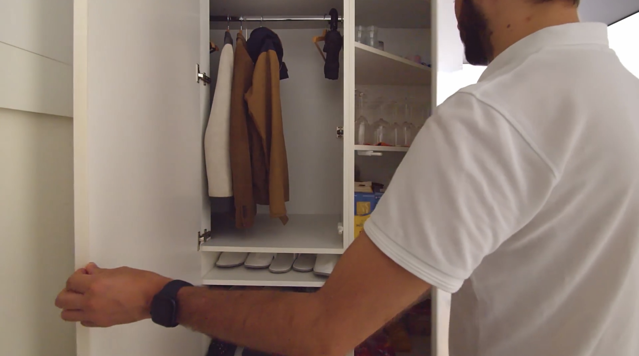 외투 및 우산, 컵과 식료품 등이 수납되어 있습니다.