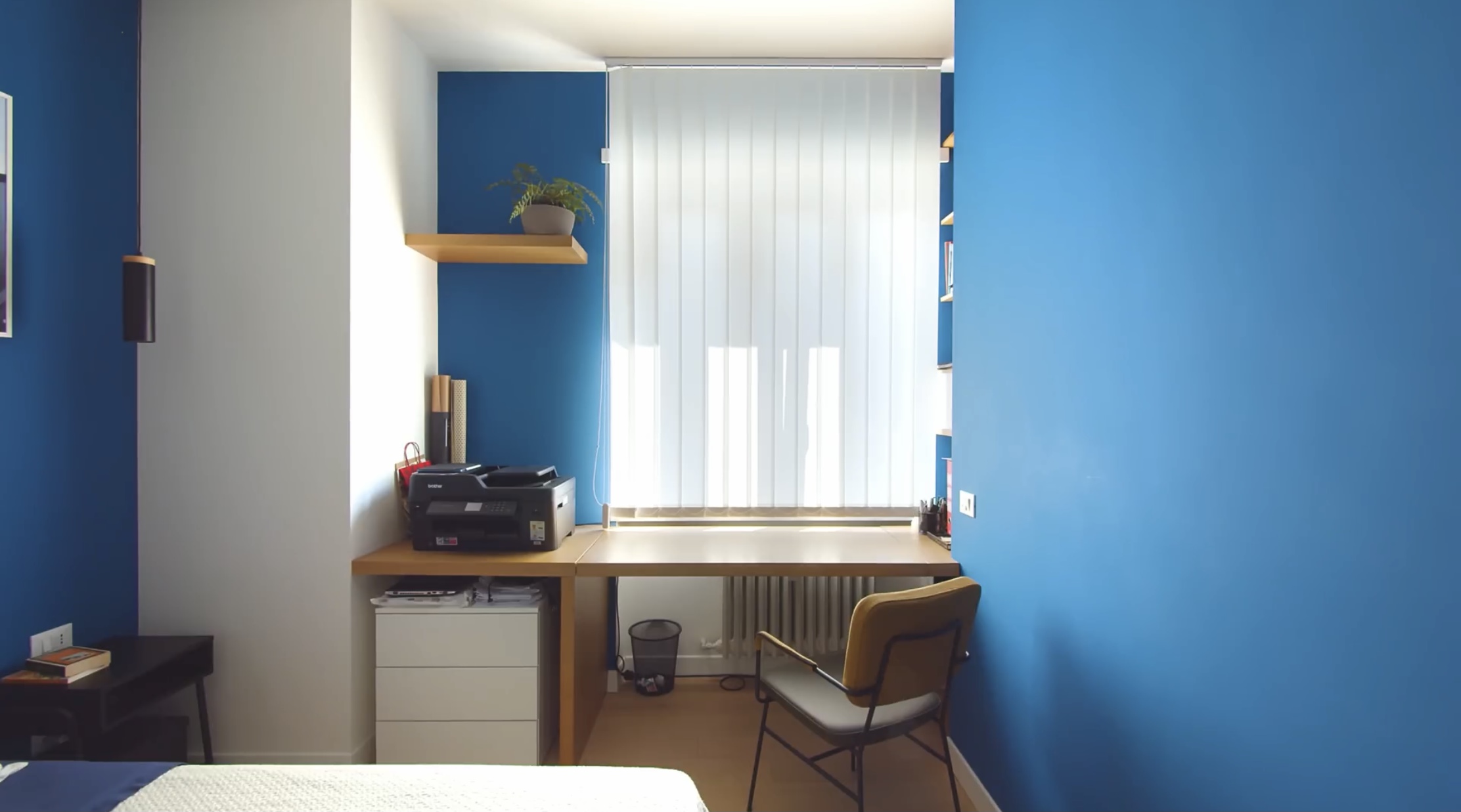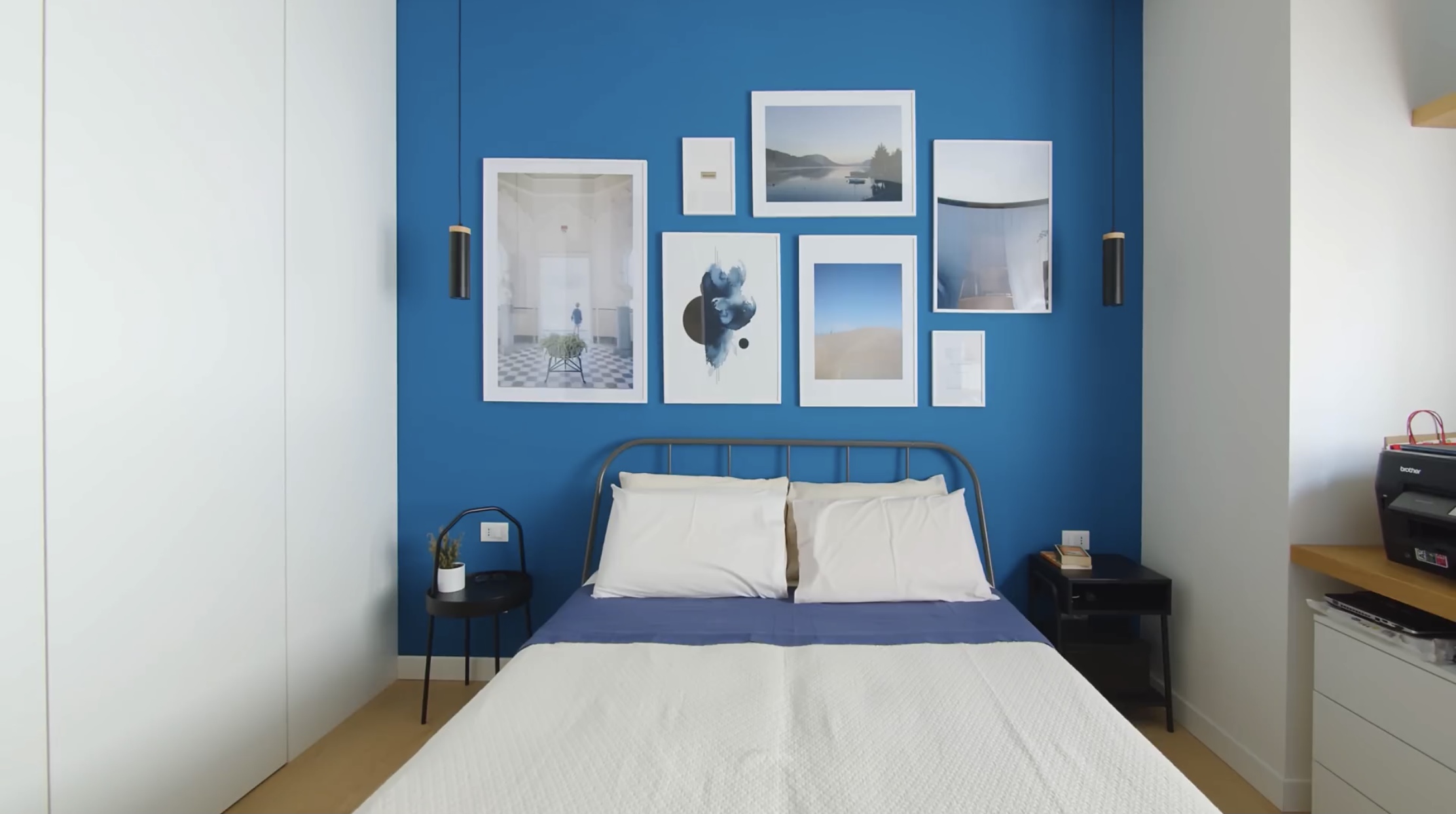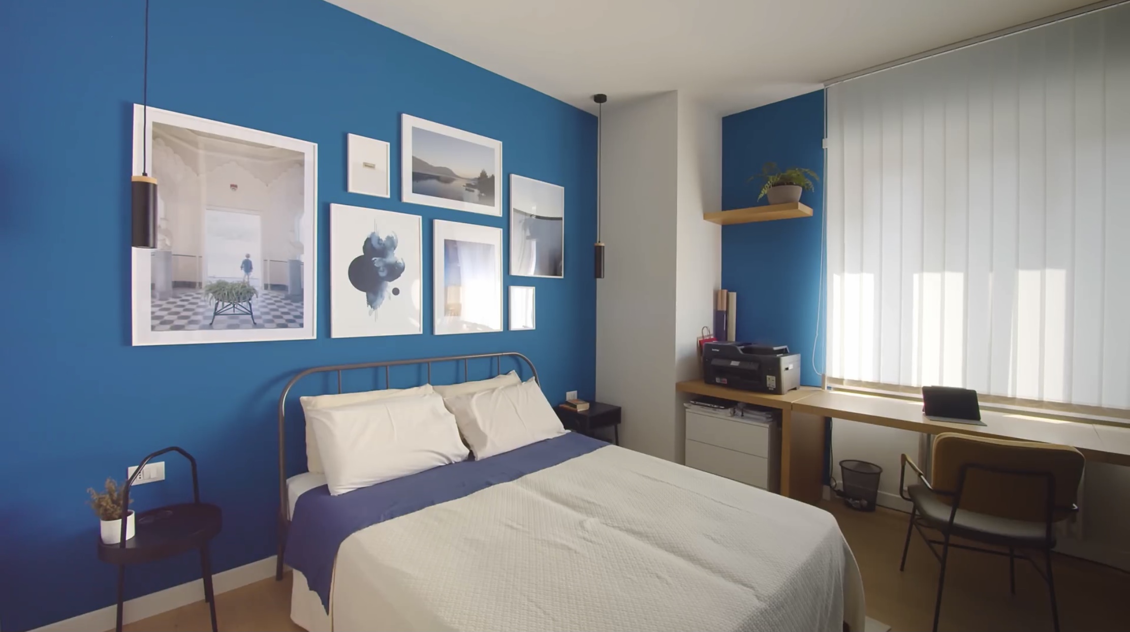 만약 모든 벽면이 파란색이었다면 좋지 않았을 텐데 포인트 줄 부분만 파란색으로 칠해져 있어서 침실에 생기가 가득해 보입니다.