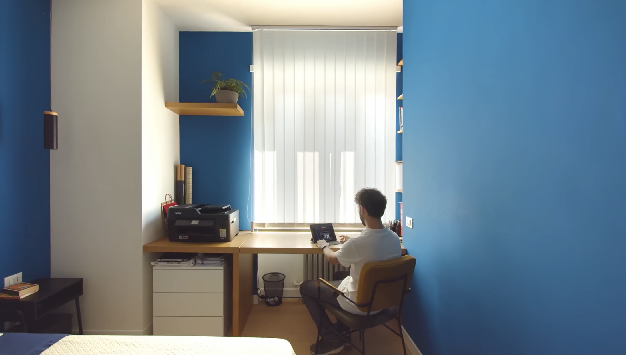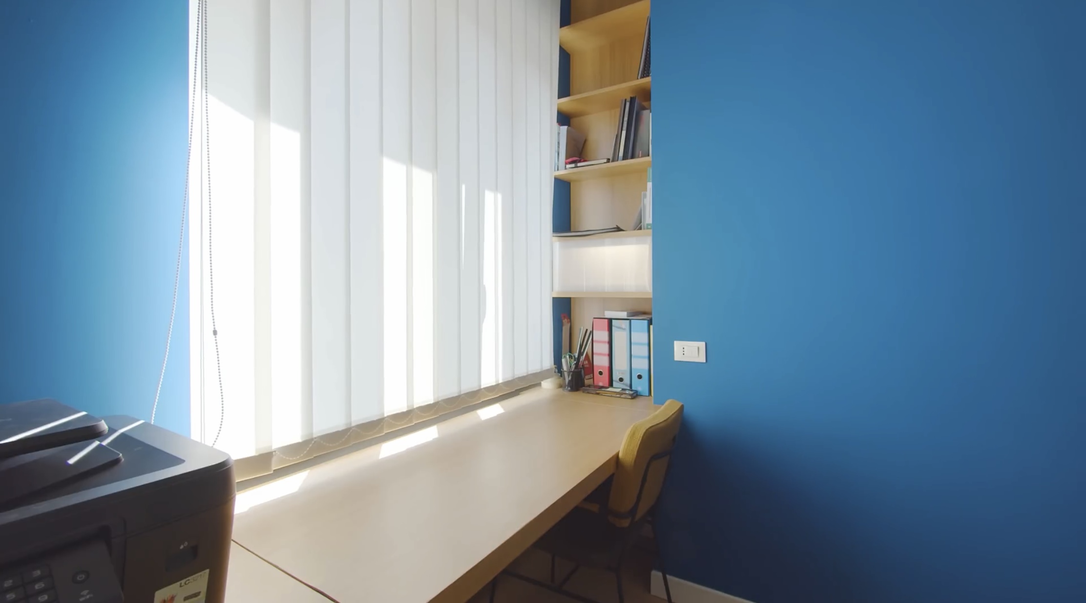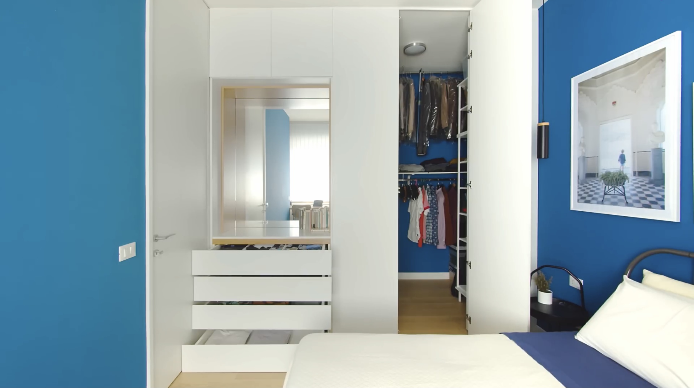만약 모든 벽면이 파란색이었다면 좋지 않았을 텐데 포인트 줄 부분만 파란색으로 칠해져 있어서 침실에 생기가 가득해 보입니다.