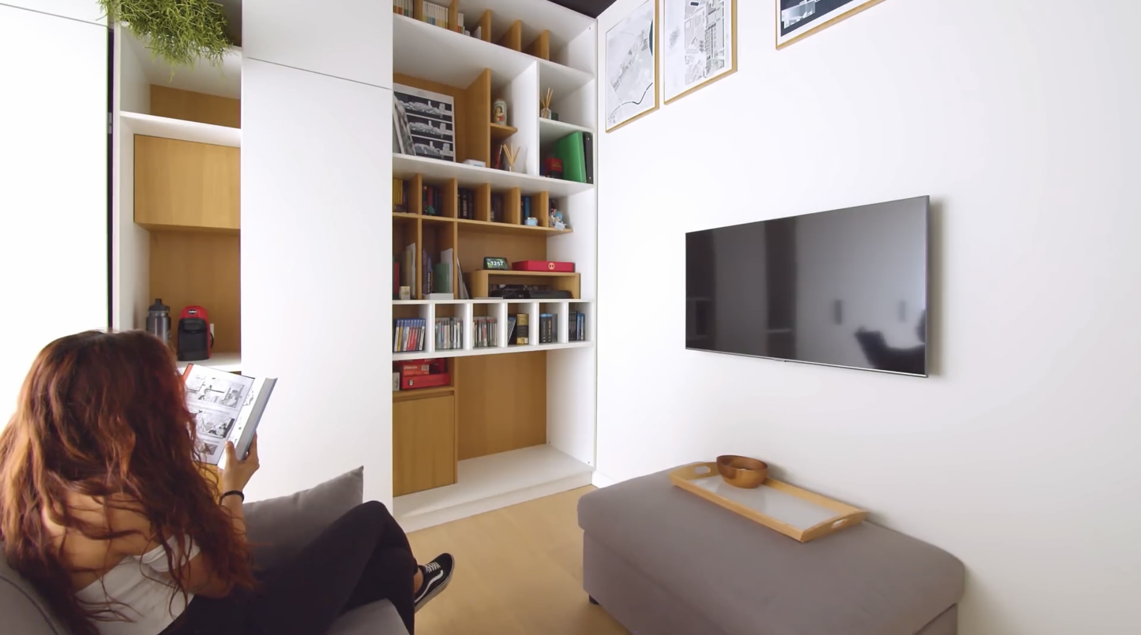 소파와 티브이, 벽면 책장과 수납장? 이 보입니다.