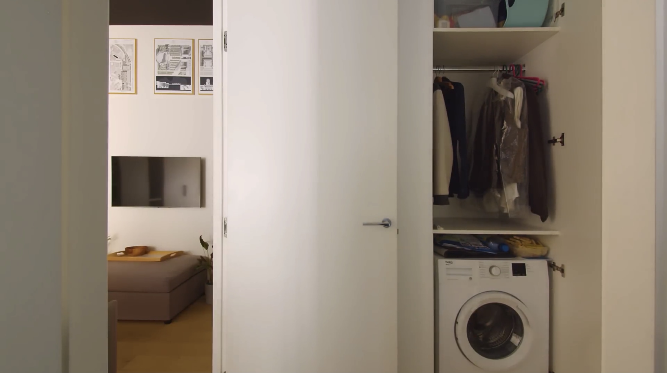 침실로 가는 길 스토리지에 세탁기가 숨겨져 있습니다.