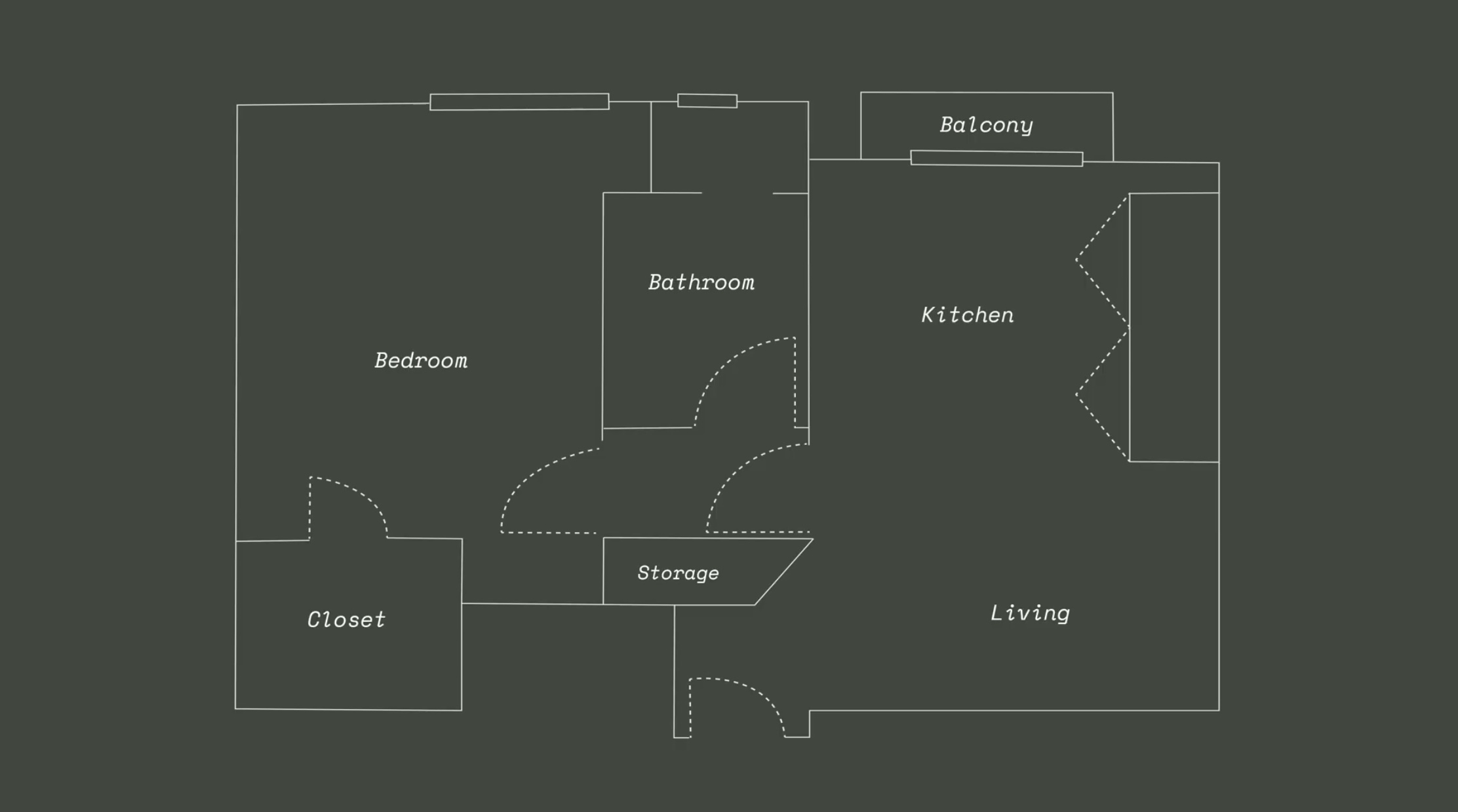 입구로 들어서면 거실과 부엌, 스토리지 뒤편으로 화장실이 있습니다. 화장실을 지나면 침실이 있습니다.