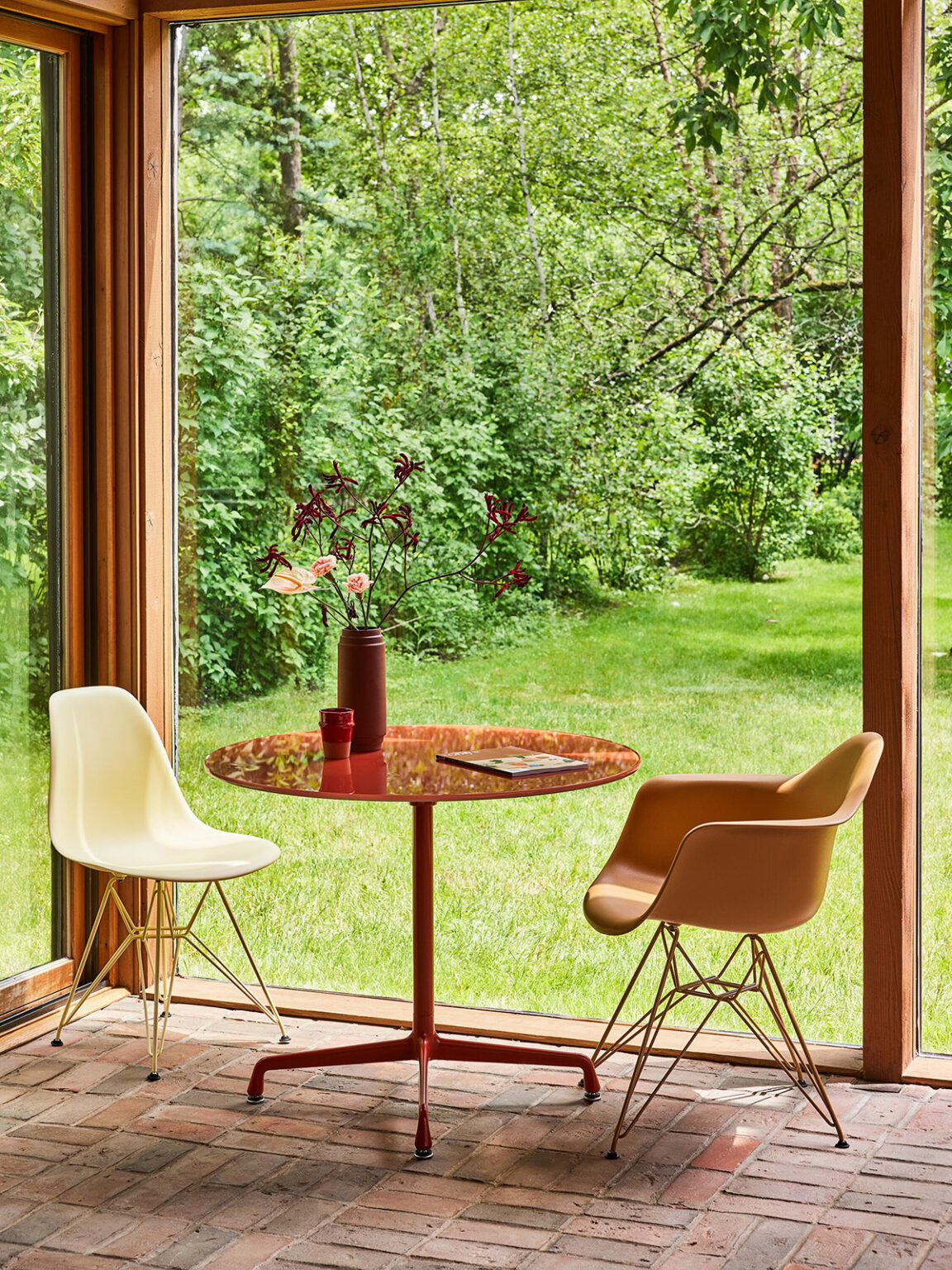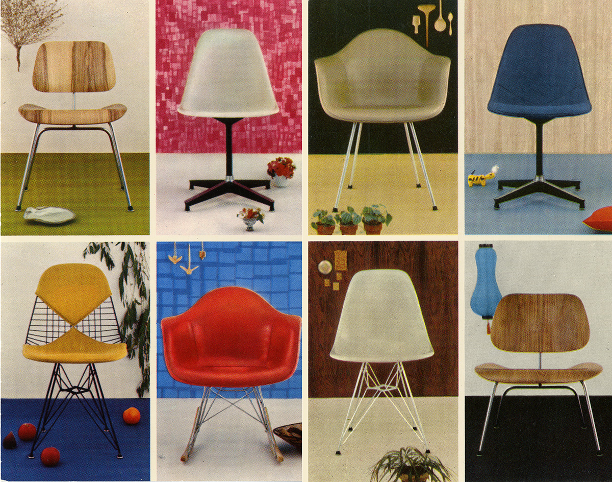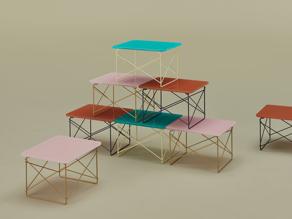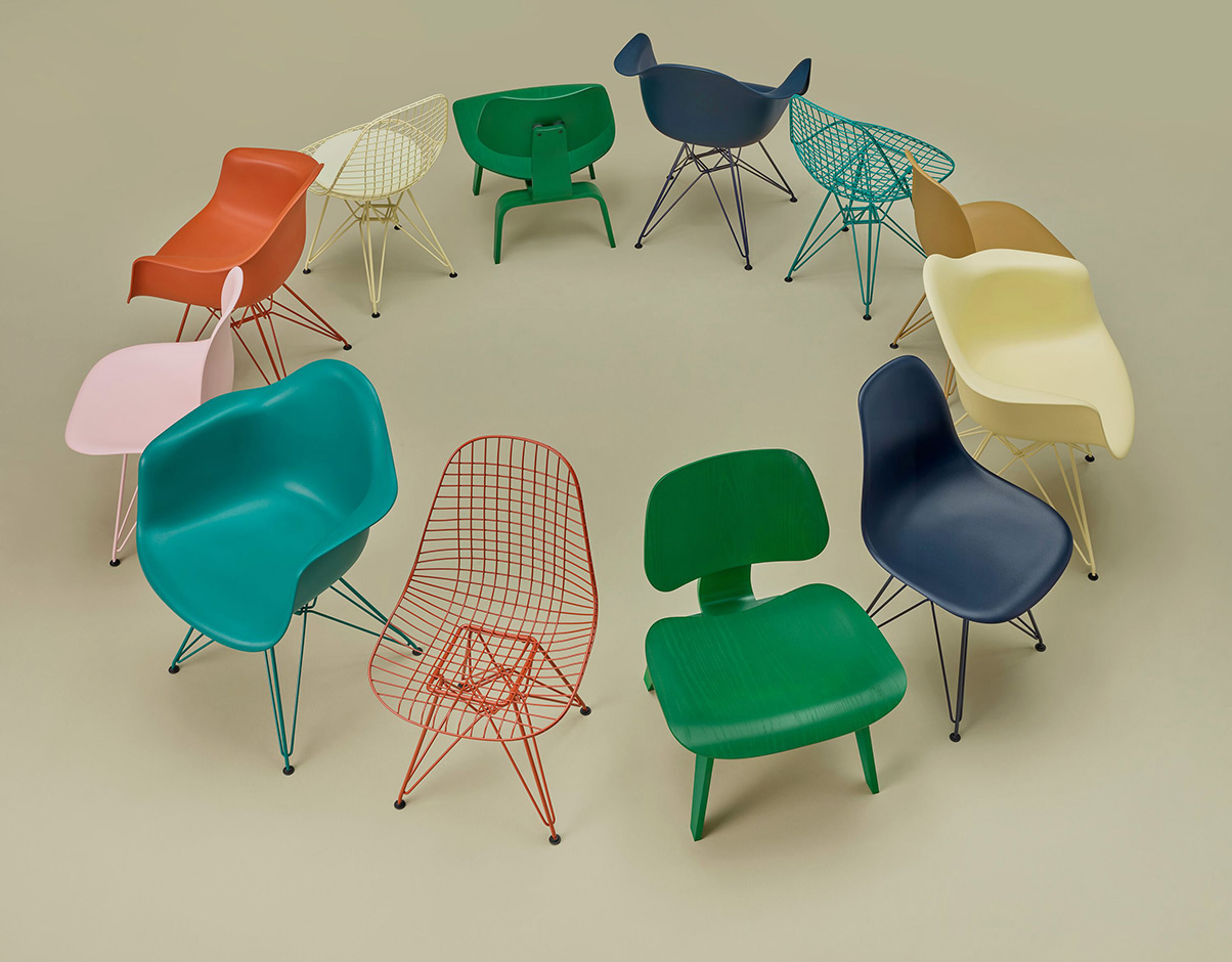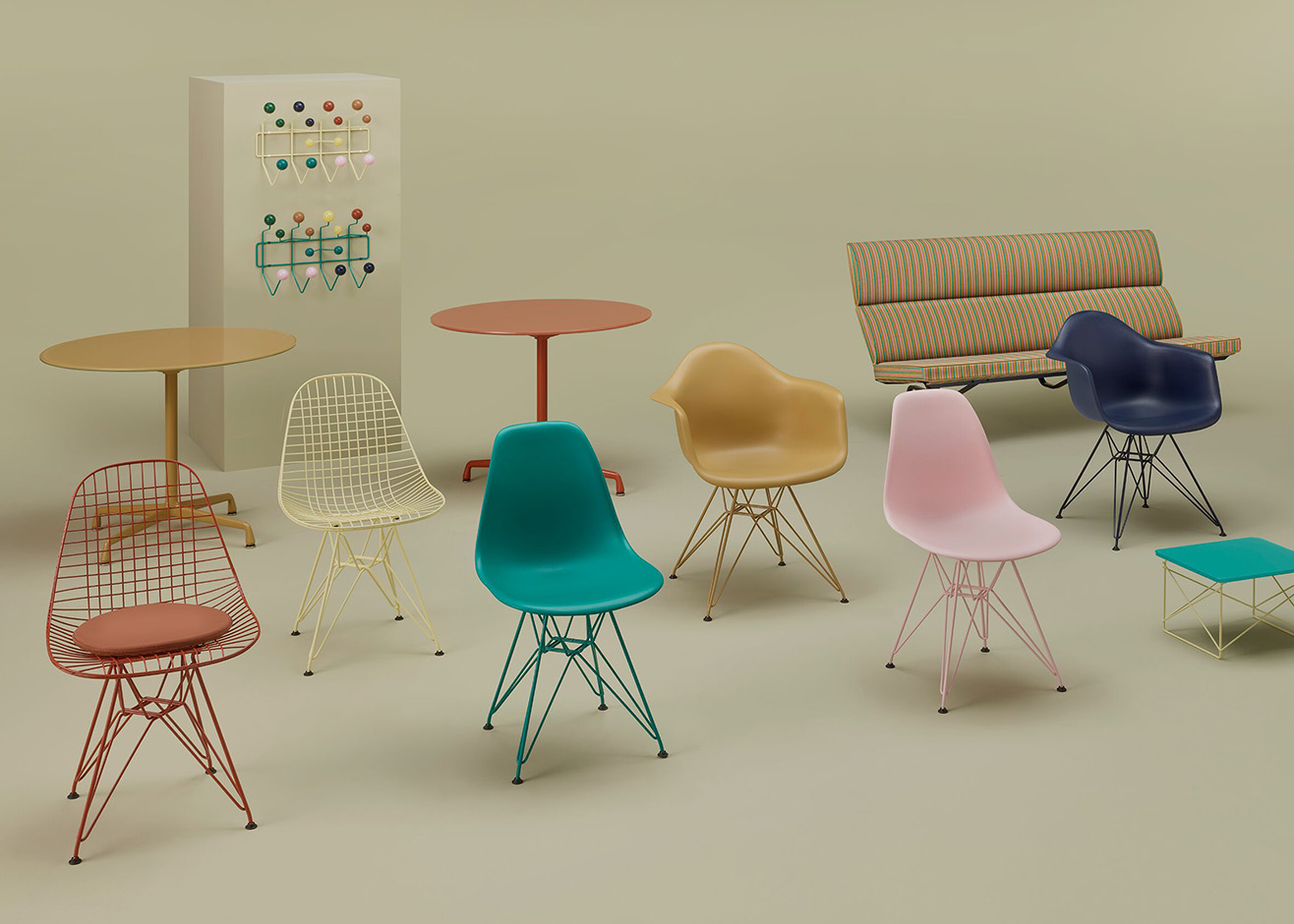 Eames 테이블과 와이어 의자는 파우더 코팅 다리와 야외 직물로 덮개를 씌운 쿠션 옵션과 함께 외부 사용을 위해 업그레이드되었습니다. 그리고 빛 자체가 재료가 될 수 있는 유리의 추가도 있습니다: Eames Hang-It-All의 그려진 나무 공은 주조 유리 구체로 교체되었으며 와이어 베이스 로우 테이블과 유니버설 베이스 라운드 테이블은 이제 캐스트 유리 슬래브 탑을 특징으로 합니다. 환경 책임을 향한 움직임에서, 주로 모방된 성형 플라스틱 쉘 의자는 이제 100% 산업화 이후의 재활용 플라스틱을 함유하고 있다.