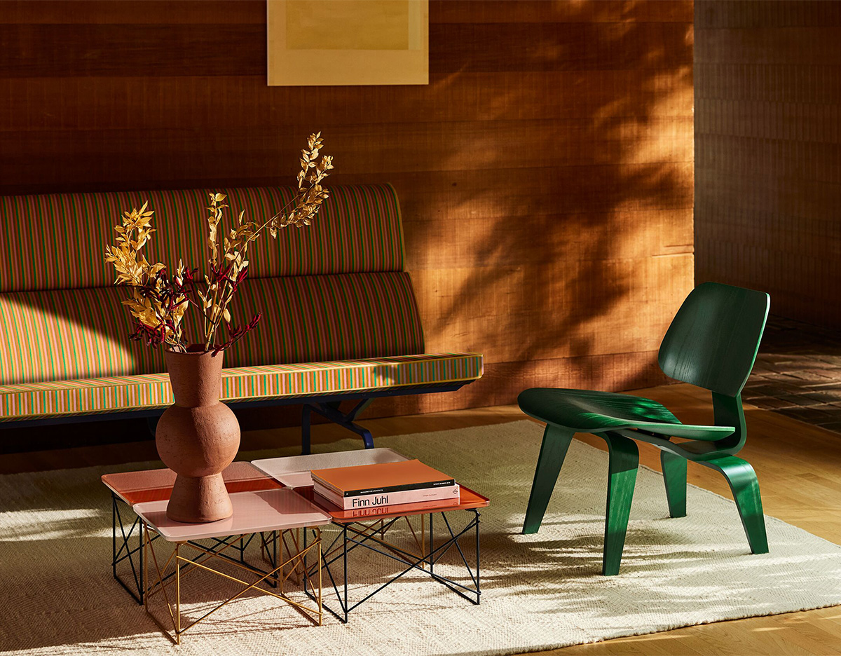 소형 임스 소파의 신판은 지라드의 제이콥 코트 섬유로 덮개를 씌워져 있으며, 이 컬렉션을 위해 특별히 재발행되었다. 그리고 토피, 아이언 레드, 파우더 옐로우를 포함한 7개의 새로운 컬러웨이가 조각들을 활기차게 한다. 덴마크의 거실에 프로토타입 중 하나를 가지고 있는 헤이스가 가장 좋아하는 성형 합판 의자는 이제 다른 HAY 제품에서 자주 사용되는 에메랄드그린의 포화 그늘에 존재한다.