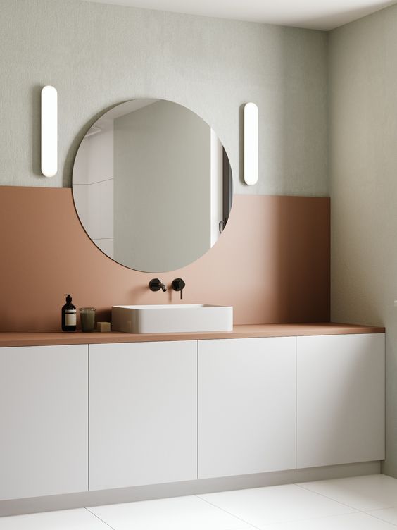 화이트 서랍장과 세면대, 수전은 블랙과 짙은 베이지 벽면