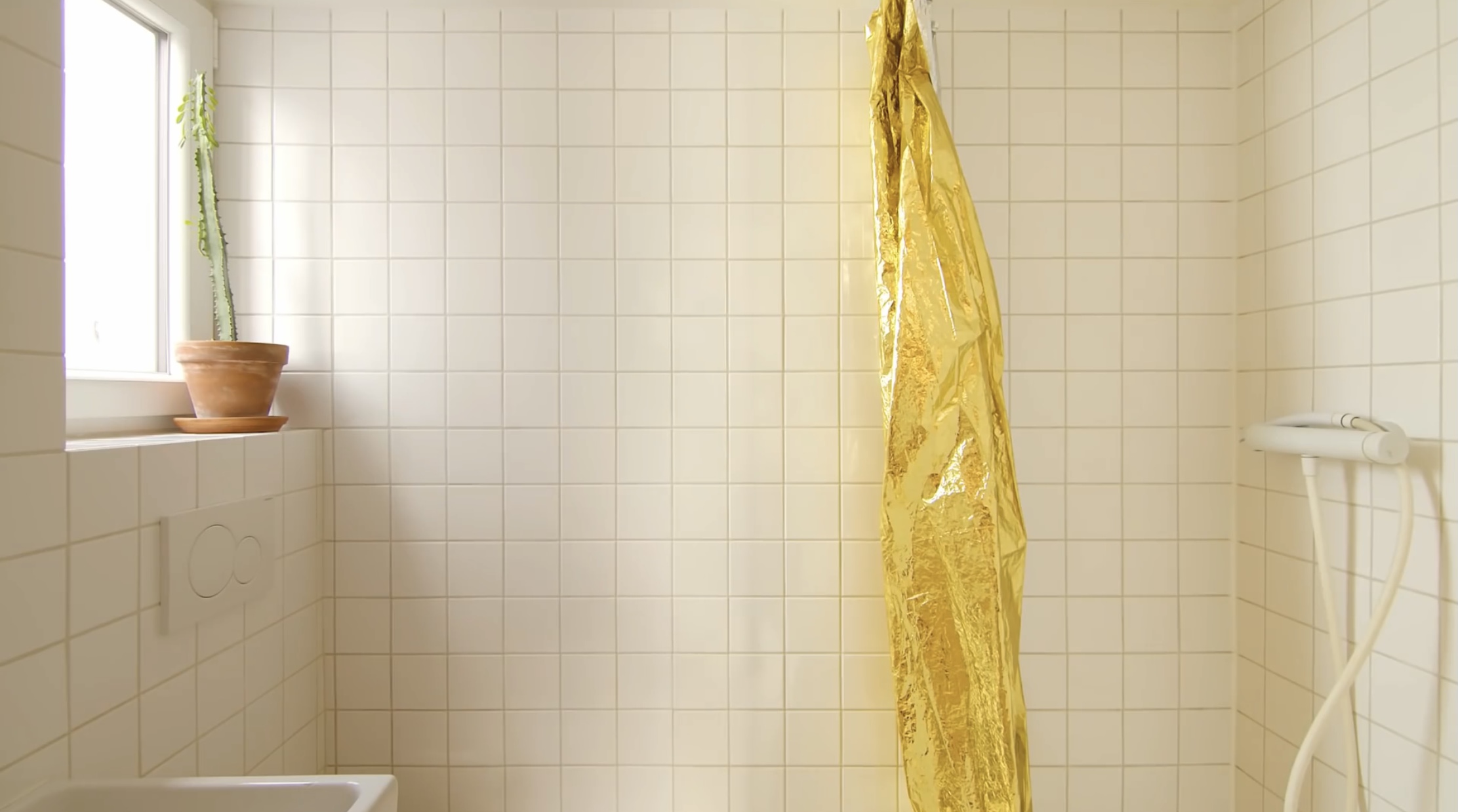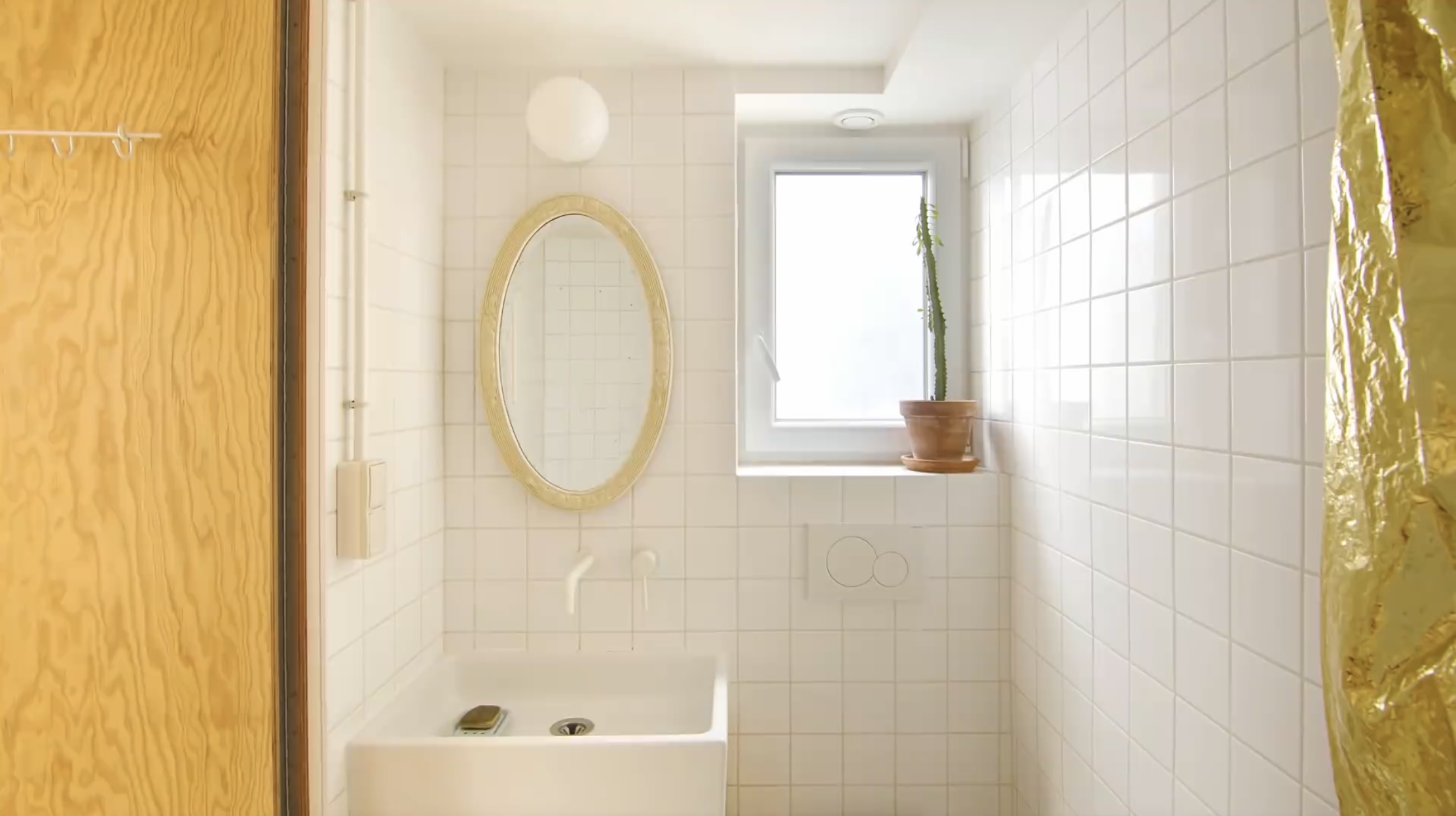 좁은 공간을 넓게 보이기 위해 흰색 타일과 수전 모두 화이트로 통일시켰네요. 샤워부스를 따로 만들기 어려운 공간으로 상단에 봉을 설치하여 샤워 커튼을 달아주었습니다. 금색 샤워 커튼 하나로 분위기가 색다르게 연출되네요.